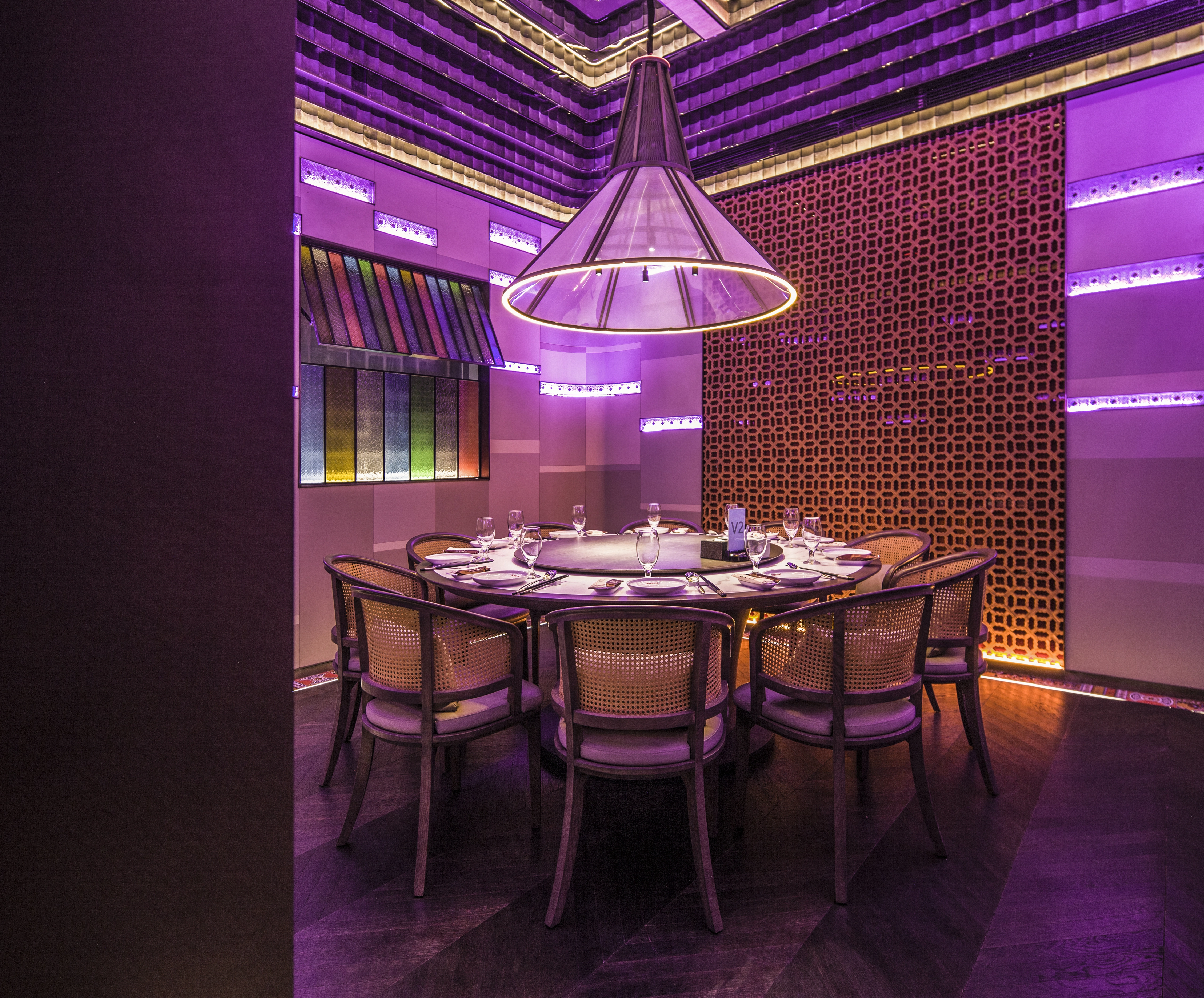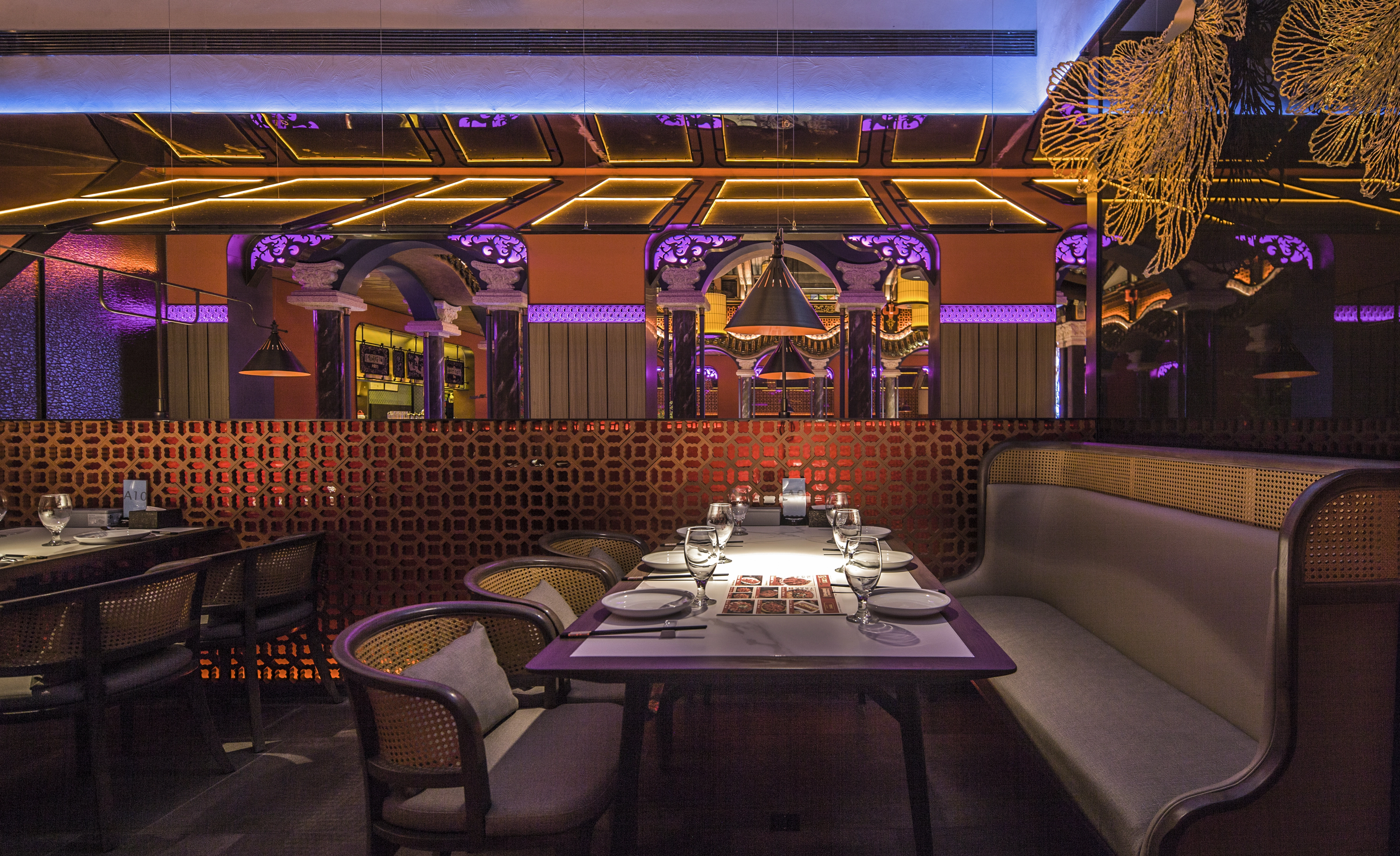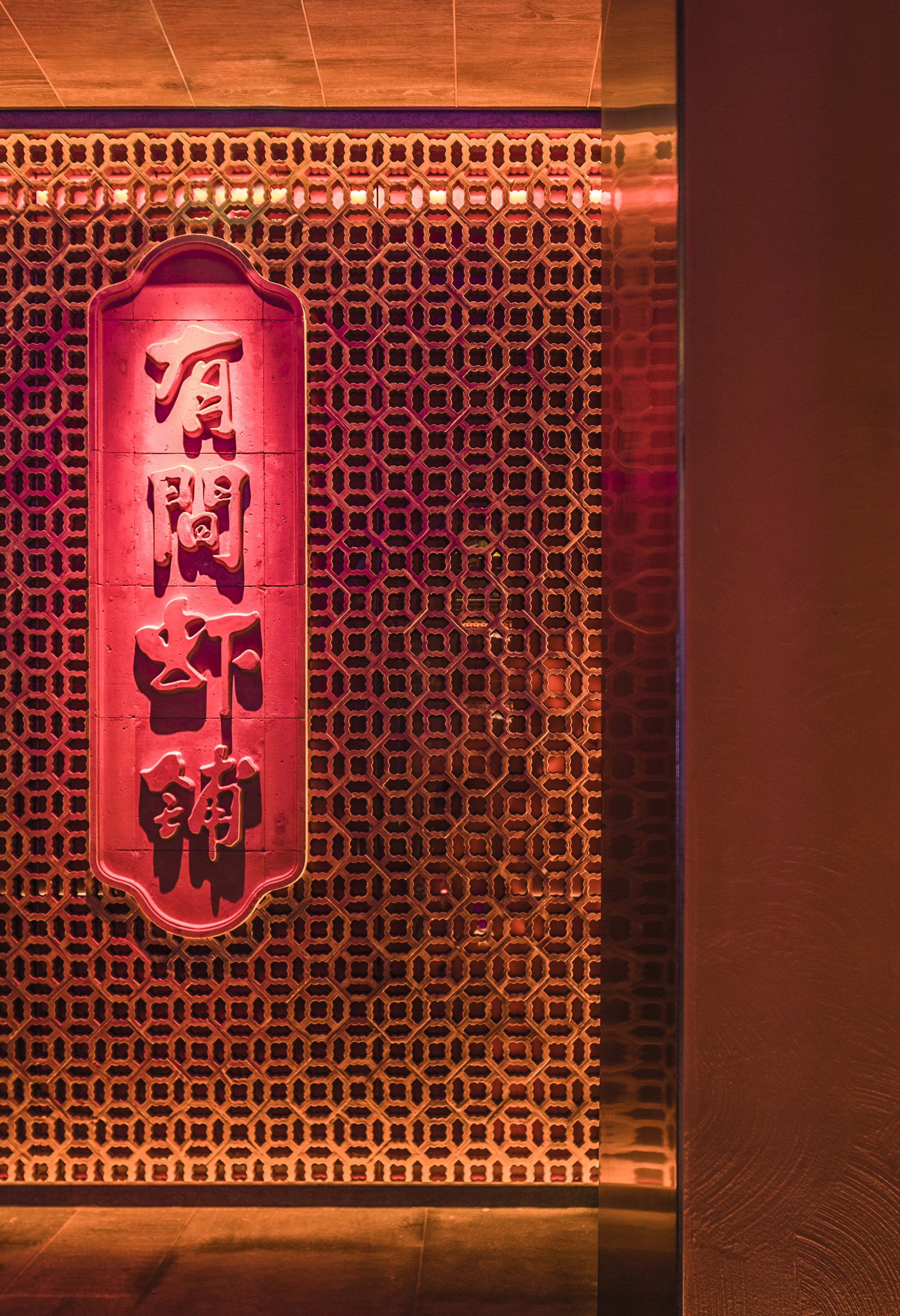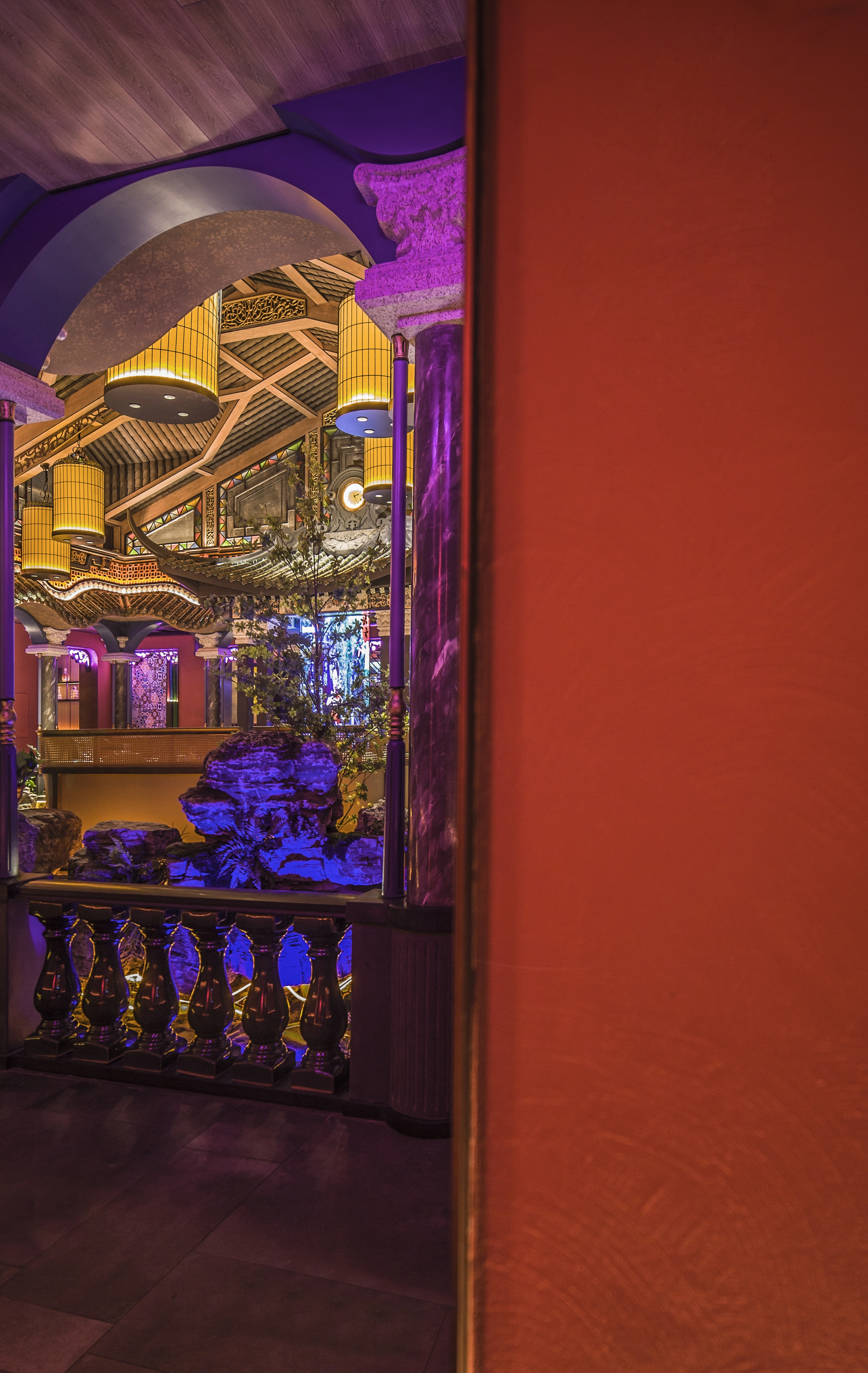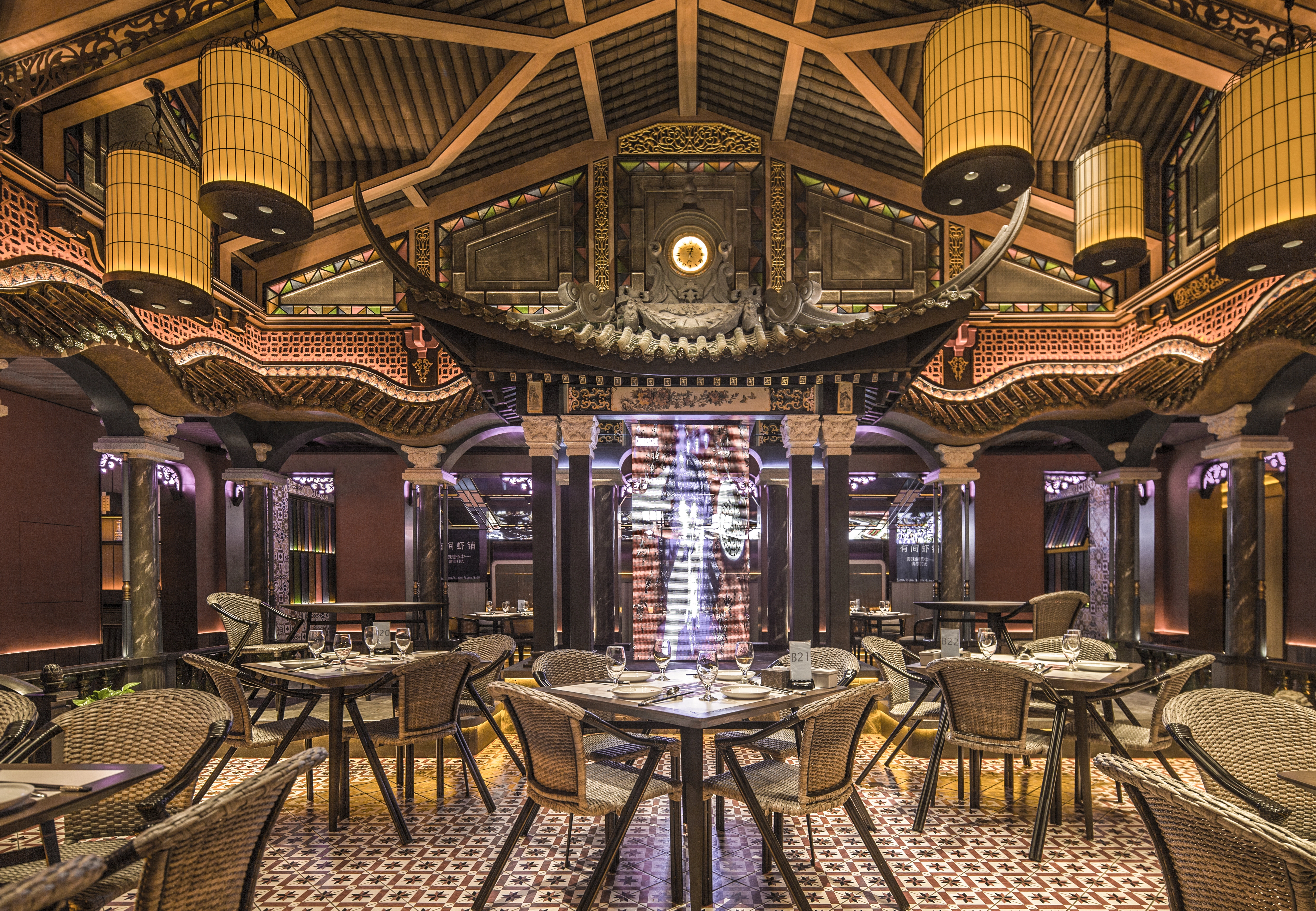 中央四合院为该设计最主要的区域,挑高的彩窗、西洋与东方主题相呼应,中式的材料及色彩与西式的比例相交融,环廊的周围有山水、石材、园林的中式手法,与民国的鸟笼、西式仿古电扇灯和时钟日月同辉。泻水、鸟鸣、勾画出往昔的时尚喧嚣,虾红色的墙面与砖花扣出了空间功能的主题——“有间虾铺”。当有微风拂过,中式的舞台上渗透了电子屏上放映的艺术画面,映衬着两侧的餐区,就像是南洋之滨的一个美丽的傍晚... ...