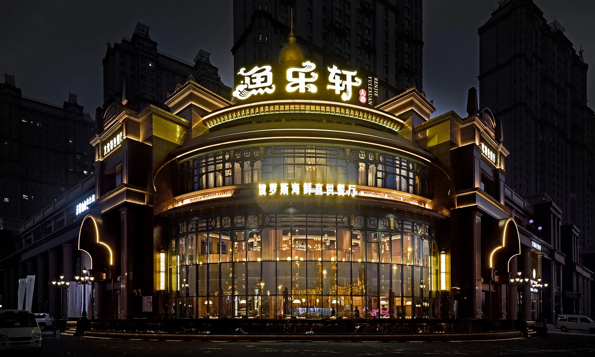 鱼乐轩——俄罗斯海鲜直供餐厅,是一家主营俄罗斯帝王蟹与龙虾的文化旅游主题餐厅。项目位于哈尔滨群力友谊西路和景江西路交汇处。作为离俄罗斯最近的省会城市,得天独厚的地理位置使其立足于无国界海鲜直供,保证了原料的新鲜。整体风格并没有完全以俄式风格为主体,而是在东方美学的基础上加以海洋的元素,形成具有专属性的风格空间。