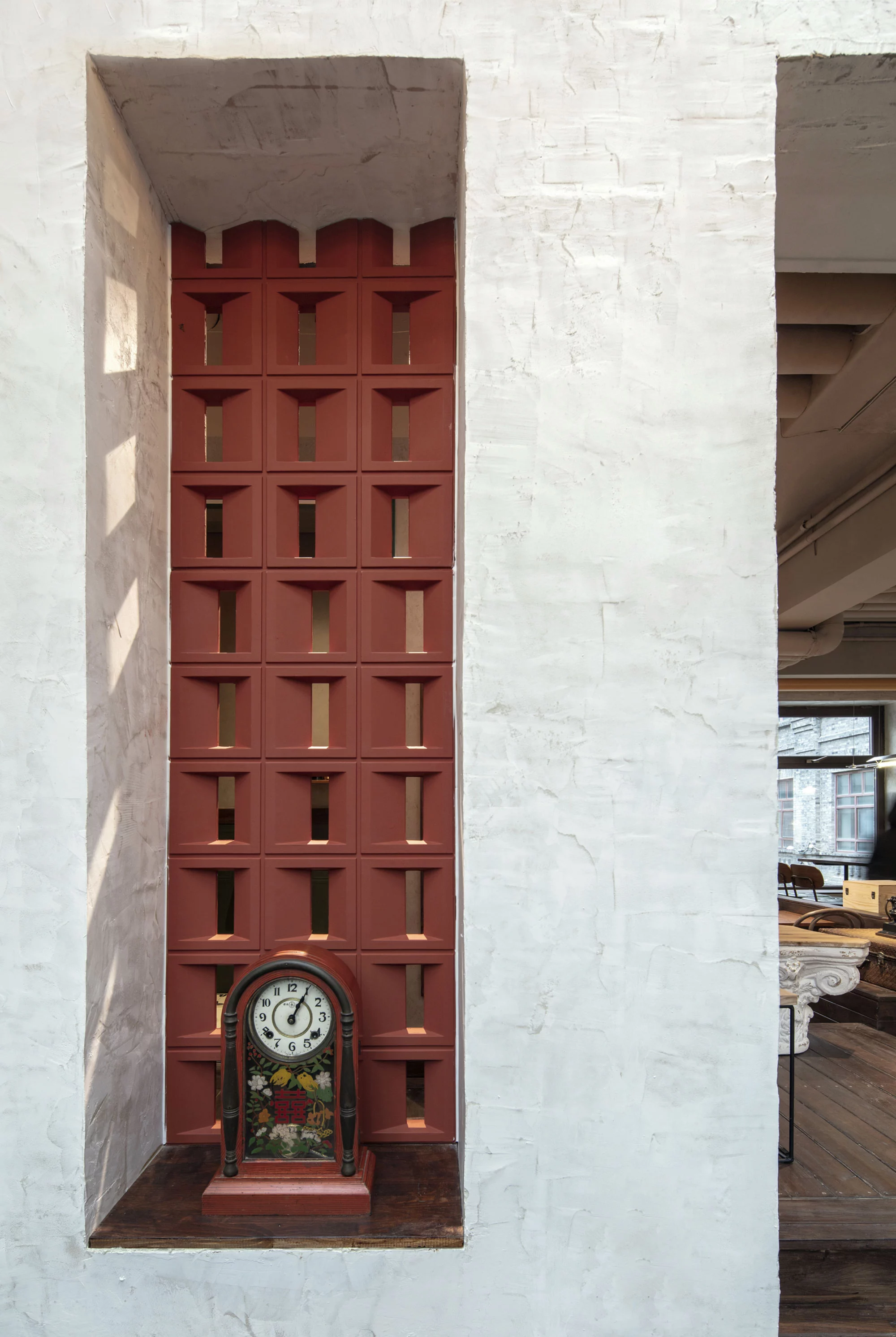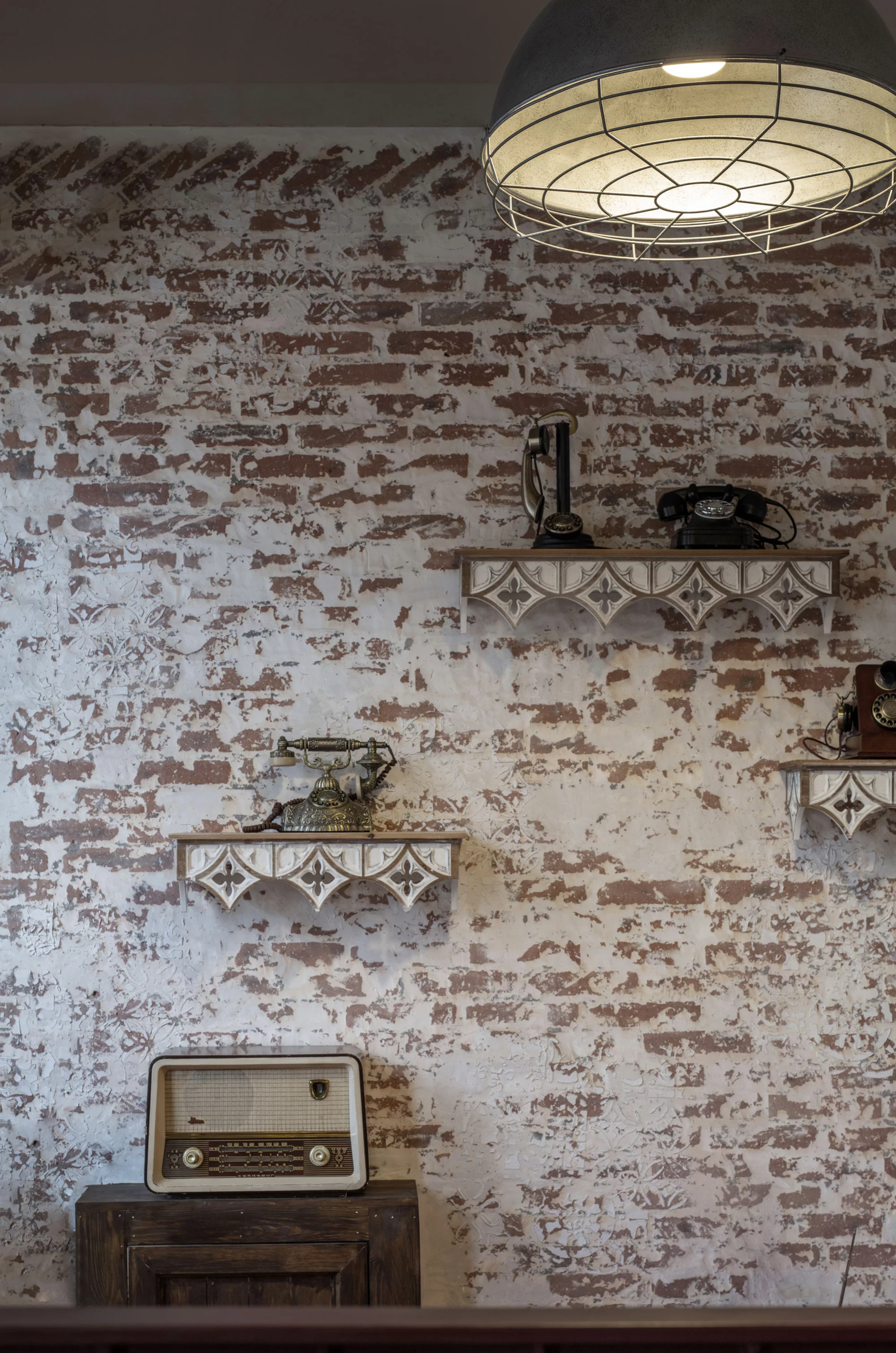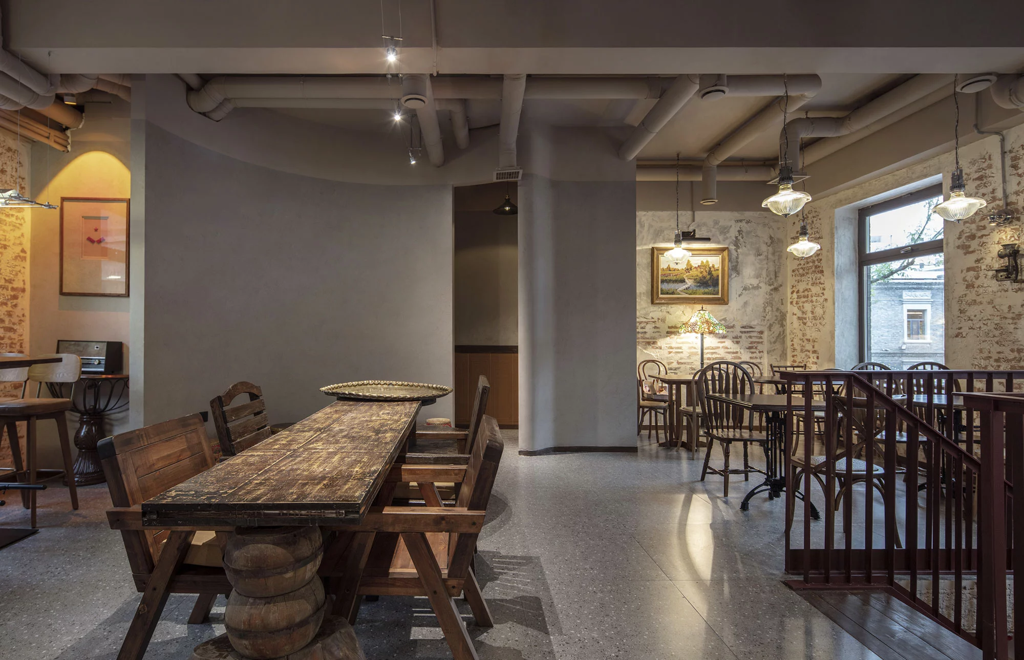 可以铭记的味道划过鼻尖、味蕾,可以触摸的记忆掺于红砖、灰墙,购物区至用餐区楼梯向上背景墙由灰石板墙向斑驳砖墙过渡,可以从楼梯口窥见二楼墙面陈设设计,两片区域自然衔接。用餐区依照工厂的意象进行设计,吊顶和围墙在原始建筑上进行了轻量化干预,墙面斑驳纹理及吊顶投射下的暖黄光亮,仿若夹杂着繁华与颓靡,流淌着热血与峥嵘,历史的厚重感扑面而来。