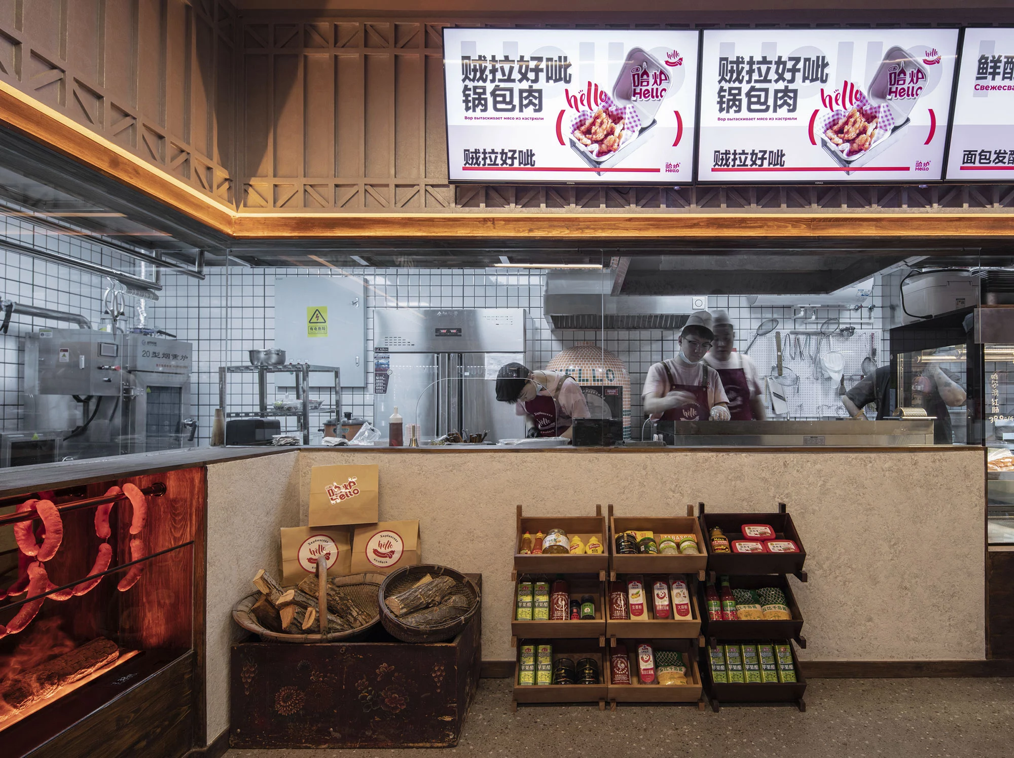 哈尔滨的味道是复杂的,它是本地孕育的锅包肉、铁锅炖的味道,也是随着中东铁路一路轰隆而来的红肠、格瓦斯的味道。哈炉红肠工厂体验店集哈尔滨味道于一身,从工厂主题汲取设计元素,青灰色沿袭中华巴洛克主街风格,自沿街外立面延伸到室内购物区及用餐区,作为基础色调串连起体验店各功能分区,采用朱红色作为室内外联通的钥匙及购物区与用餐区场景是转换的阶梯,传达出空间属性与秩序感。
