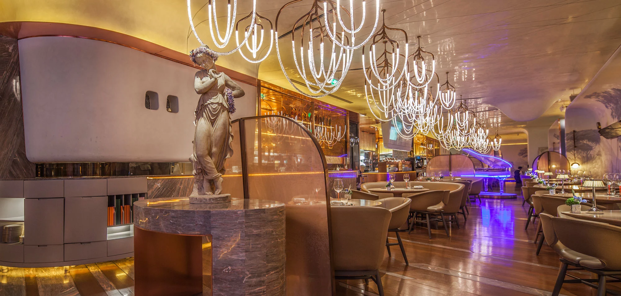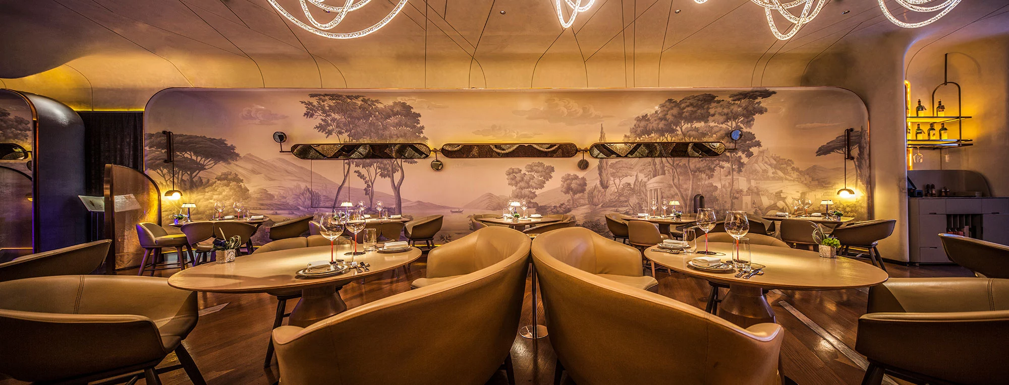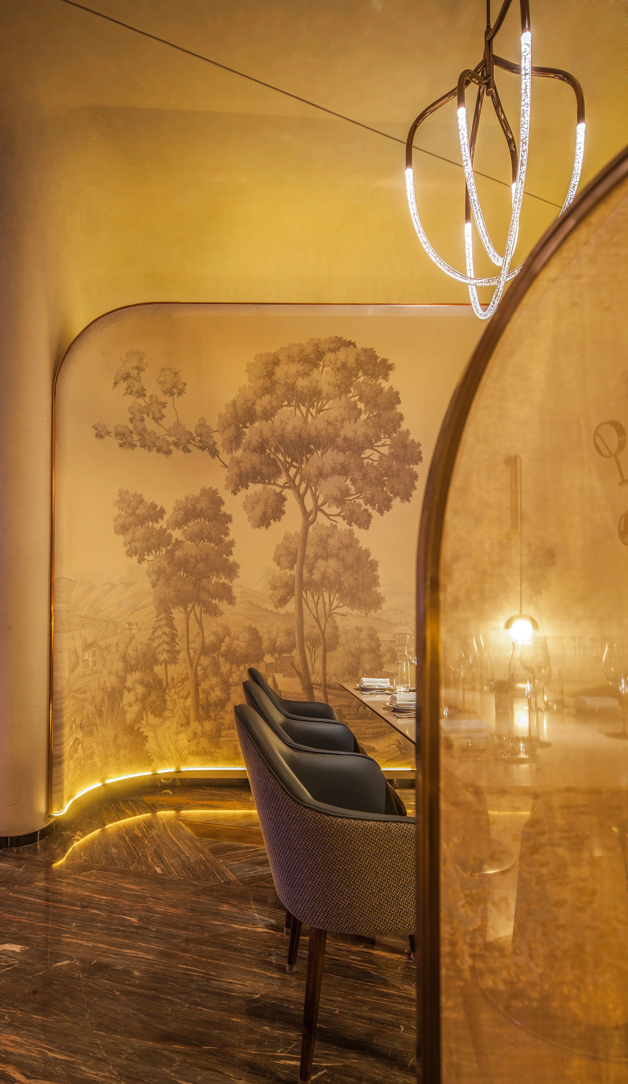 蜿蜒轻盈的浅色系凹线,如环绕的曲水引食客探索,波浪似的大理石纹理,用坚硬的材质诉说流动的美感。