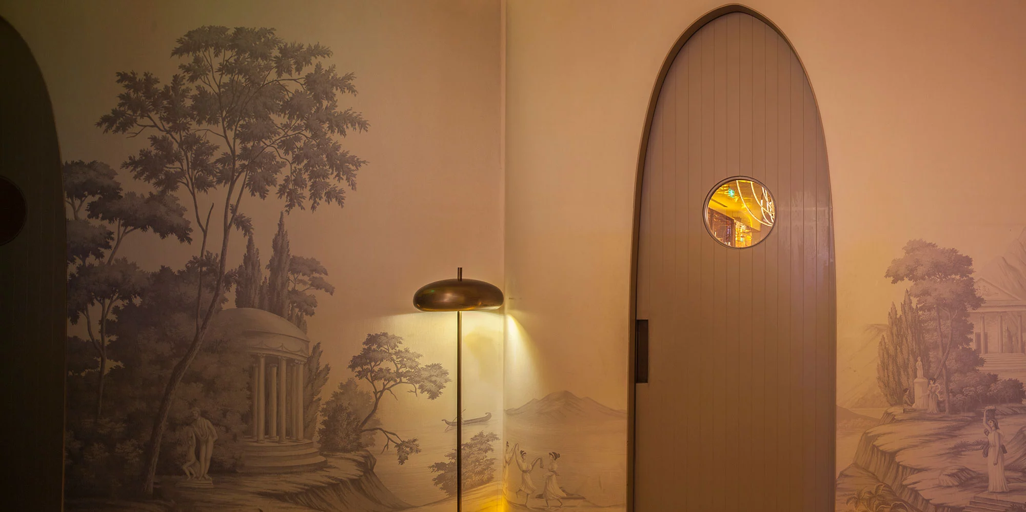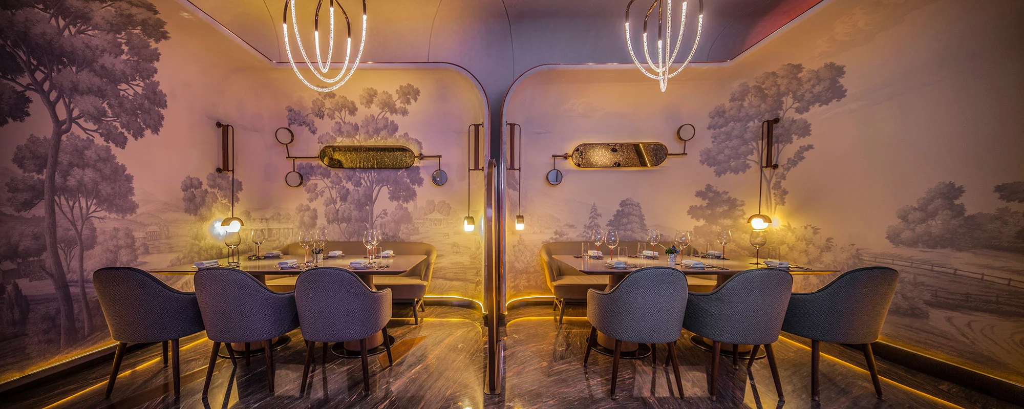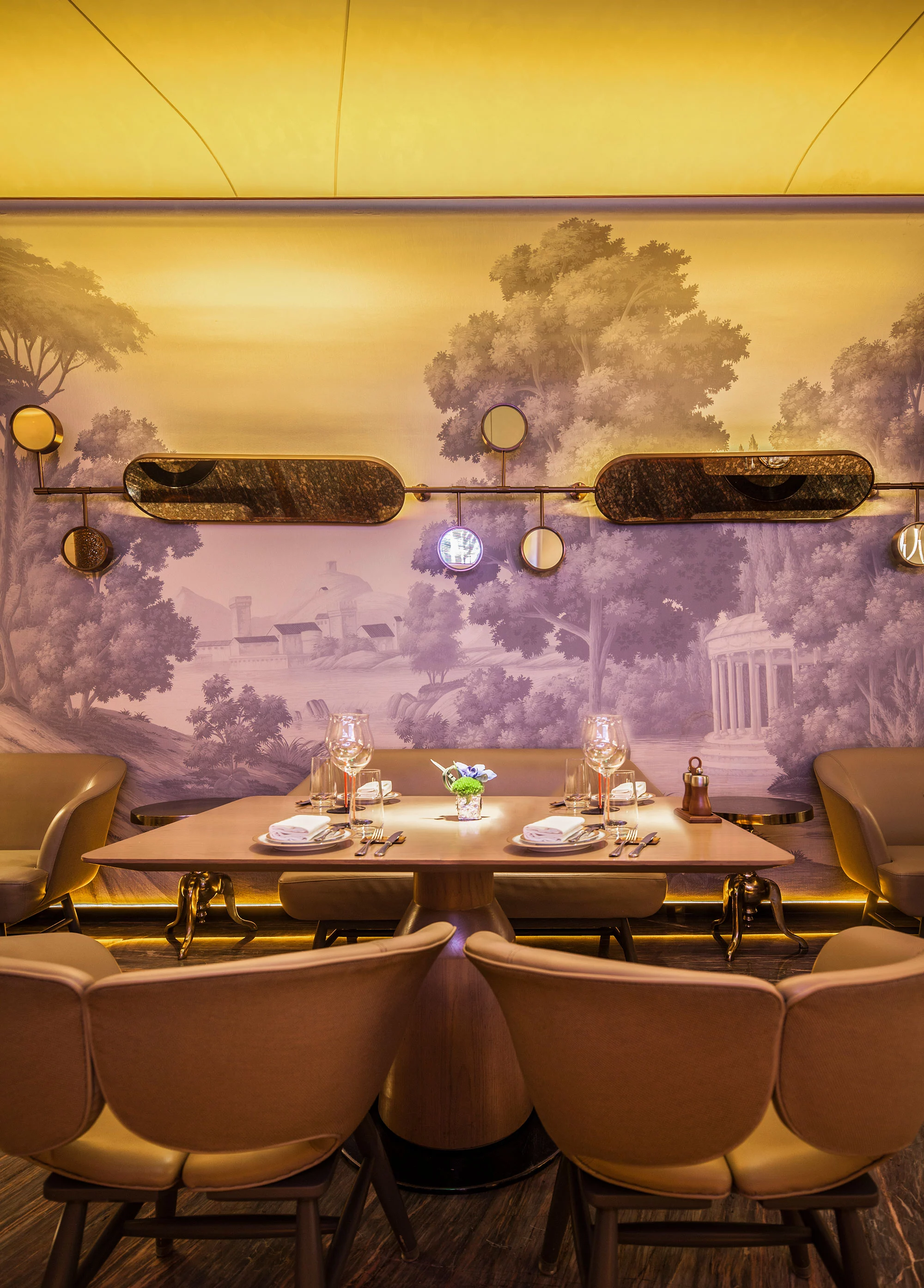 蜿蜒轻盈的浅色系凹线,如环绕的曲水引食客探索,波浪似的大理石纹理,用坚硬的材质诉说流动的美感。