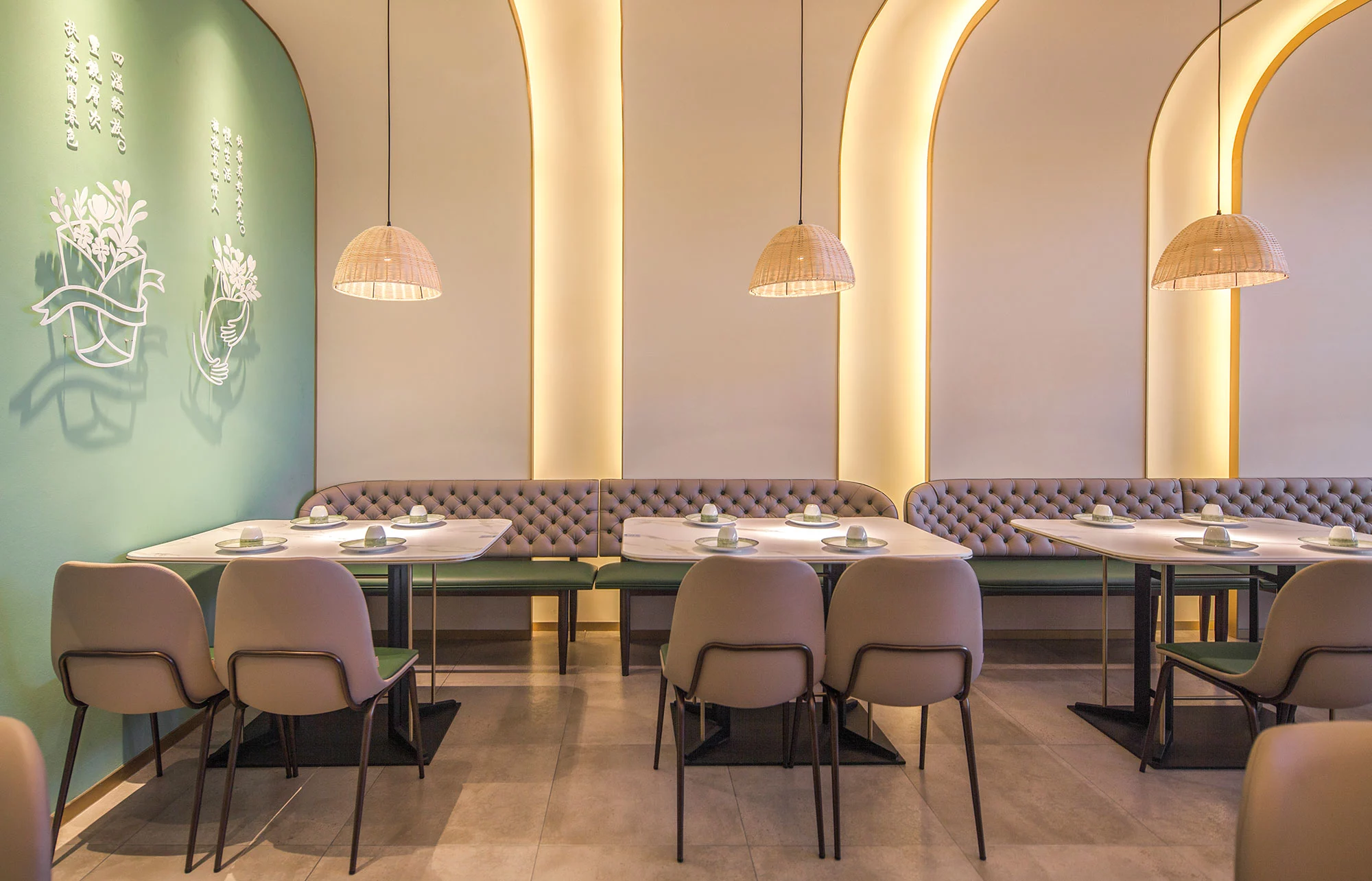 前场为开放式设计并配有绿化隔断,在保障客人用餐区域舒适的前提下也让空间更灵动。明档居中三面通透用餐区围绕布置可以达到更好的展示效果。餐厅靠通道一侧配有悬窗,在不影响室内灯光环境下将商场环境与室内互相融合。