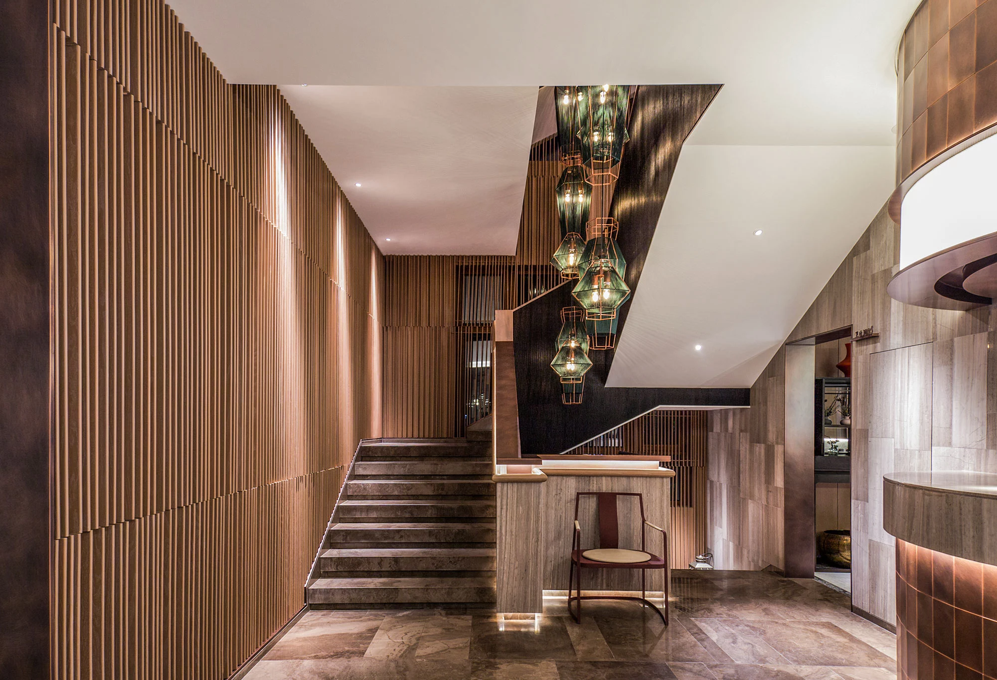 看似肃穆静谧的空间中,隐隐藏匿着玄机,传统集会的前奏,被现代手法重新演绎,自然纹理木条雕琢的线条笔直刚硬,让刚与柔绝妙融合。穿过层叠遮掩,映入眼帘的中庭水景,就是繁华的盛夏,展一副浓墨重彩的写意丹青。
