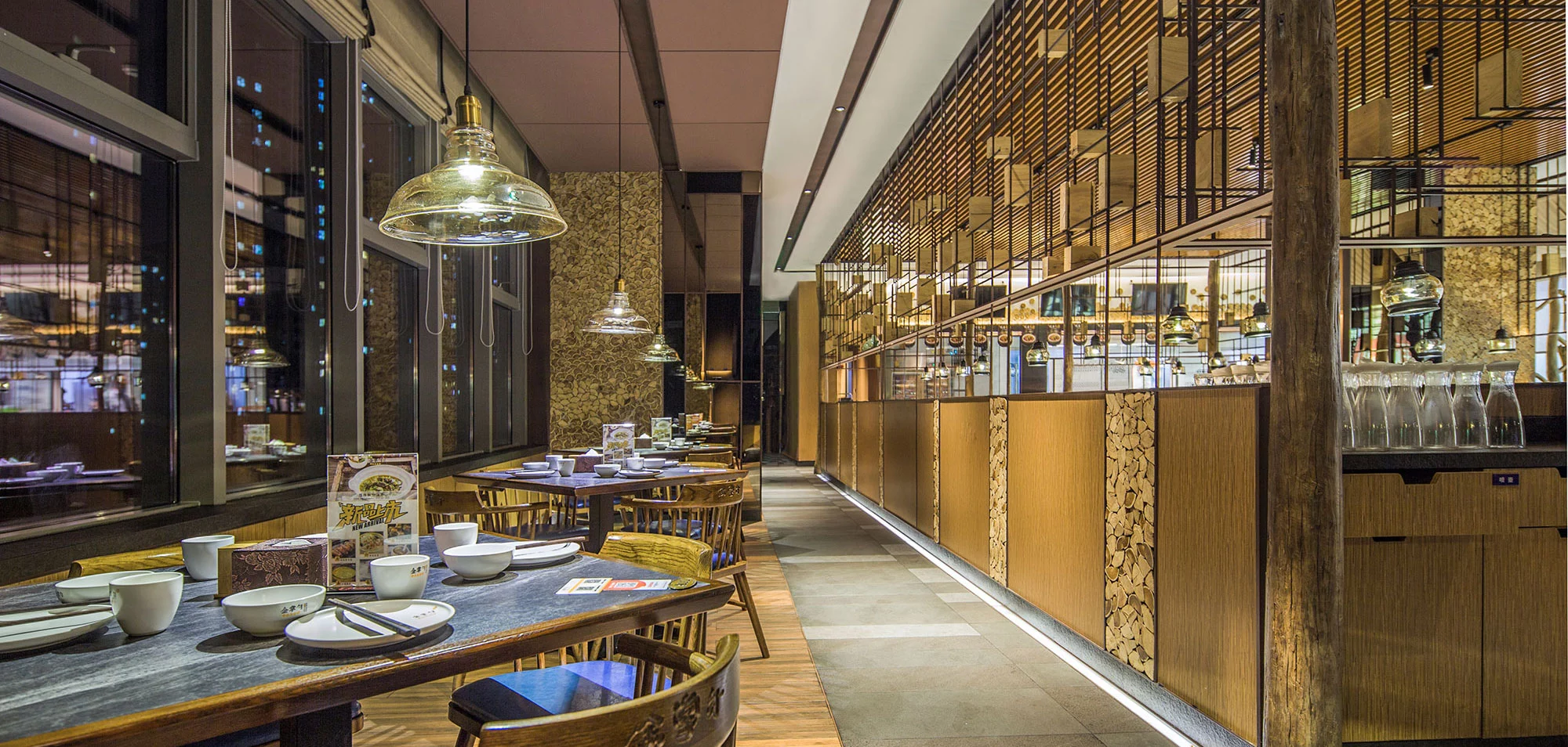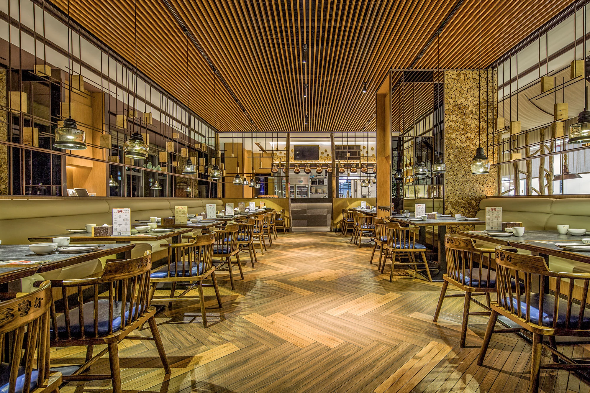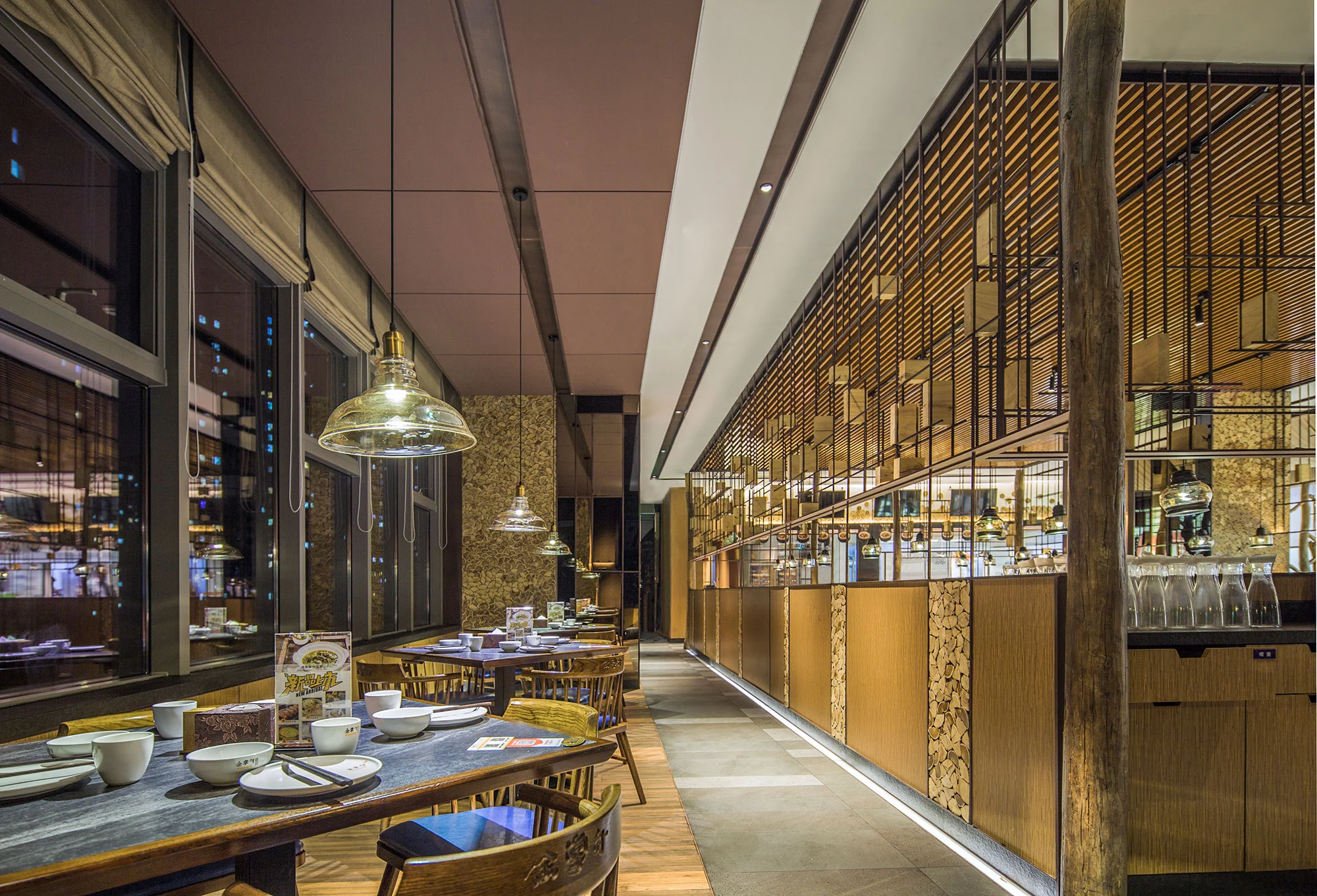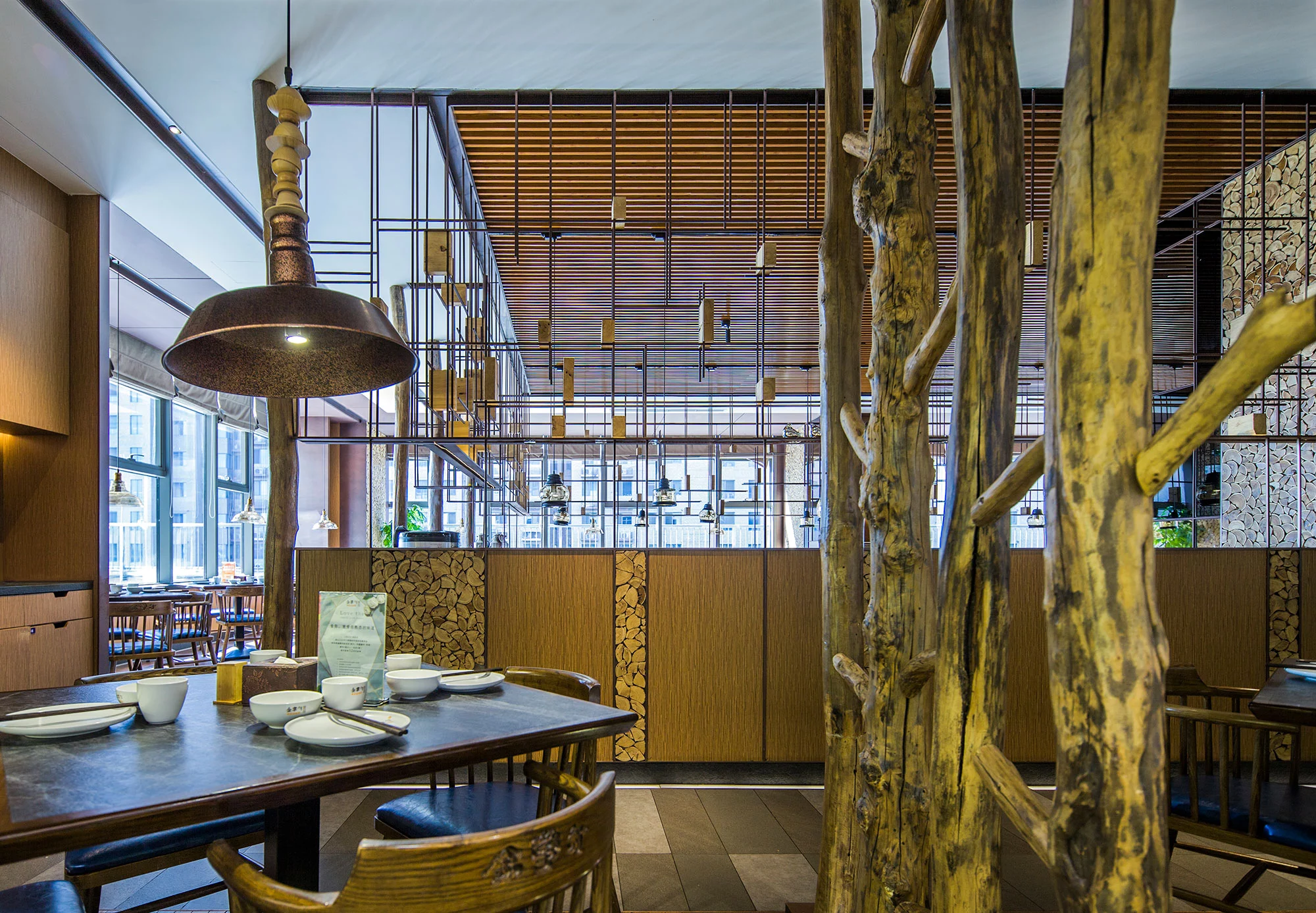 内部为一个整体通透的空间,采用金属编织的造型隔断,将区域进行了有序的划分,增加了空间的互动性,通过冰雪图案与空间中的原木搭配,突出北方风格的就餐环境。