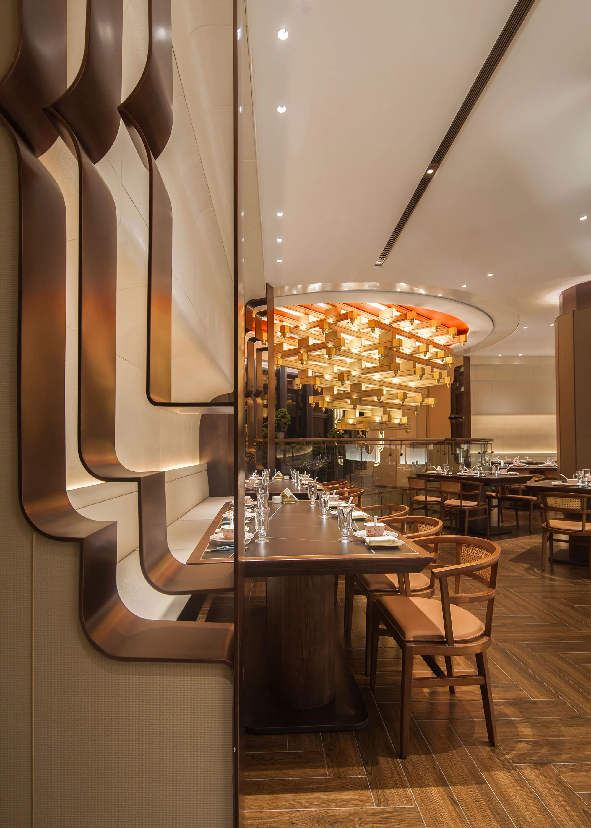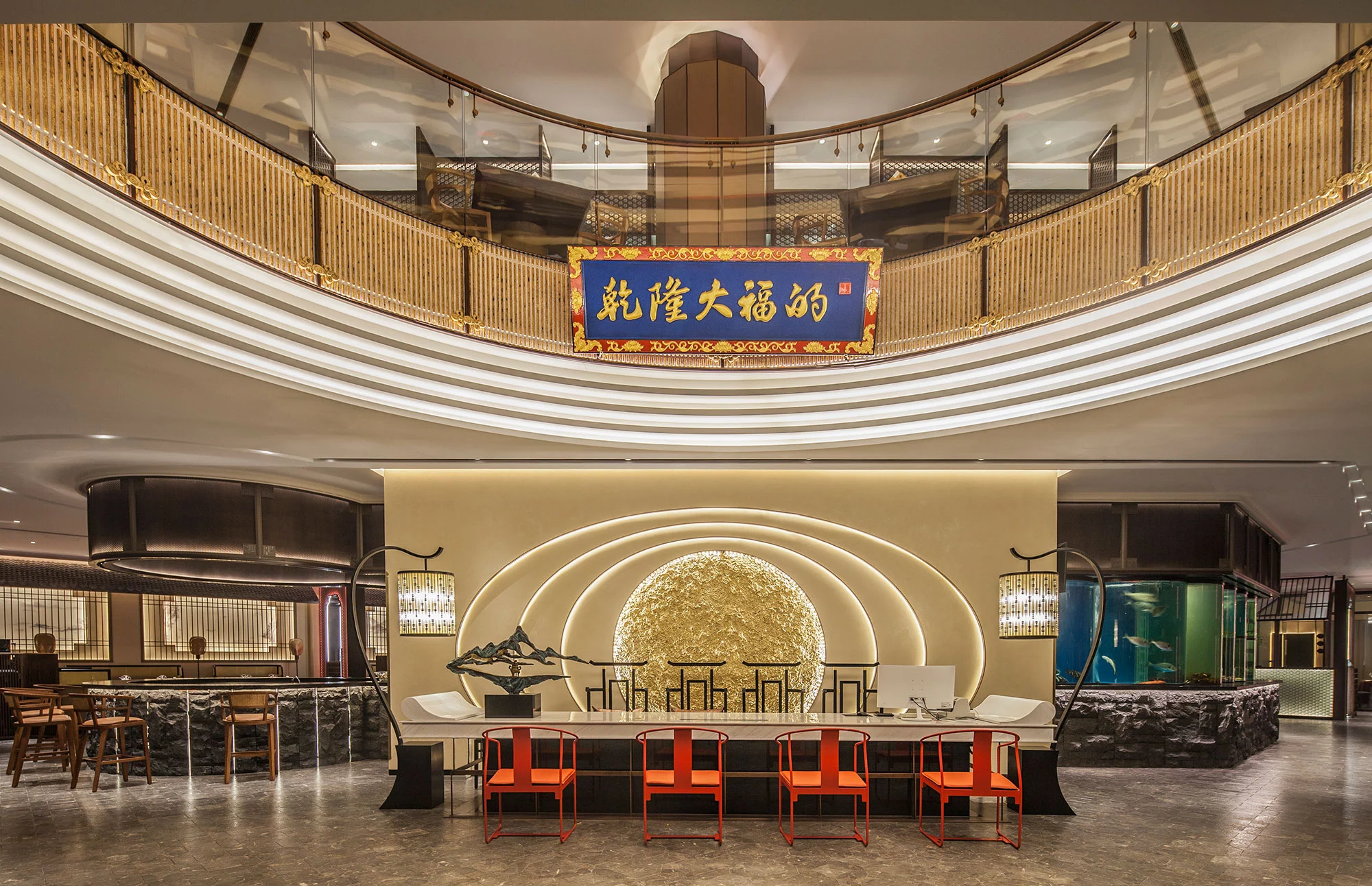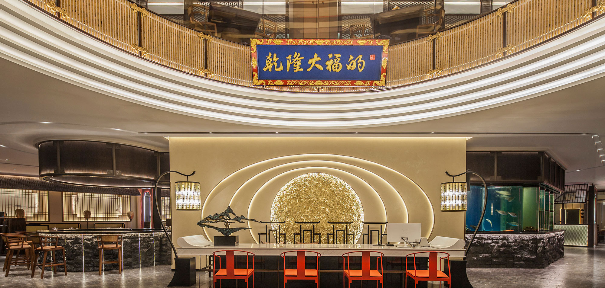 进入酒楼的第一空间为重置的跨越两层的共享空间,令人眼前豁然开朗,正中间的招牌与天花上的木质架构,为酒楼赋予了一道厚重的文化底色。