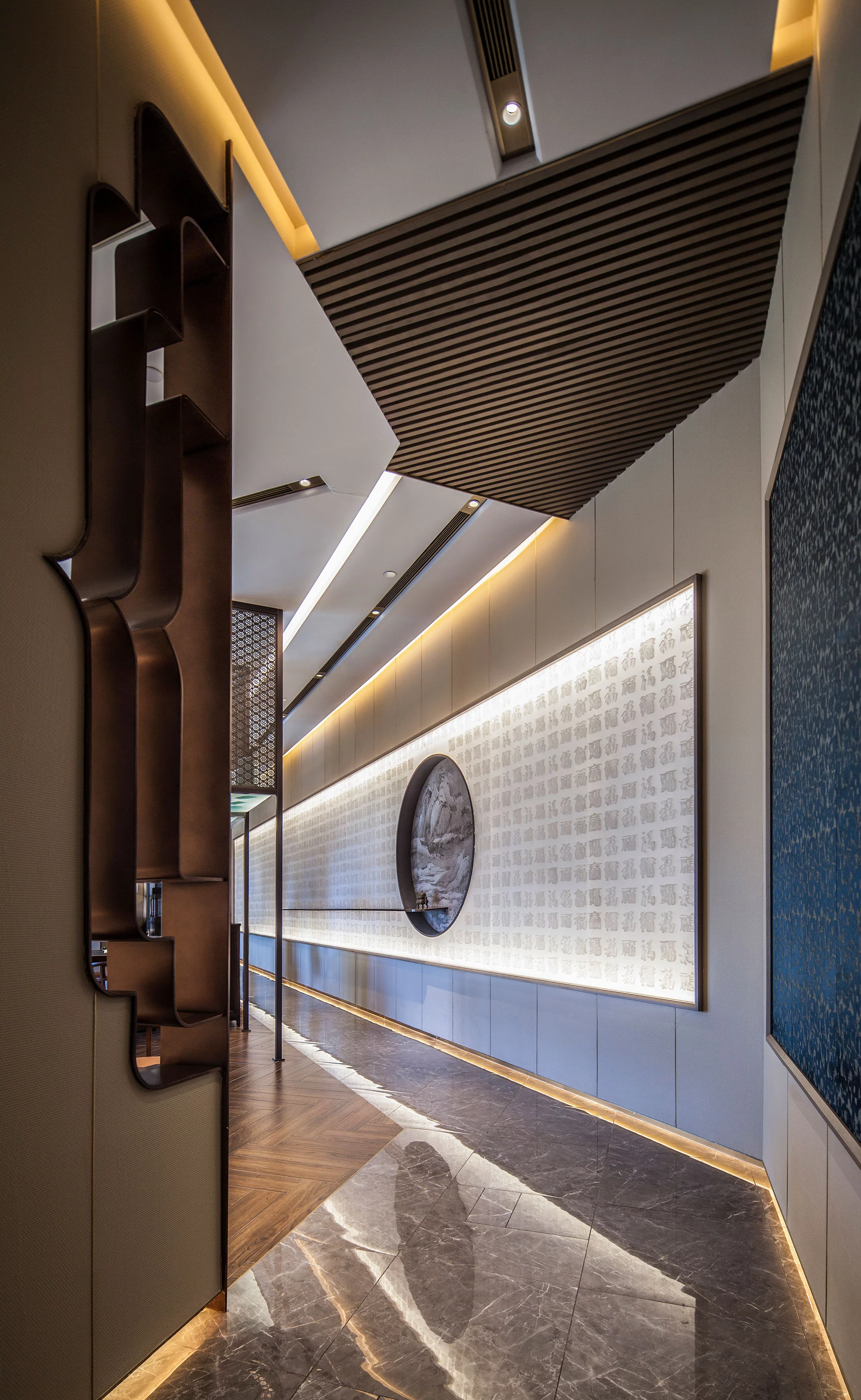 环形动线的设置使空间更加流动、顺畅,便于客商的通行。中式的花纹简约中带着古典的韵味。