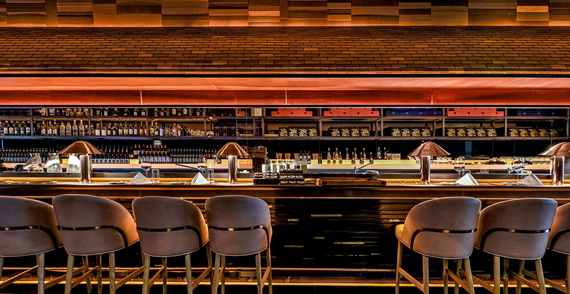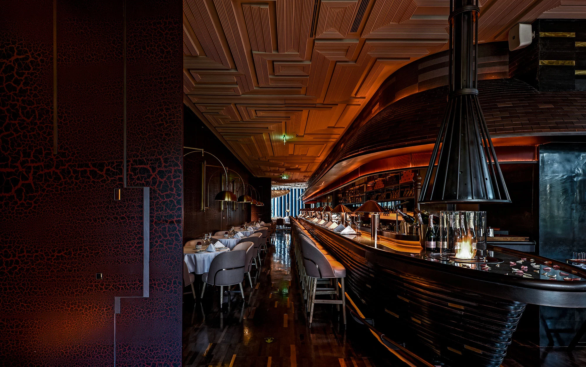 在长安街的牛排家店内,有着与其一样个性的长长的“大吧台”,灰色的块块墙面,仿佛是昔日京城城墙上的灰砖,而朱红的折门又怎能不想起走入京城时的大门。这里可能会有第一次来北京的远方客人,也可能有在这里生活多年的故乡人,但我想在杯盘之间美食的同时或许也会有空间带来的感受与提示,那就是用东方的美学价值来诠释生活,使我们更加热爱自己的文化……