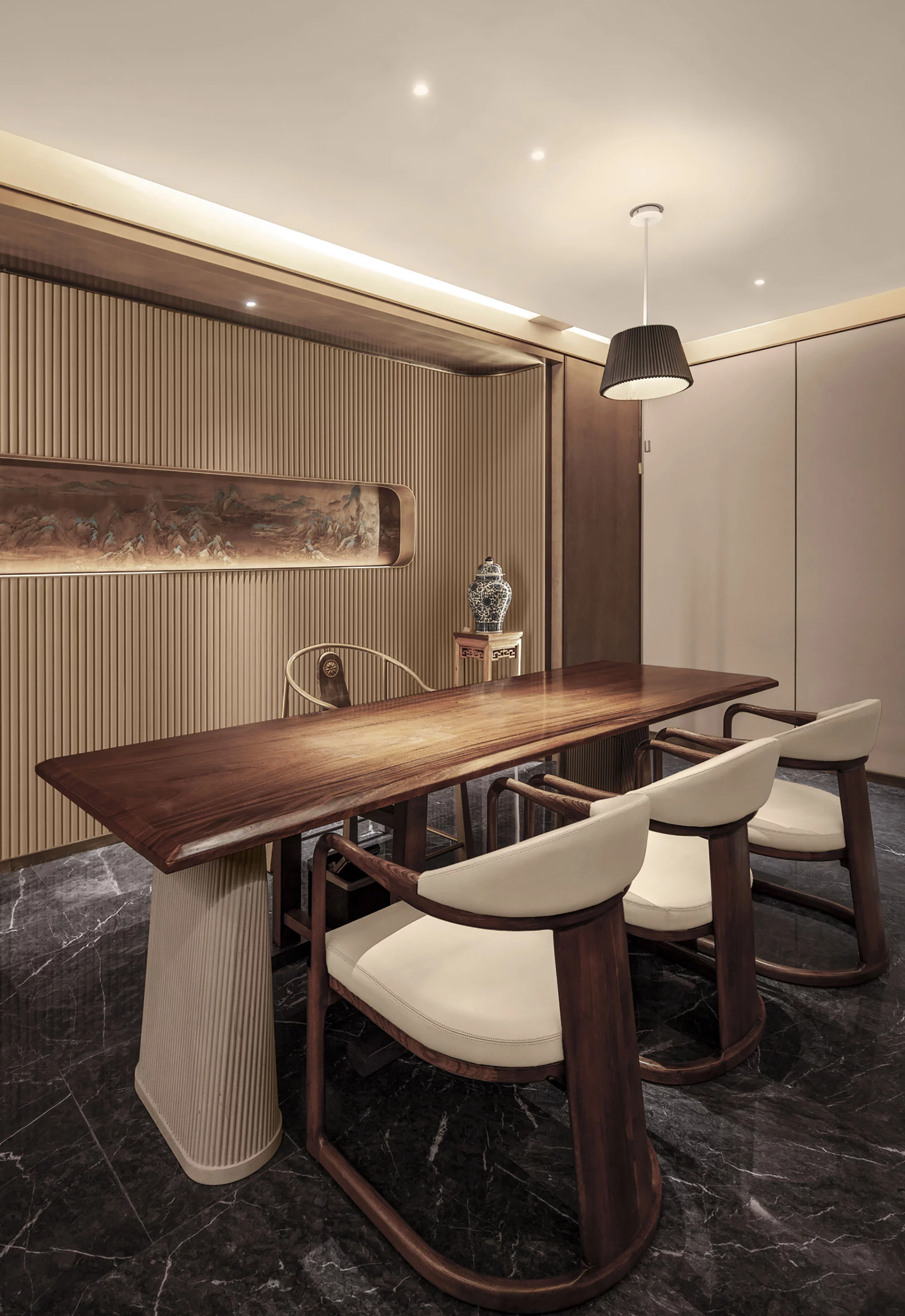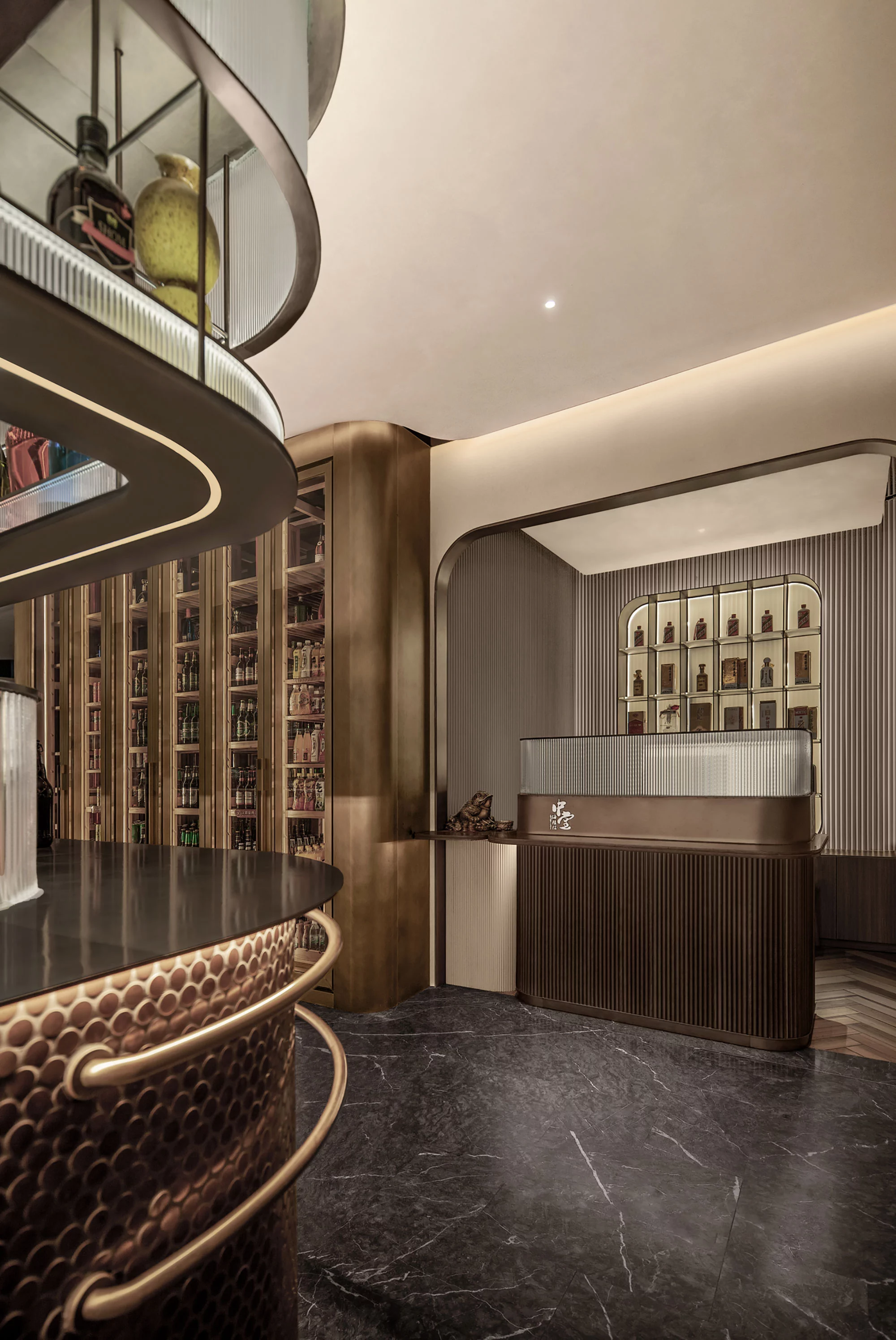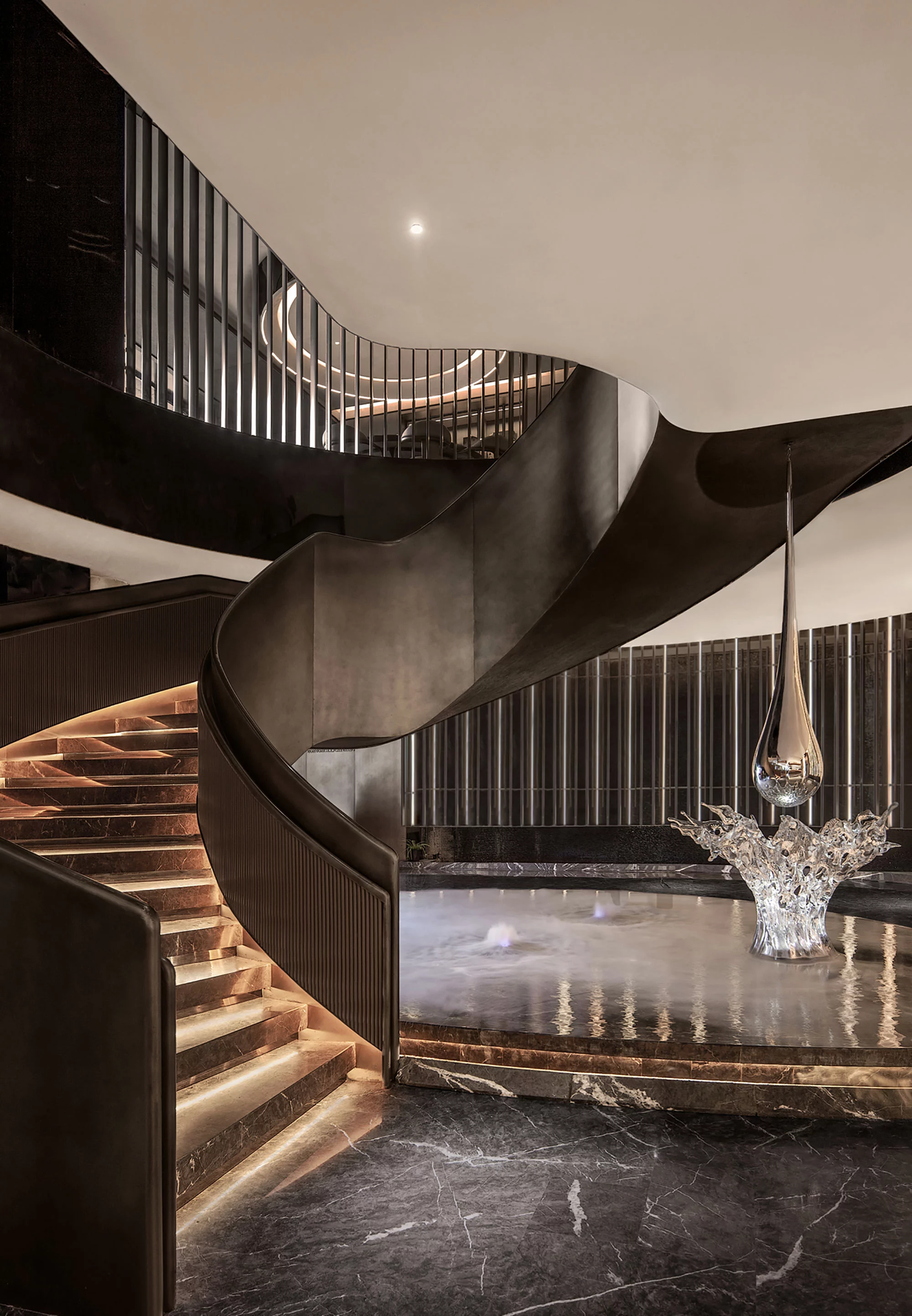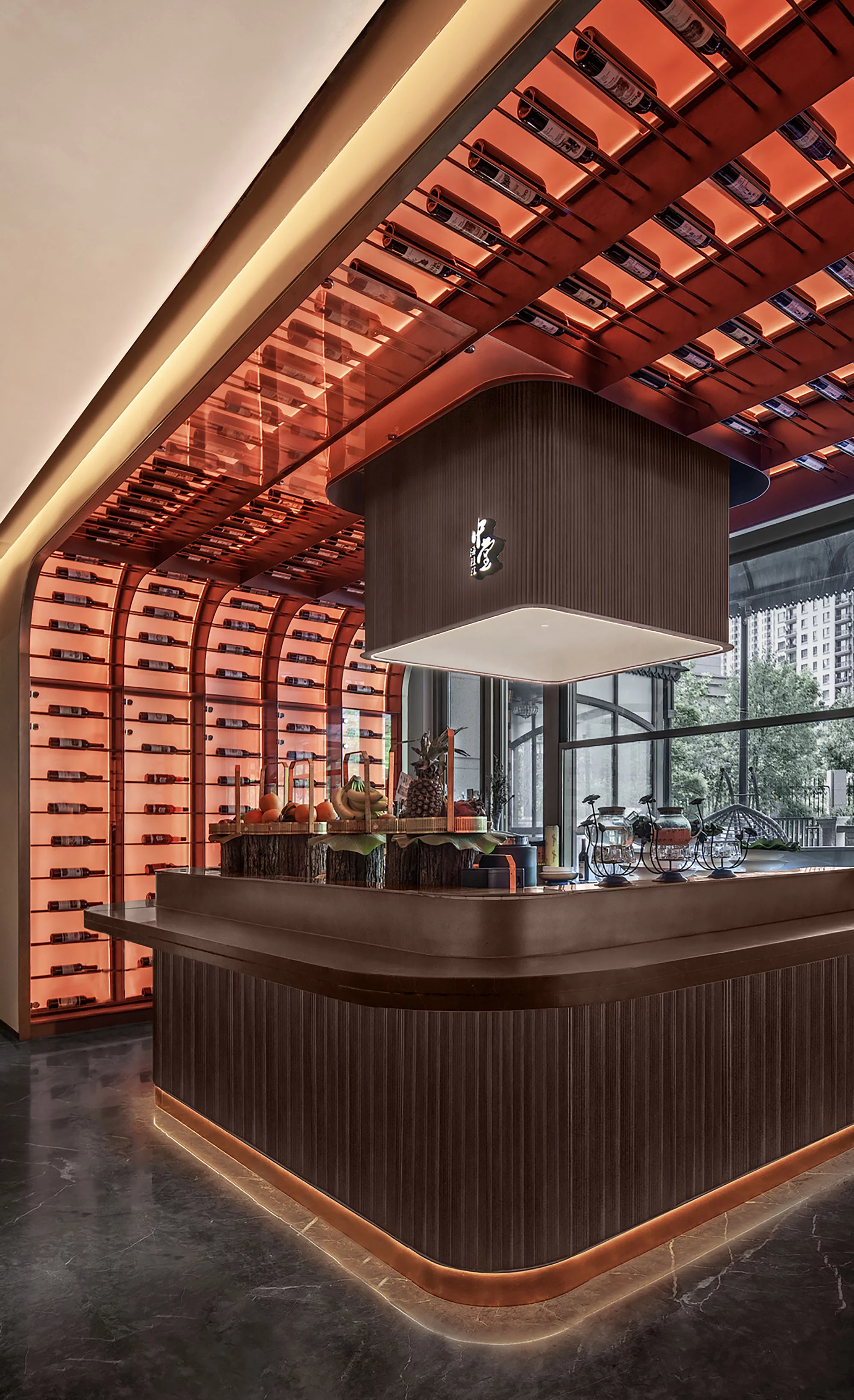 步入餐厅迎面所见整面墙水幕景观,水流自上而下汇集到底部后再延伸至楼梯底部的水池,不仅具备实用性,更增添了空间的灵动性。明档区域将就餐区分为两个部分,既方便服务又增加了私密性。后入口的水吧台作为一层的亮点,背面整面的玻璃窗不尽可以将夕阳的余辉带入室内,夏季还可整体升降让室内外融为一体。