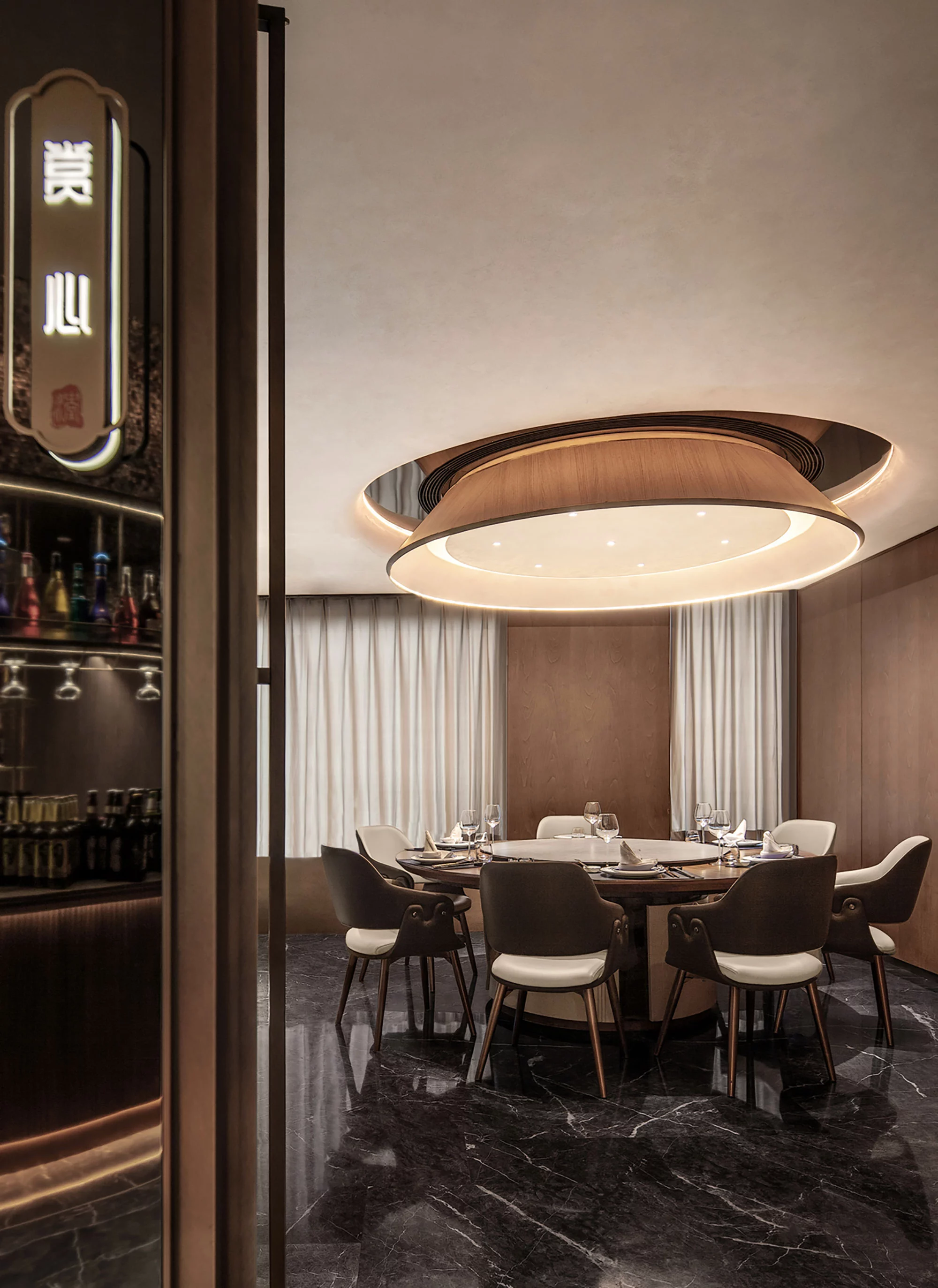 二层空间所有的墙面转折和天花棚角都使用了弧形元素,让客人在就餐中好似在海的环抱中,中间区域设有包房和传菜间,形成环形通道,使得动线如湾流般更加流畅。