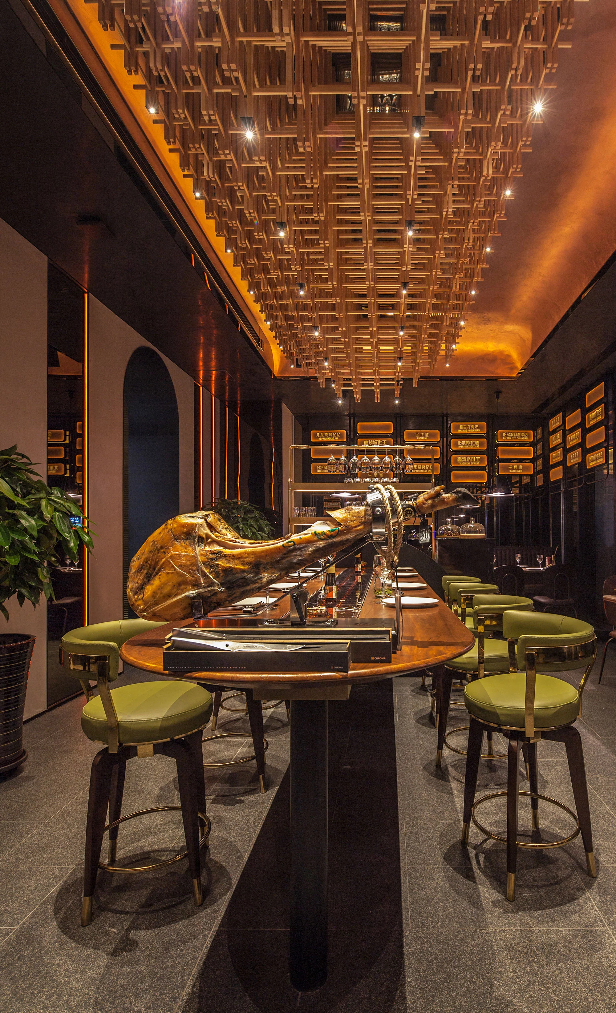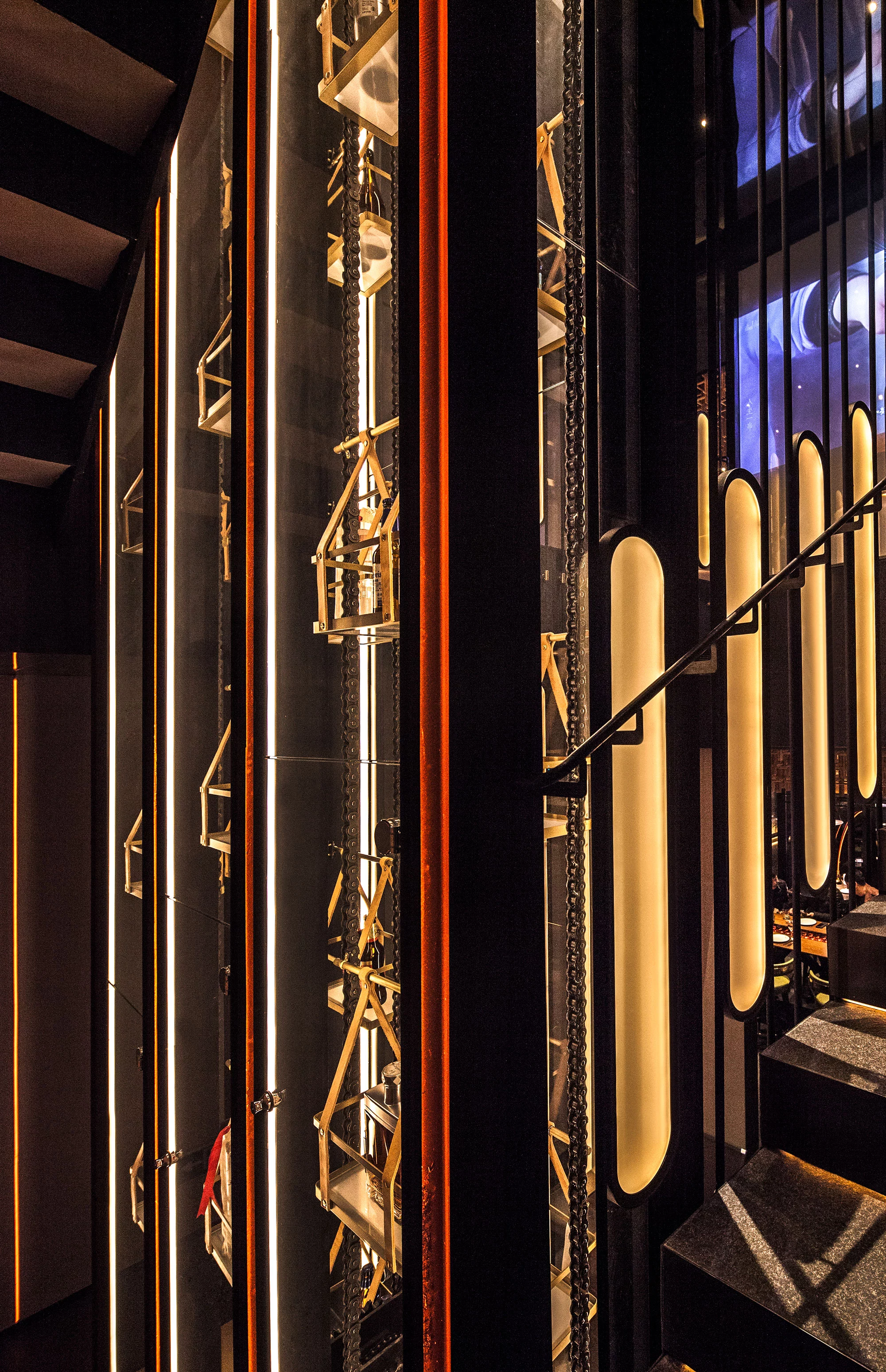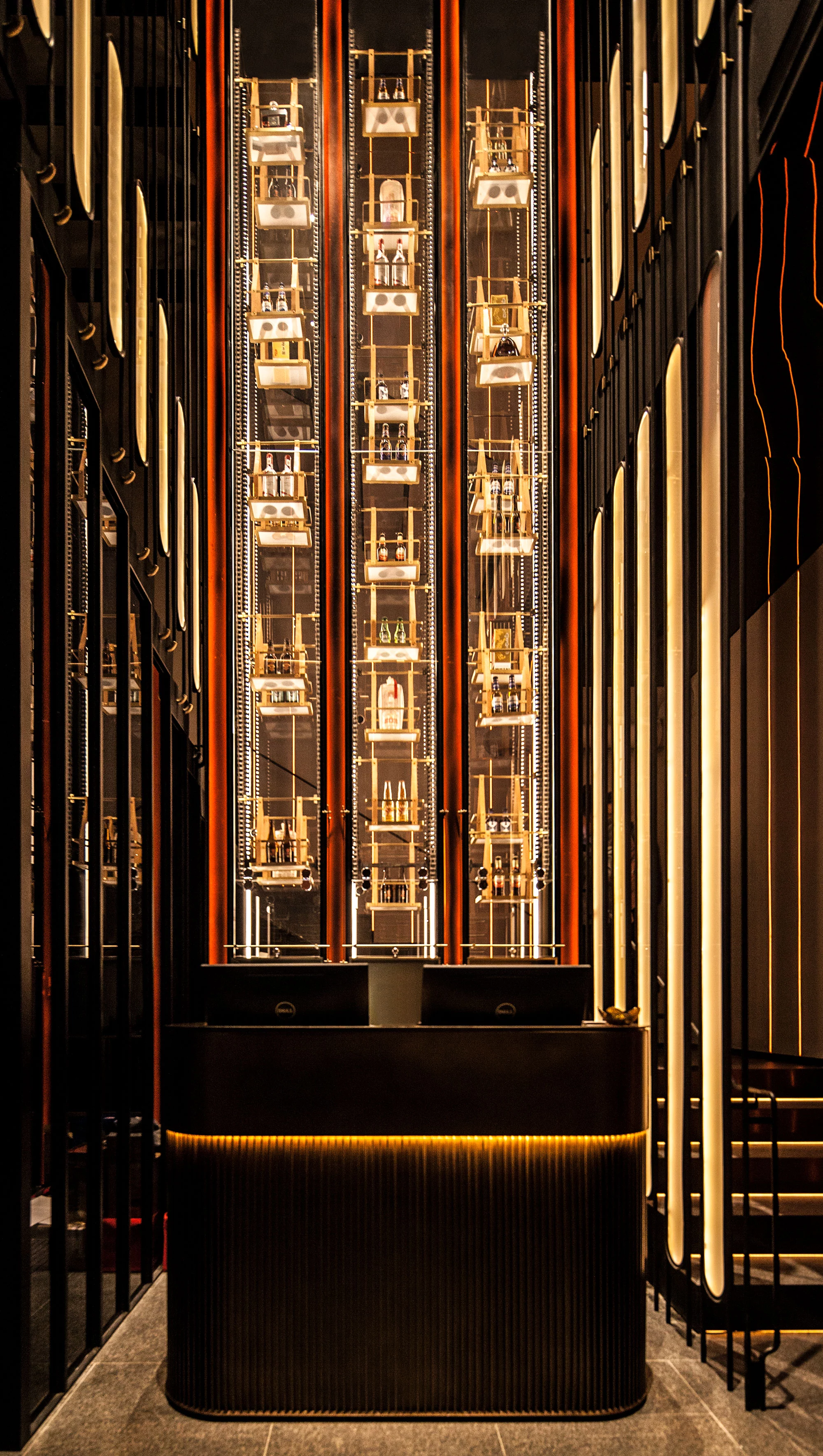 本案运用基本的材料,通过简洁明快的线条使其分块清晰,并富有肌理感;走进室内中心,共享空间中上升至二层的自动升降酒架,能够吸引人们的视线,向上引流;其棚面的镜面反射更加提升了空间的延伸感……