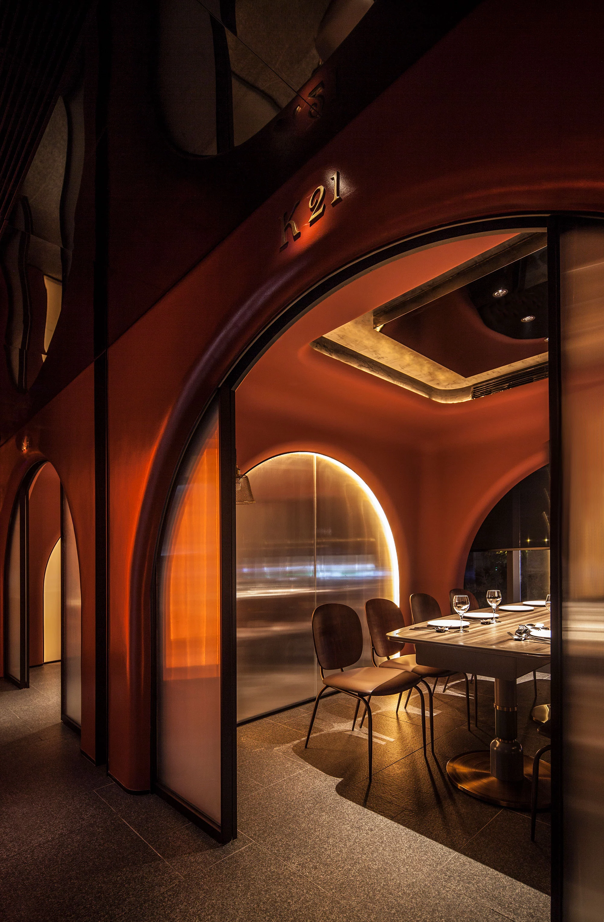 红之典雅,光之幻影;红色与灯光的融合带给人们时尚魔幻的气息;光影与明暗塑造着丰富的色彩层次,呈现细腻的光韵质感;既有沉稳之质,又有流转的温度,一种于平静中暗自涌动的美在空间中流转……