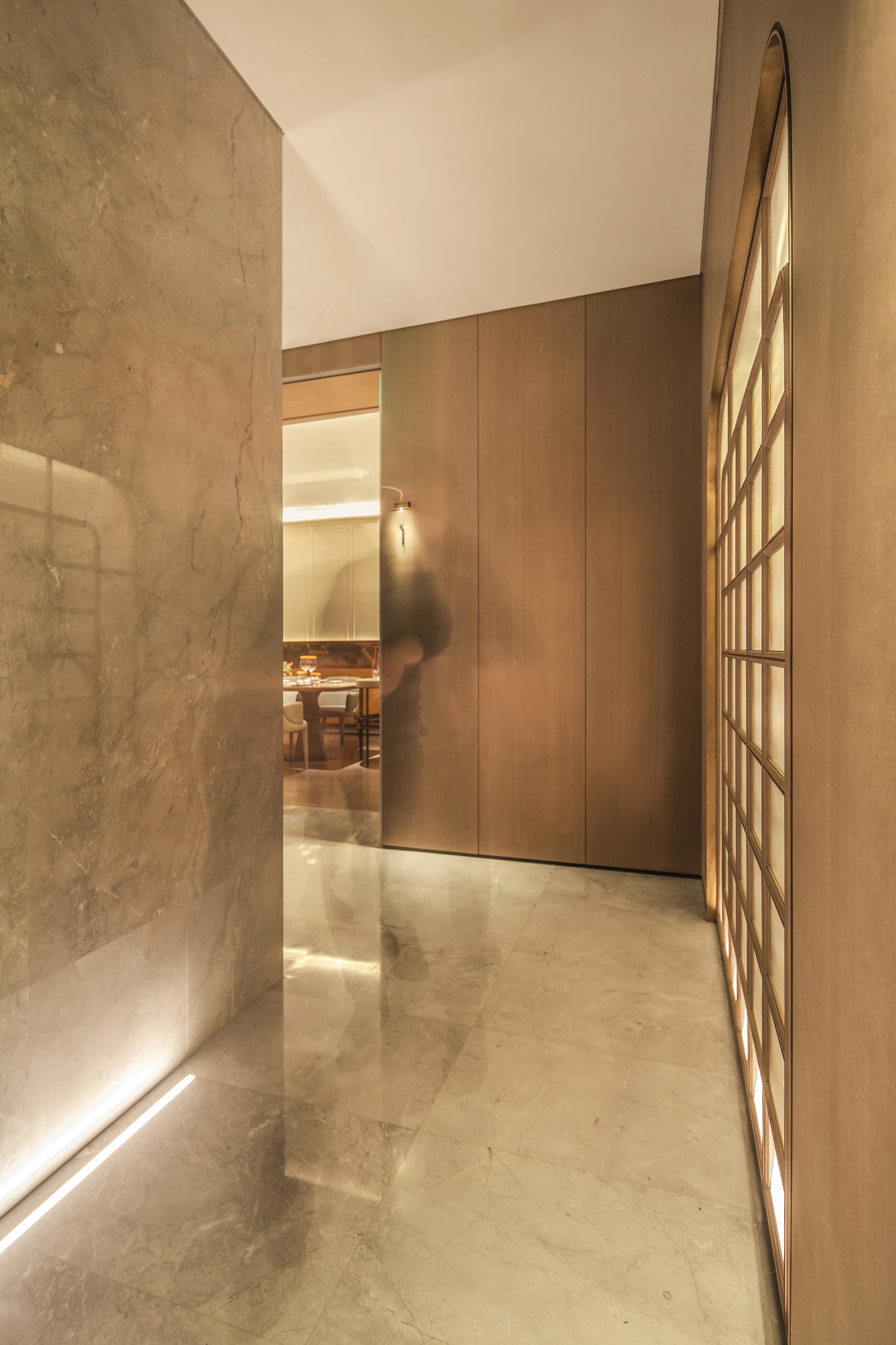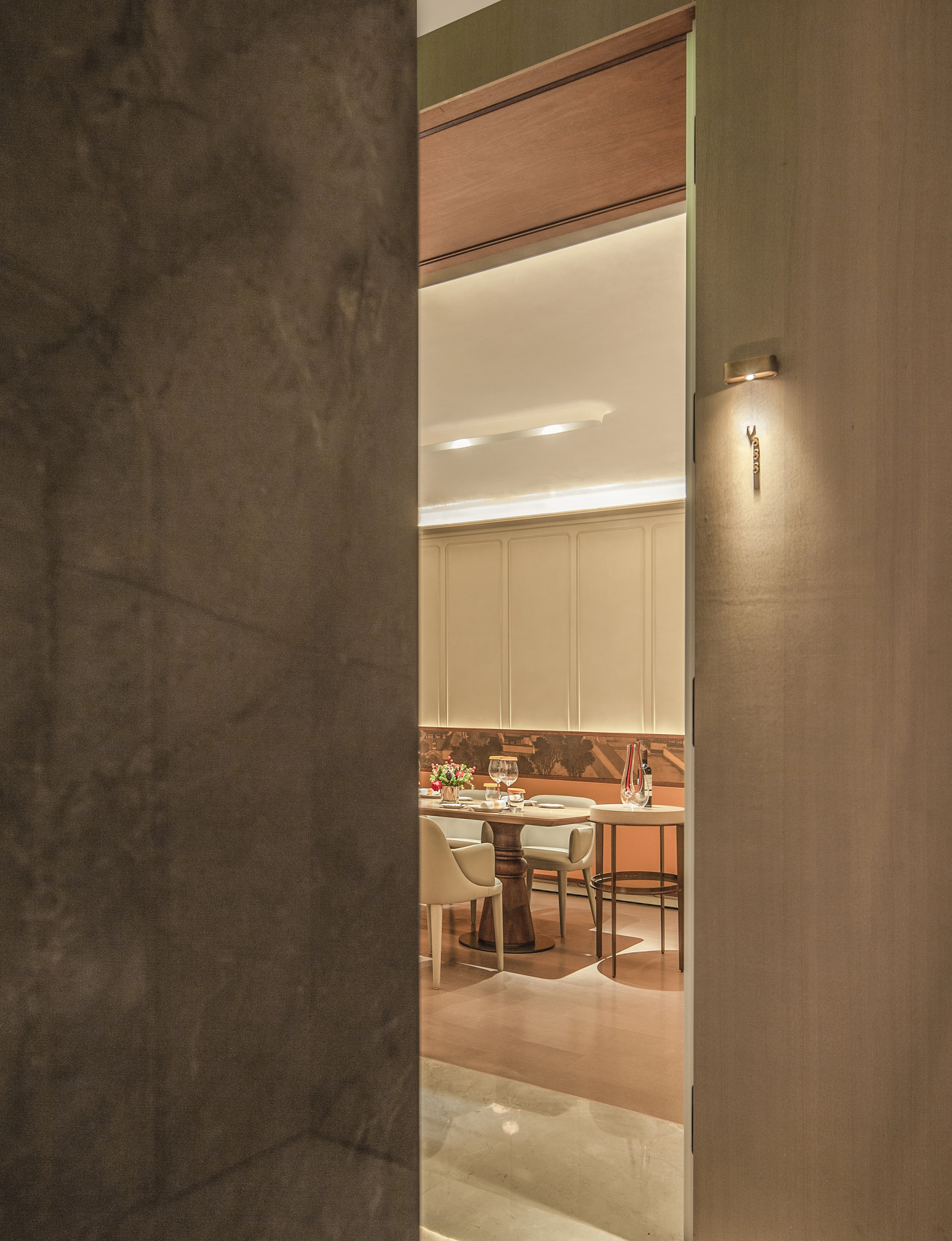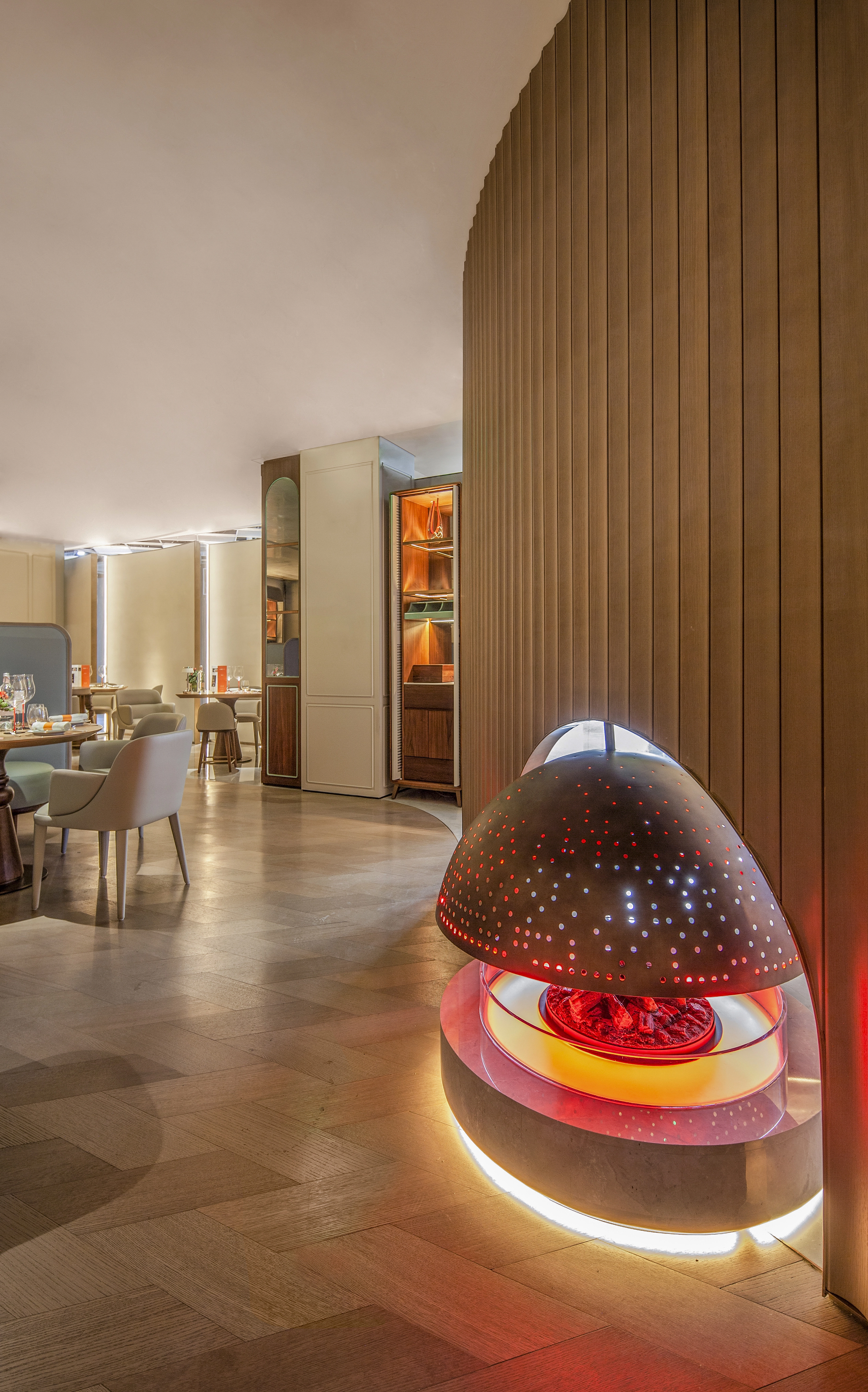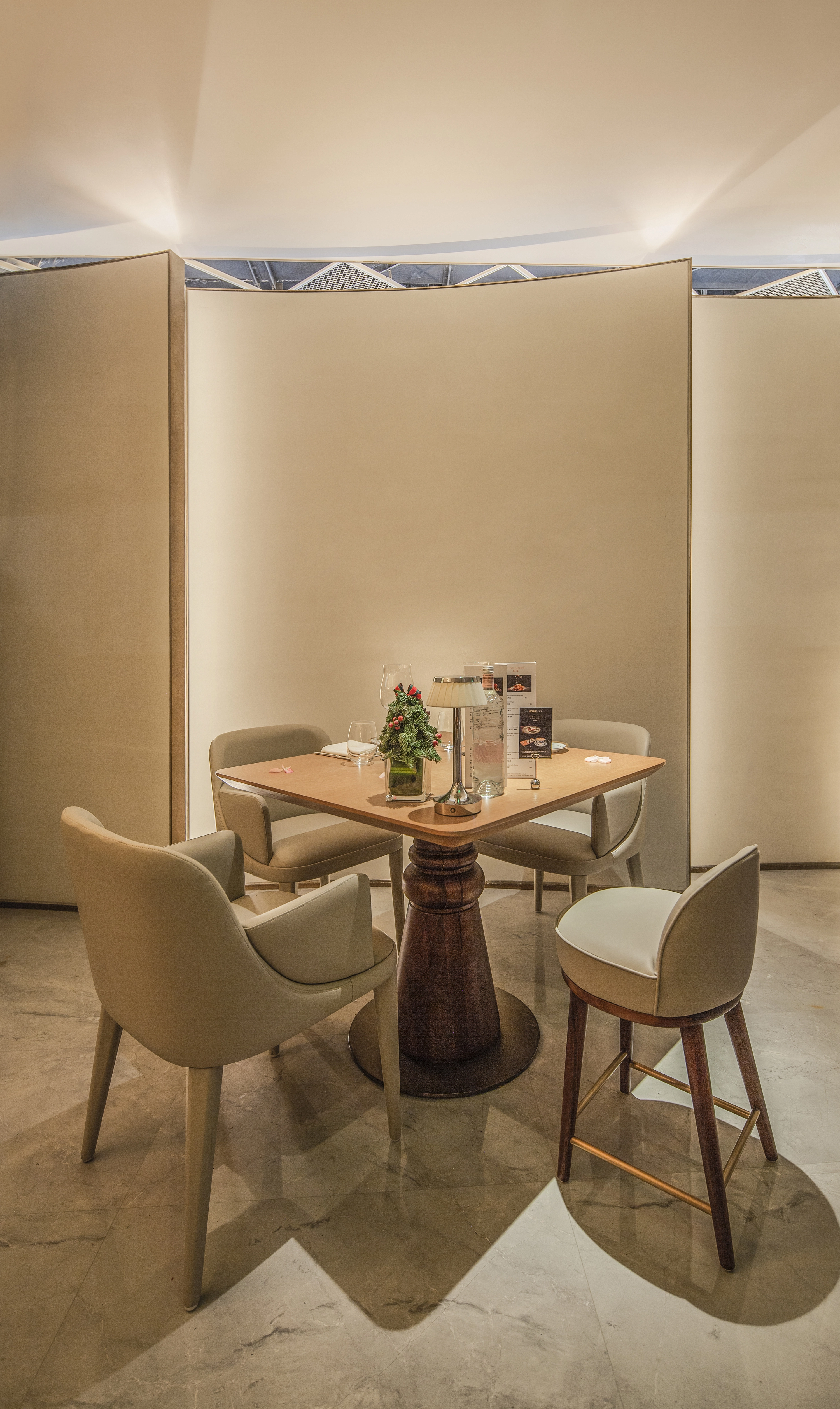 夜晚灯光幽谧,氛围与情调愈渐浓郁,暗示着空间内部某种非日常的精神与情绪的表达。在光线的映衬下表述雅致的情绪对牛排家文化的传承再塑造。
