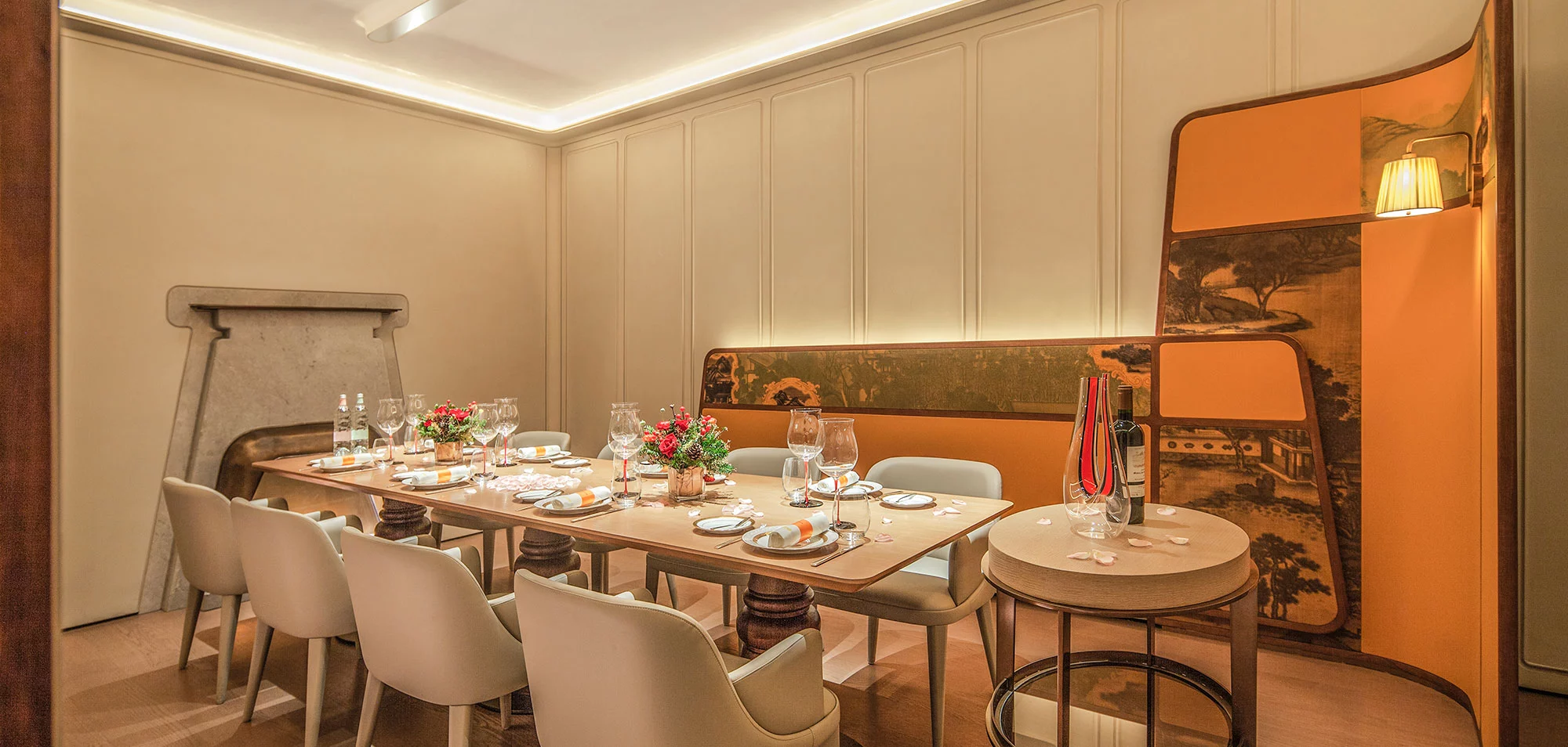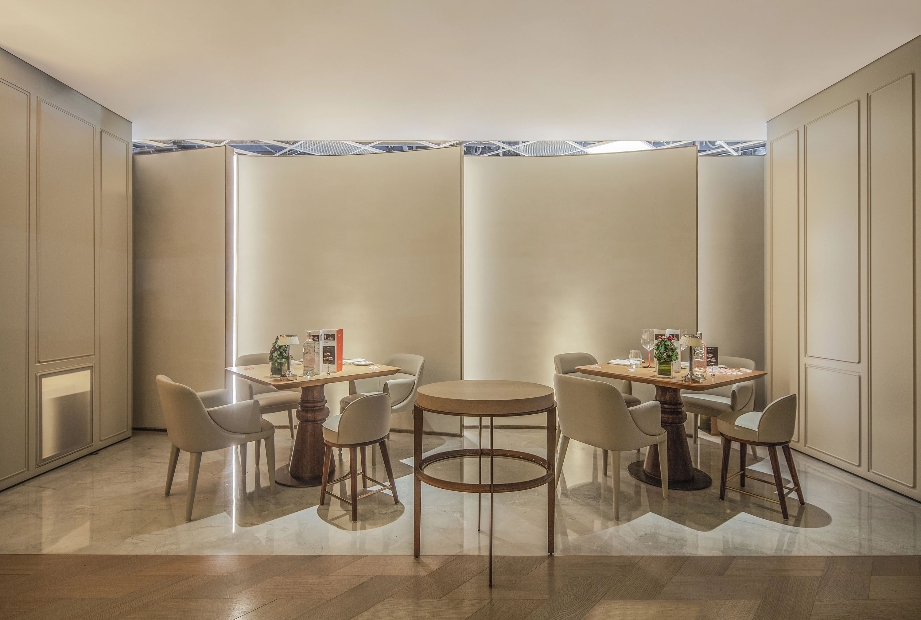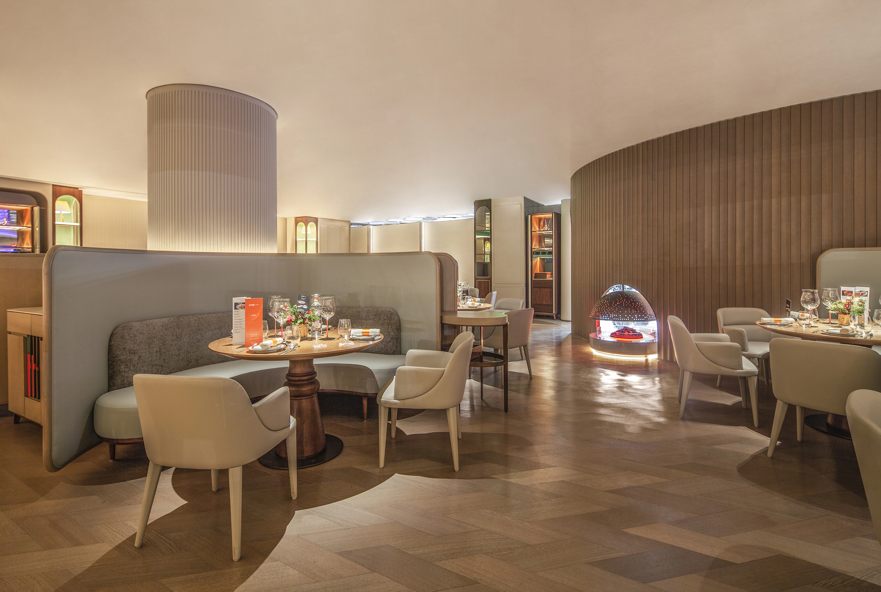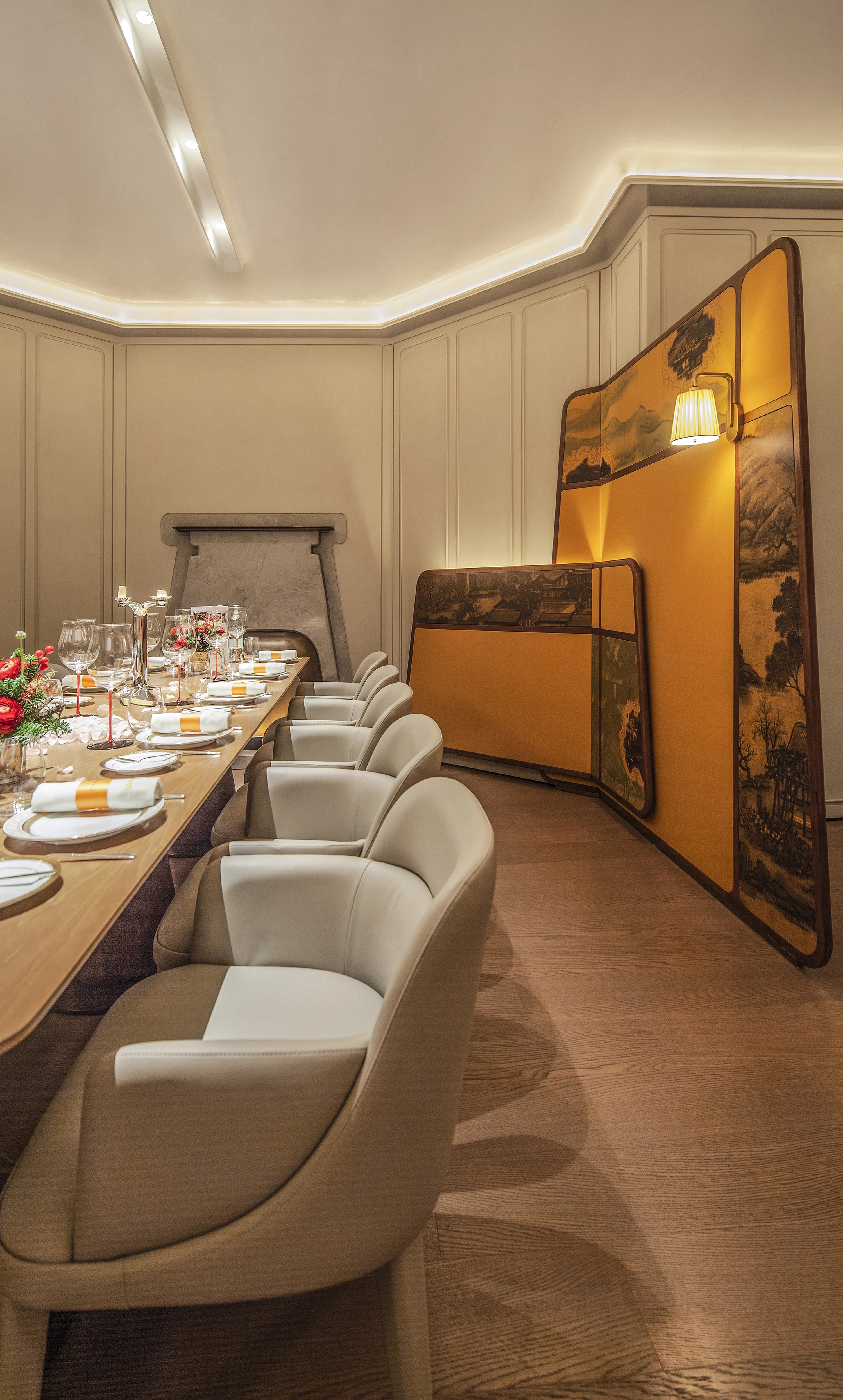 夜晚灯光幽谧,氛围与情调愈渐浓郁,暗示着空间内部某种非日常的精神与情绪的表达。在光线的映衬下表述雅致的情绪对牛排家文化的传承再塑造。