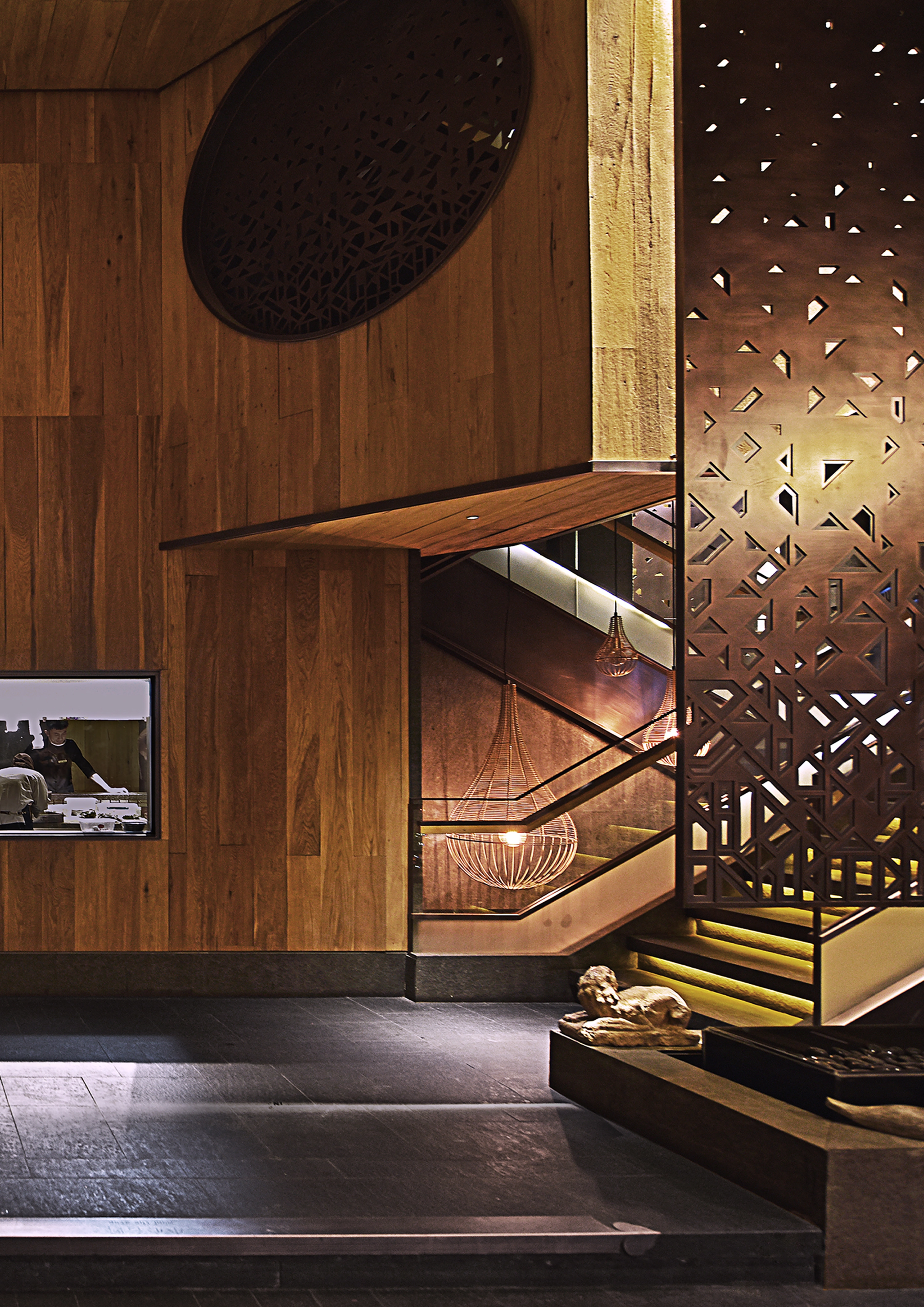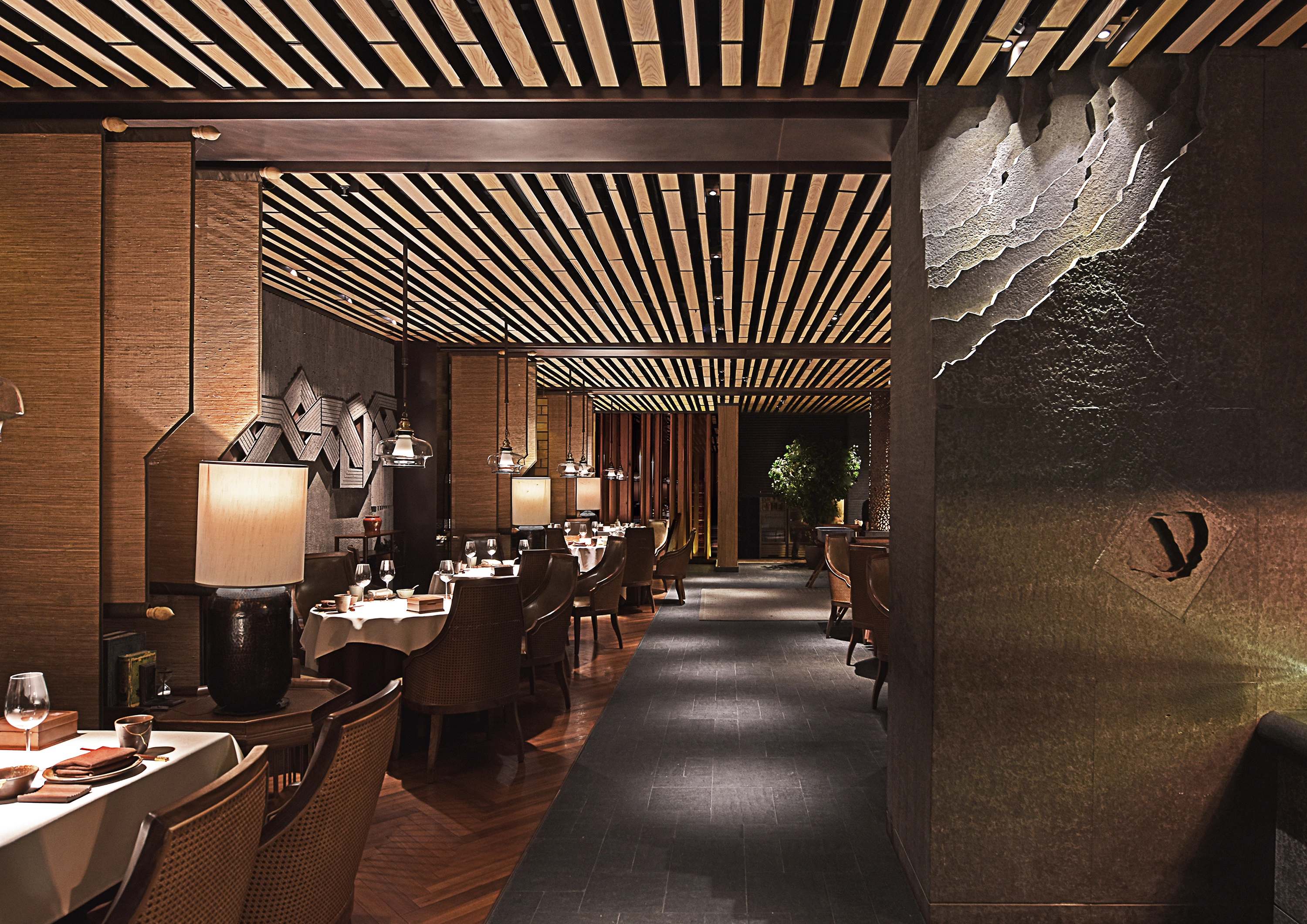 材质本身的色彩与肌理能使其空间渗透着自然的气息。内封闭合的空间经过光的渗透,减缓人们心里的压力。灯光的书写能雕琢出空间的味道。叠加和并置把空间的定义感性的组合起来。不同界面的起止点通过变化,来活跃视觉的观赏角度。婆娑的竹影、纵向的分割、斑斓的星光、悬窗的内外,情景的共荣,把空间的商业性质赋予人文故事,使其内不同位置的就餐者,都能感受和拥有空间所给与自己的那份独有温情,偷闲着城市的美好时光。