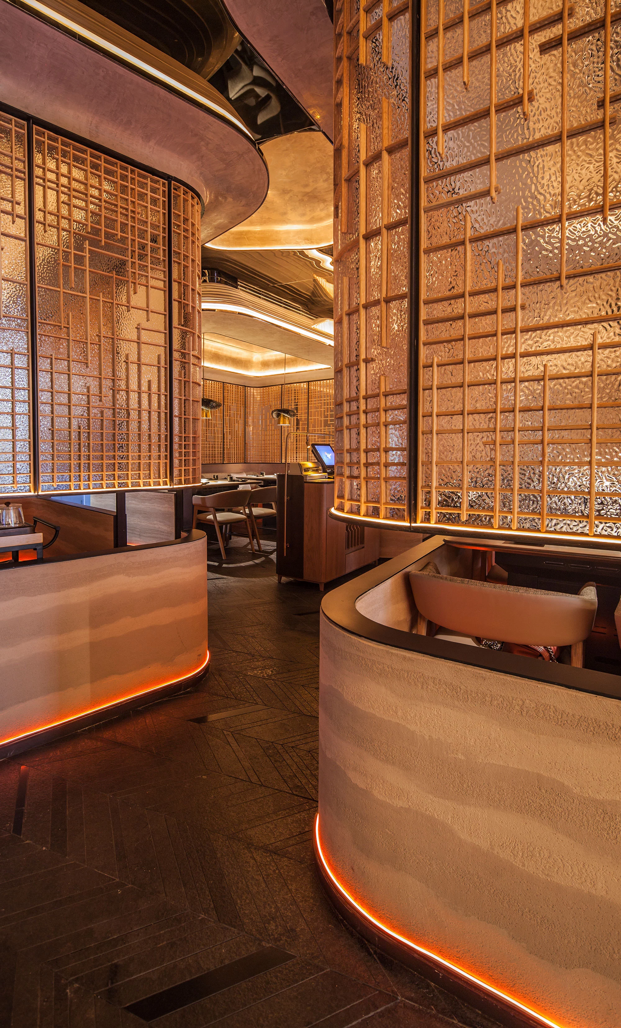 本色木格花窗与水纹玻璃的交错,部分的遮挡为空间增添一份私密感,创造出一种深层次的幻觉,让人们在流动的空间中停滞,享受其美之时却忘时间的流逝。