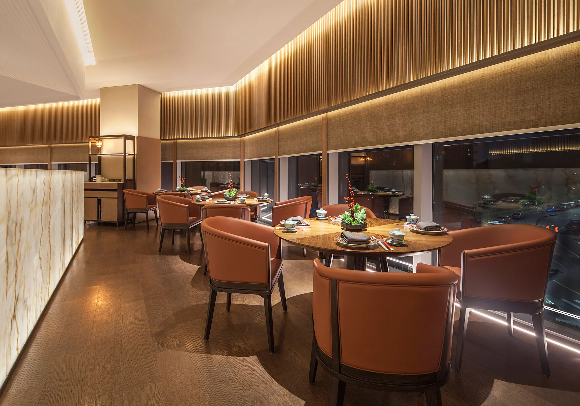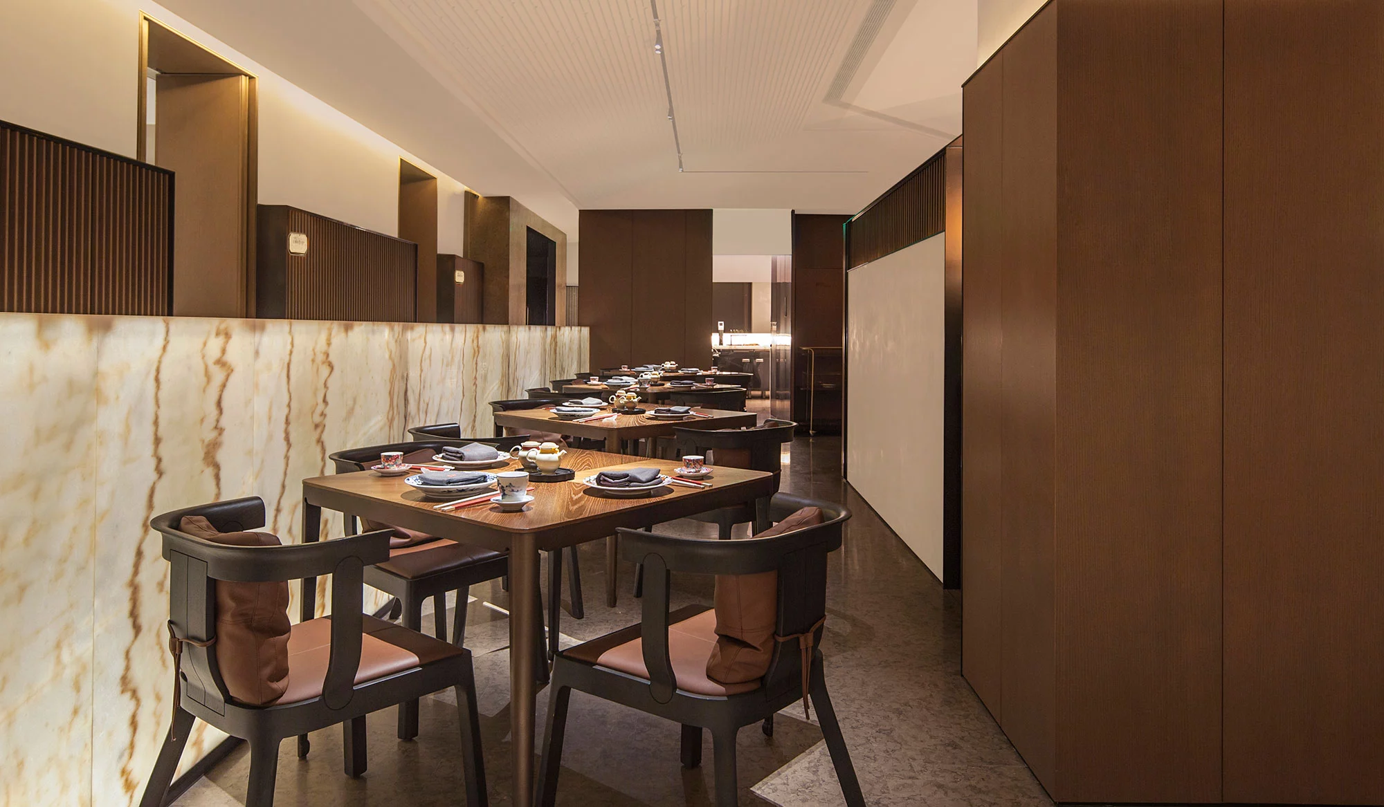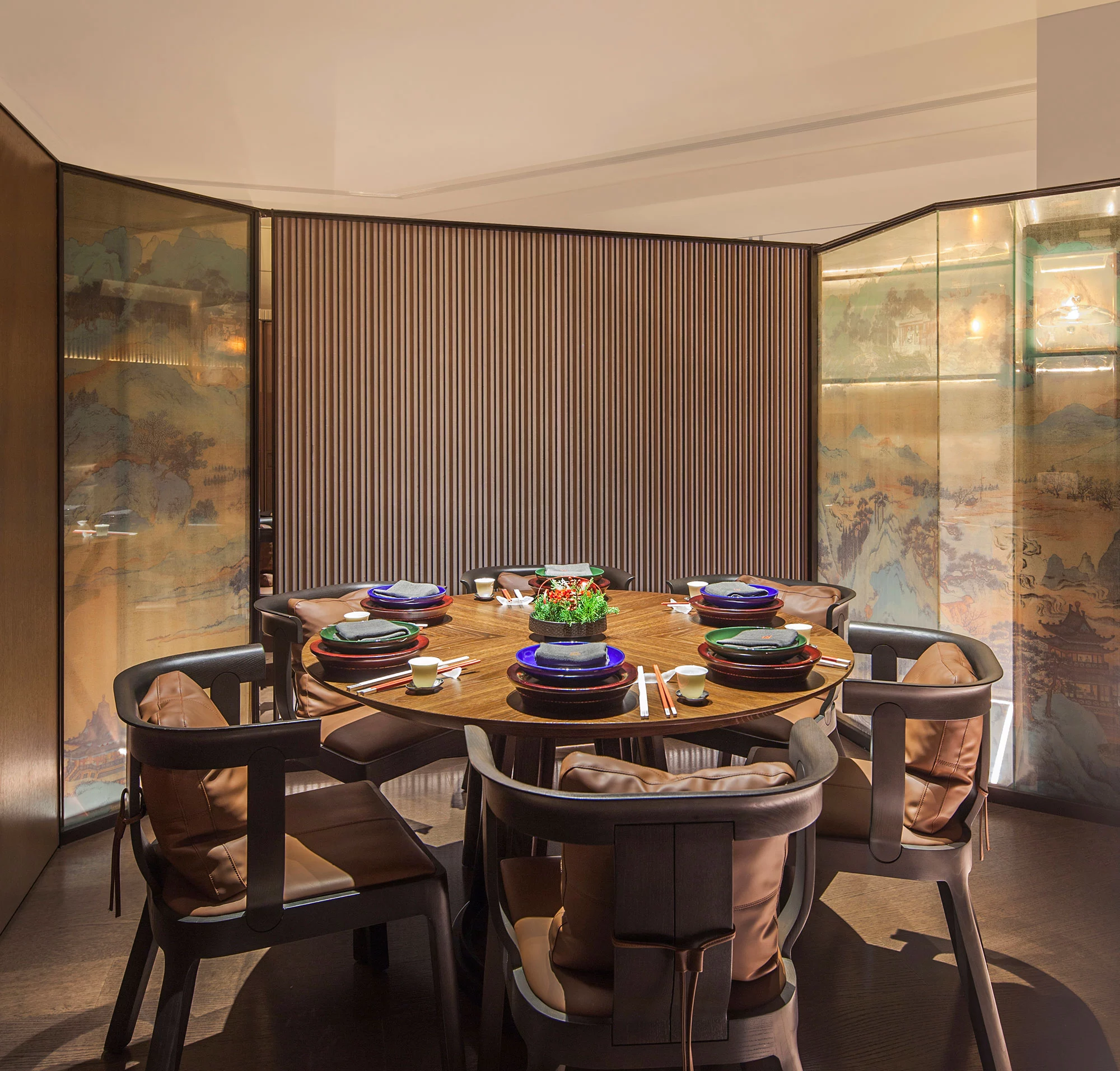 局部细节、质感、几何上呈现出简洁整体的一面,采光的木格栅在不同时间段融入不同的采光背景使其更加流光溢彩。简洁的几何和线条的节奏将整个空间串联起来。餐厅多个位置的民族图案通过叠加、分割在空间上产生映衬的色彩氛围。