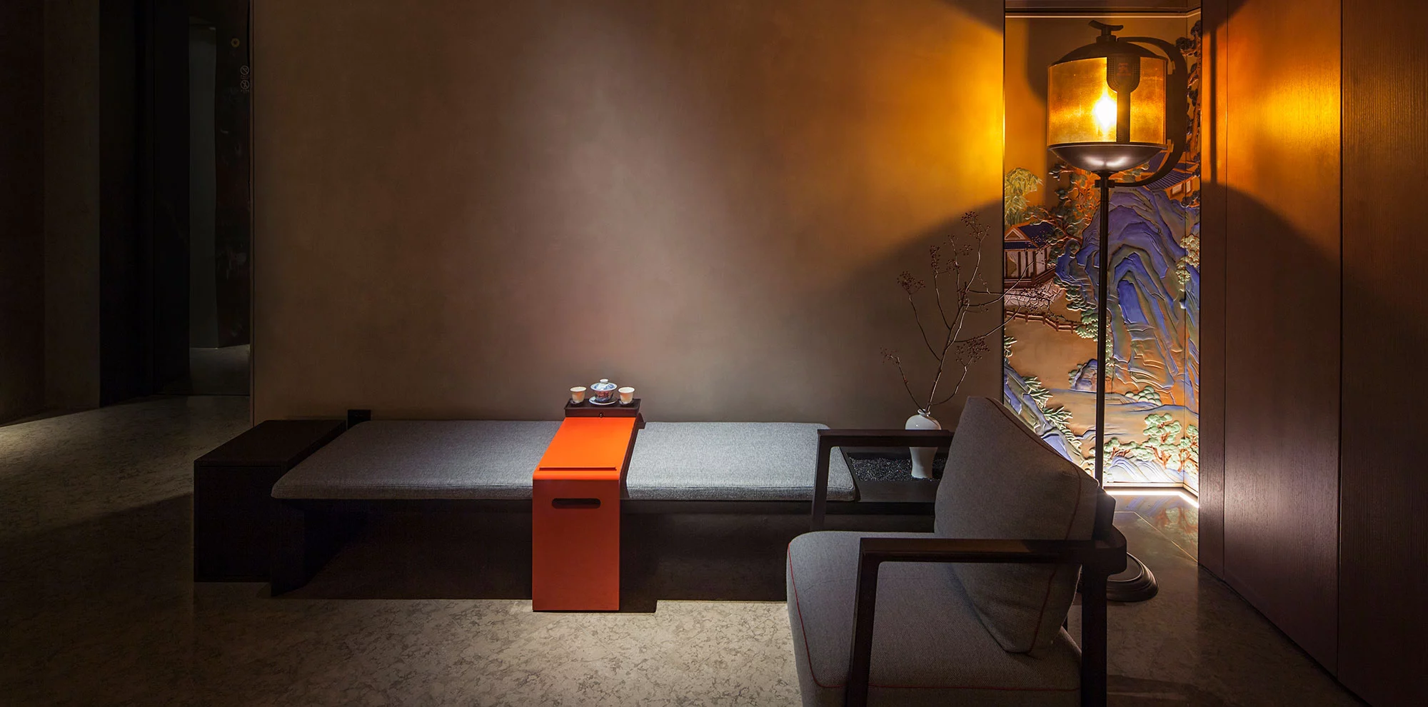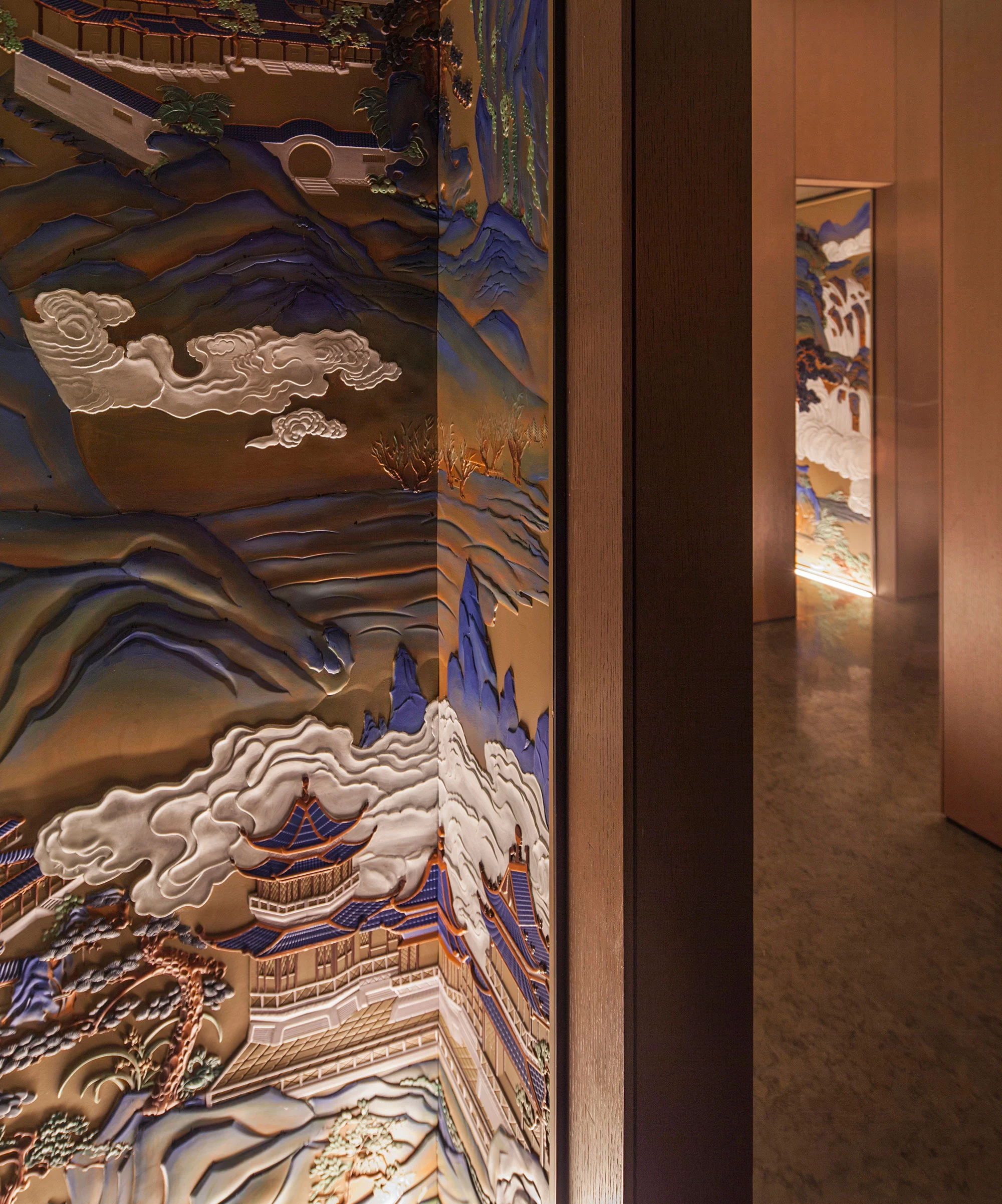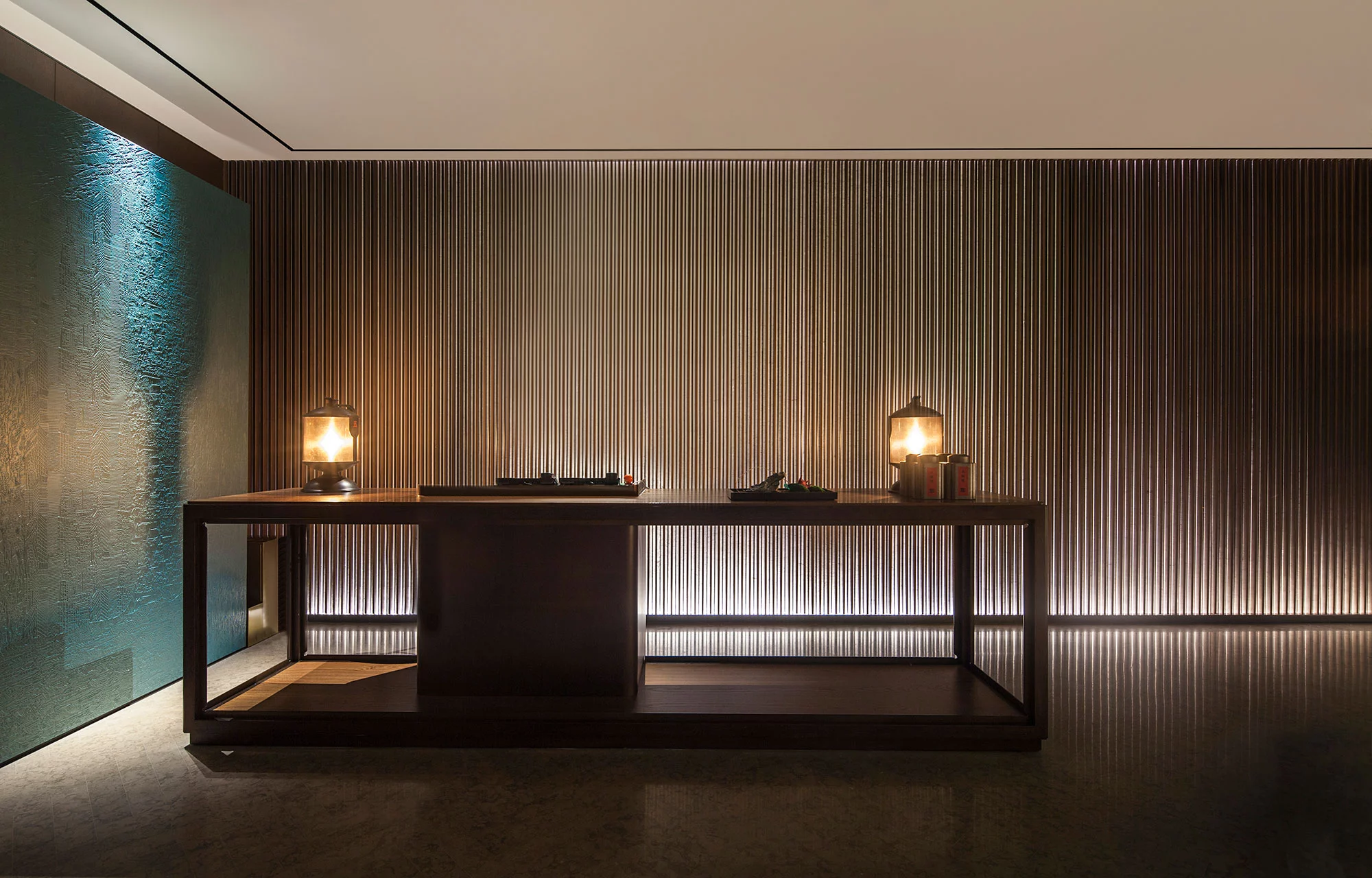 局部细节、质感、几何上呈现出简洁整体的一面,采光的木格栅在不同时间段融入不同的采光背景使其更加流光溢彩。简洁的几何和线条的节奏将整个空间串联起来。餐厅多个位置的民族图案通过叠加、分割在空间上产生映衬的色彩氛围。