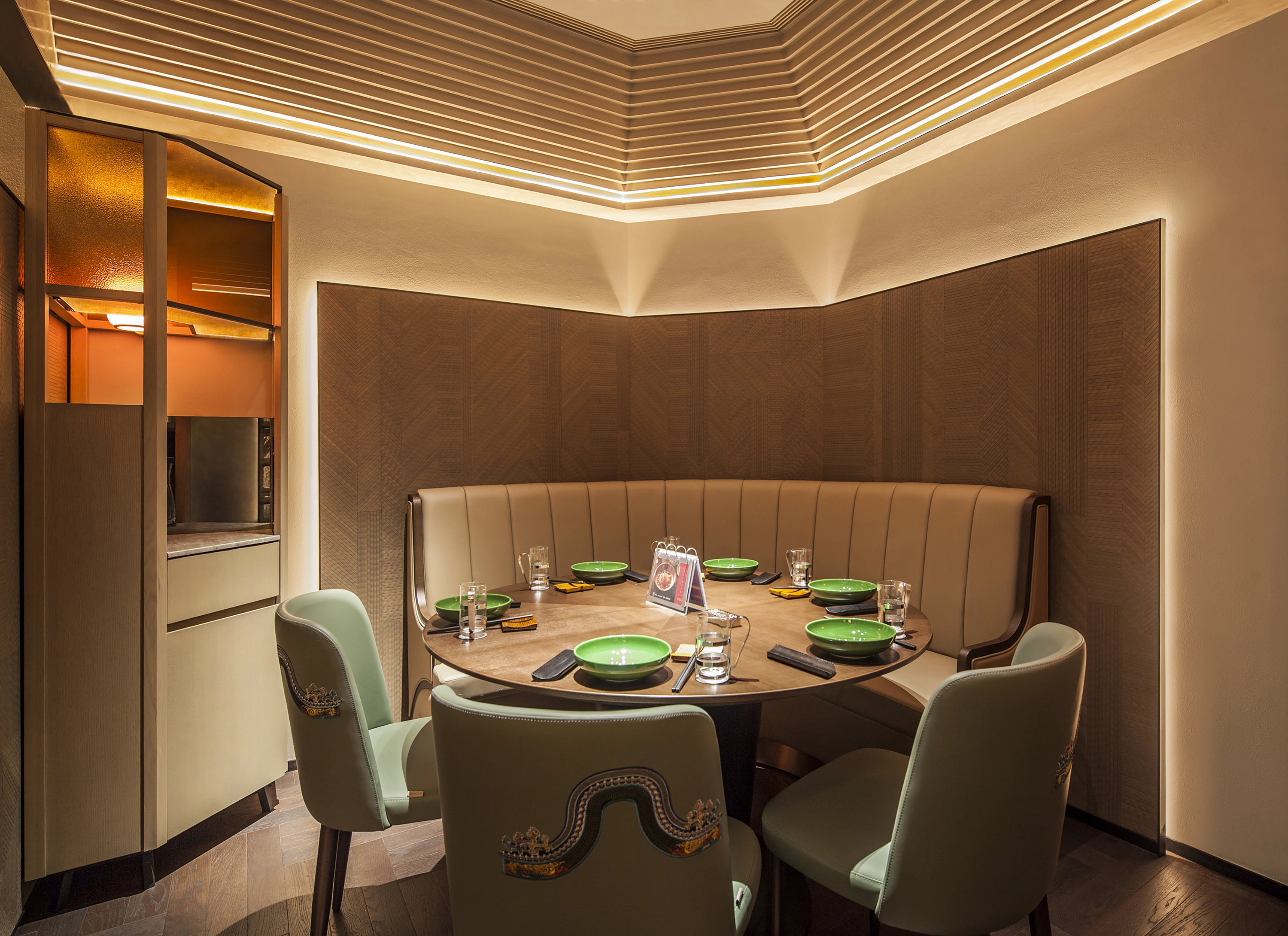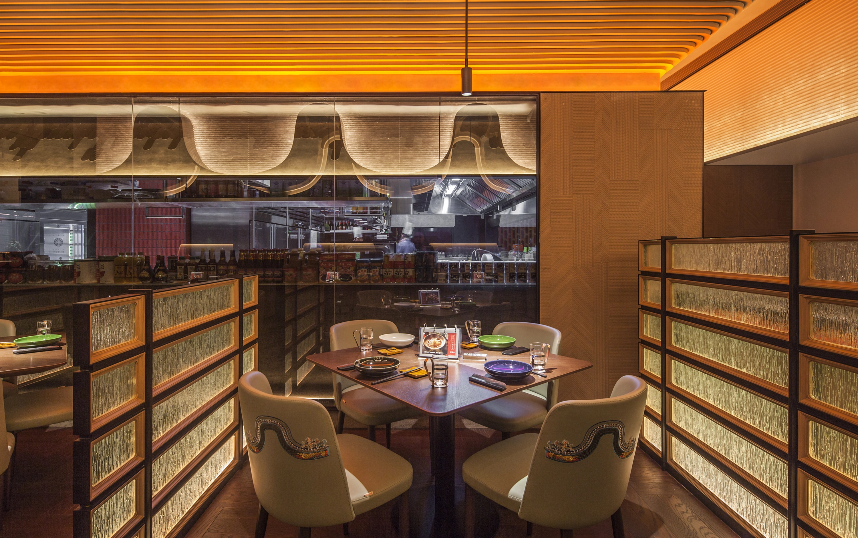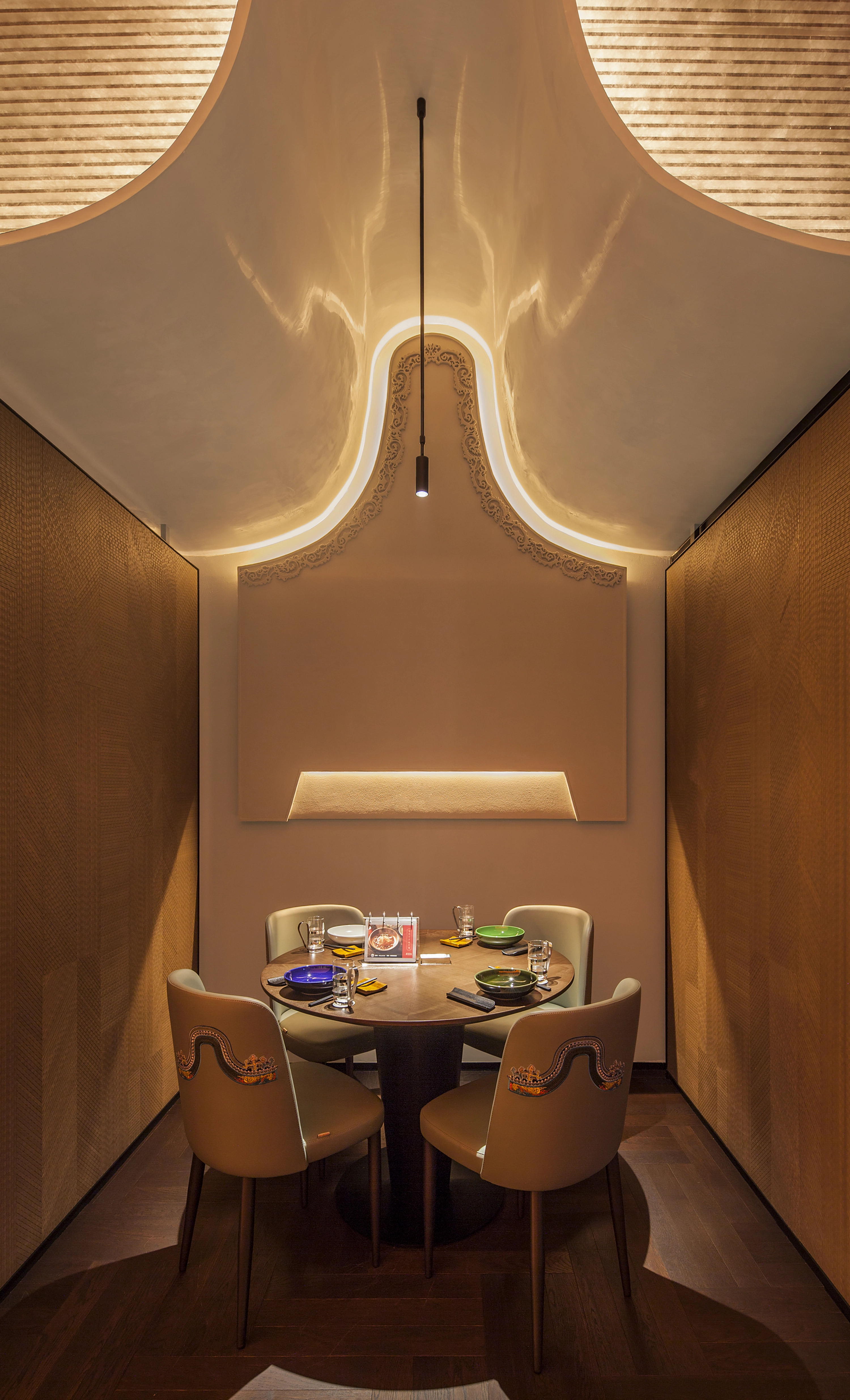 虚实的光线与文宝宣纸贯穿的上层空间在棚面幽若荡漾,建造出有序为整的用餐空间场域。