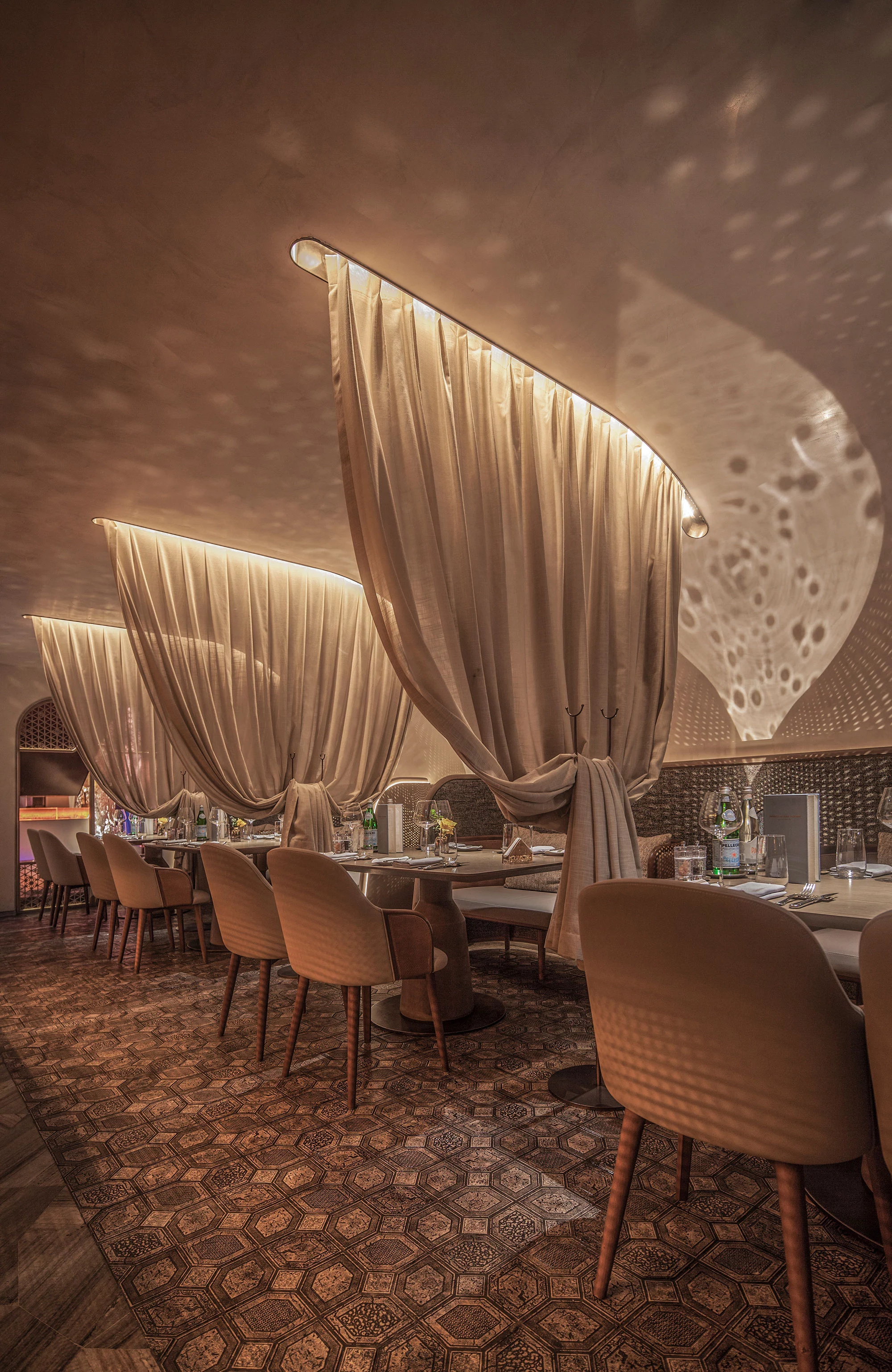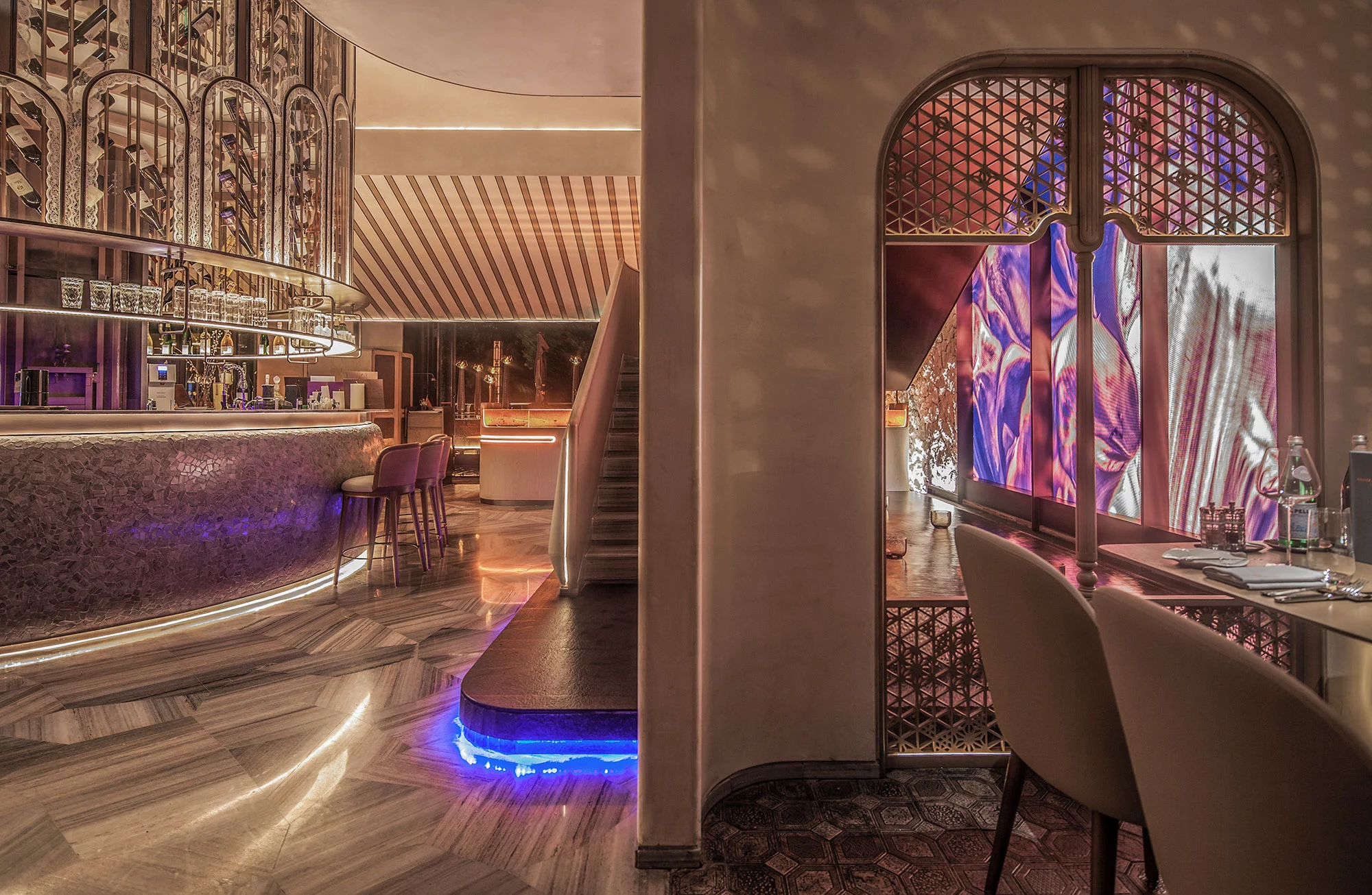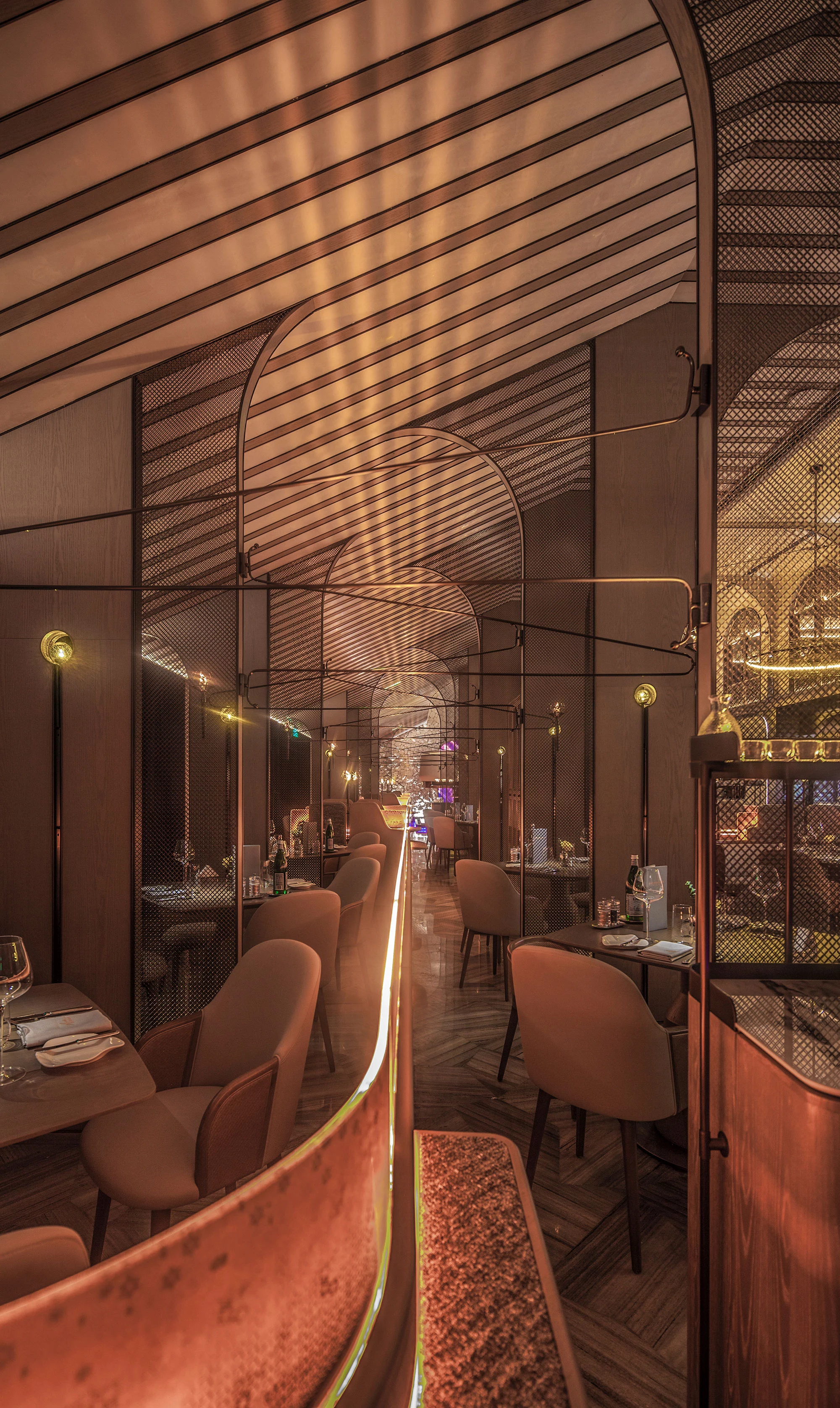 柔美的弧形线条作用于空间,水吧垂直耸立,营造空间视觉中心,古铜色金属和毛石的厚重,与印花玻璃的剔透突破了工艺和创新的界限,空间内火炬灯柱照亮一室璀璨。