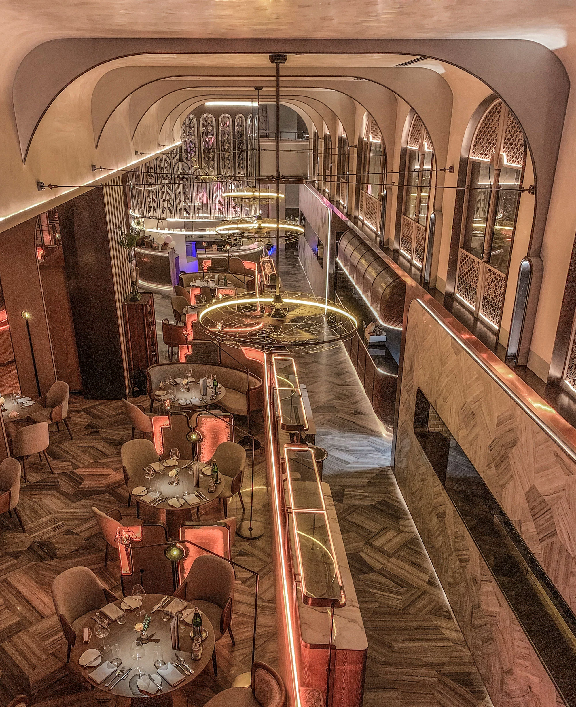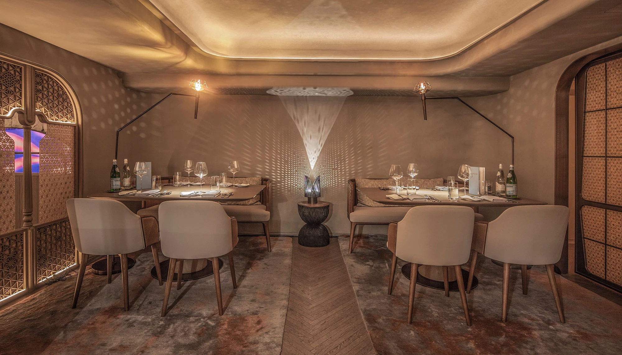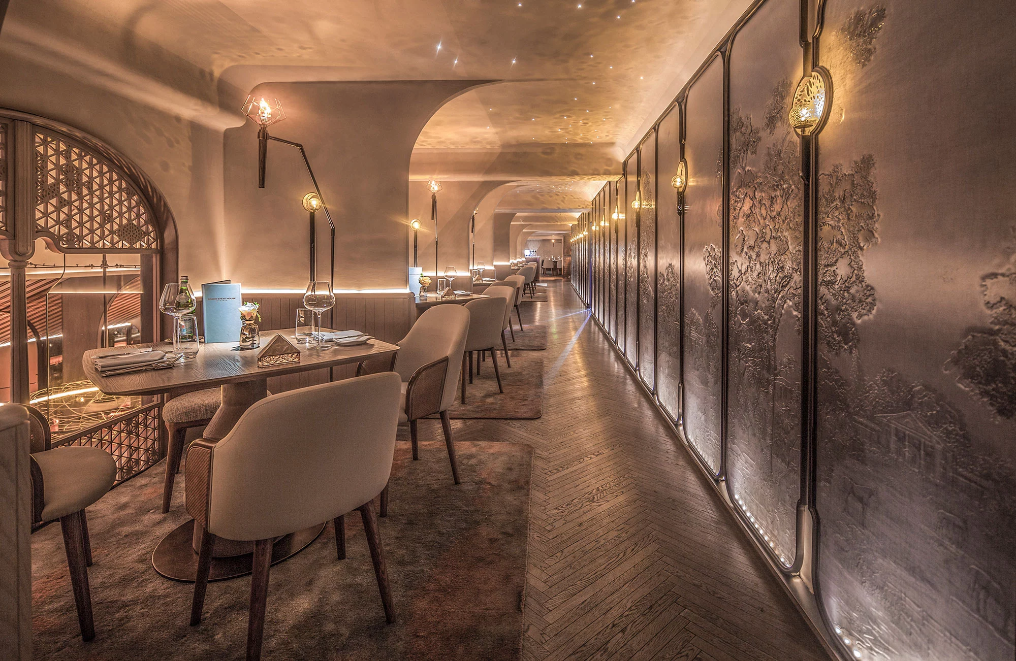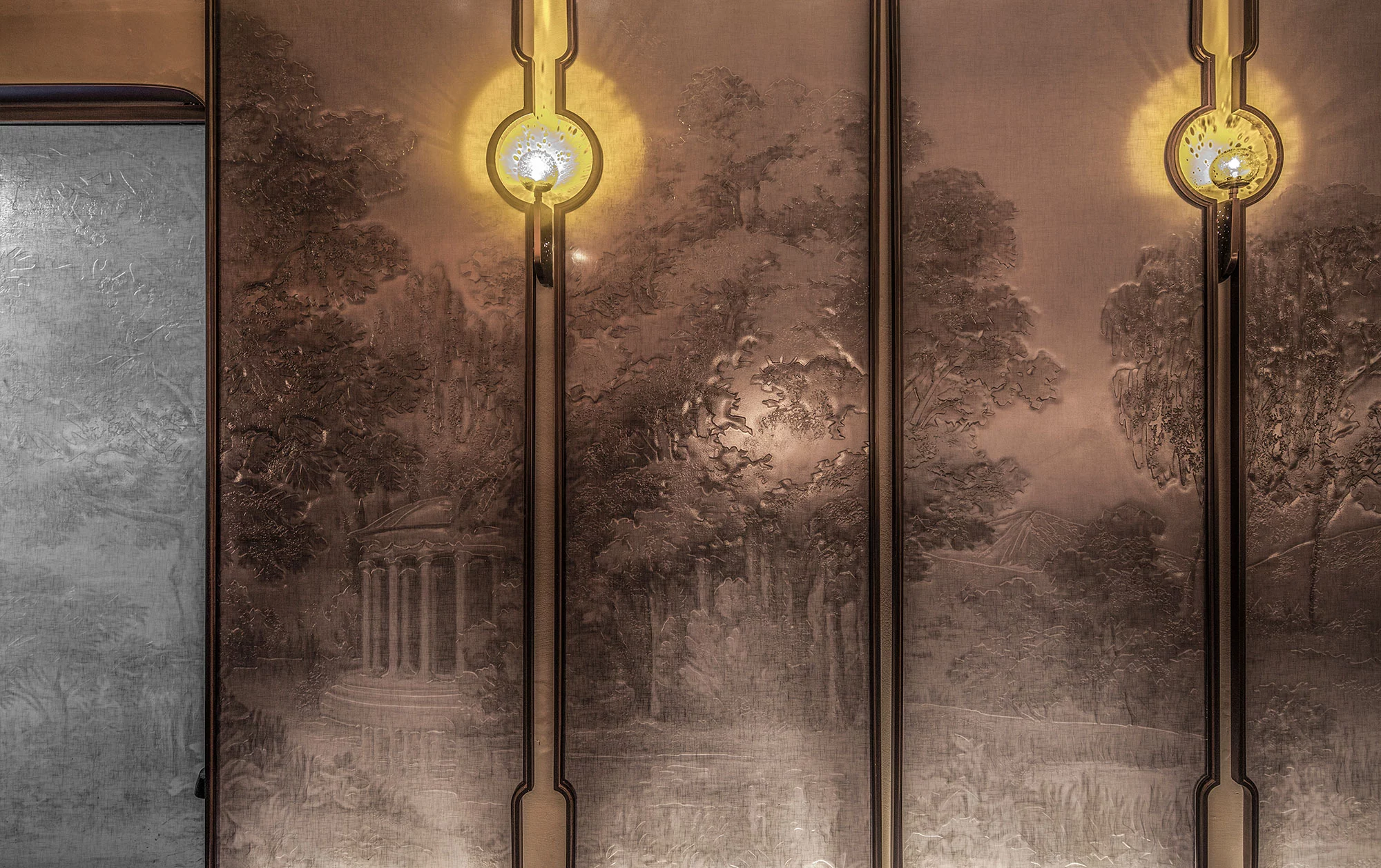 柔美的弧形线条作用于空间,水吧垂直耸立,营造空间视觉中心,古铜色金属和毛石的厚重,与印花玻璃的剔透突破了工艺和创新的界限,空间内火炬灯柱照亮一室璀璨。