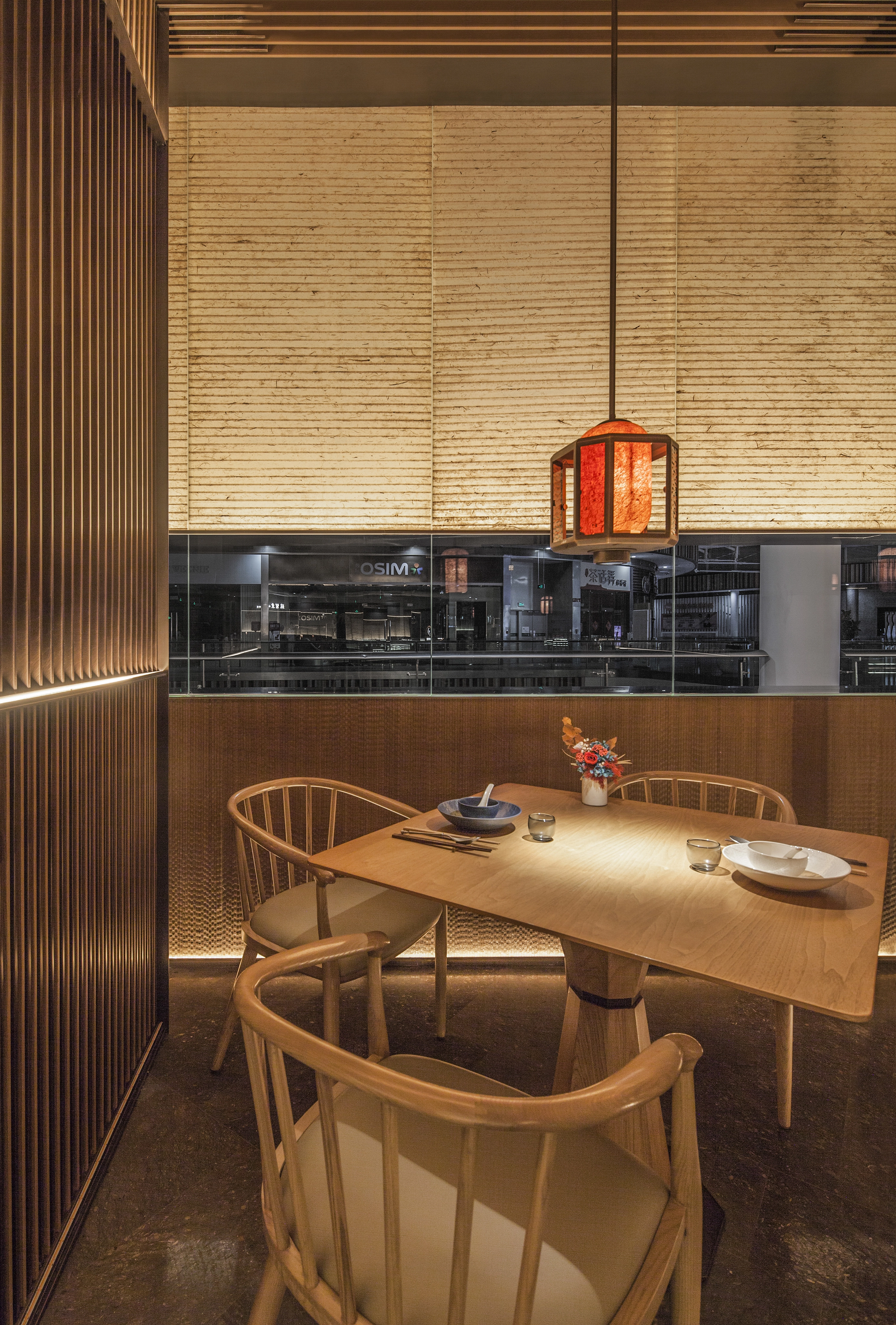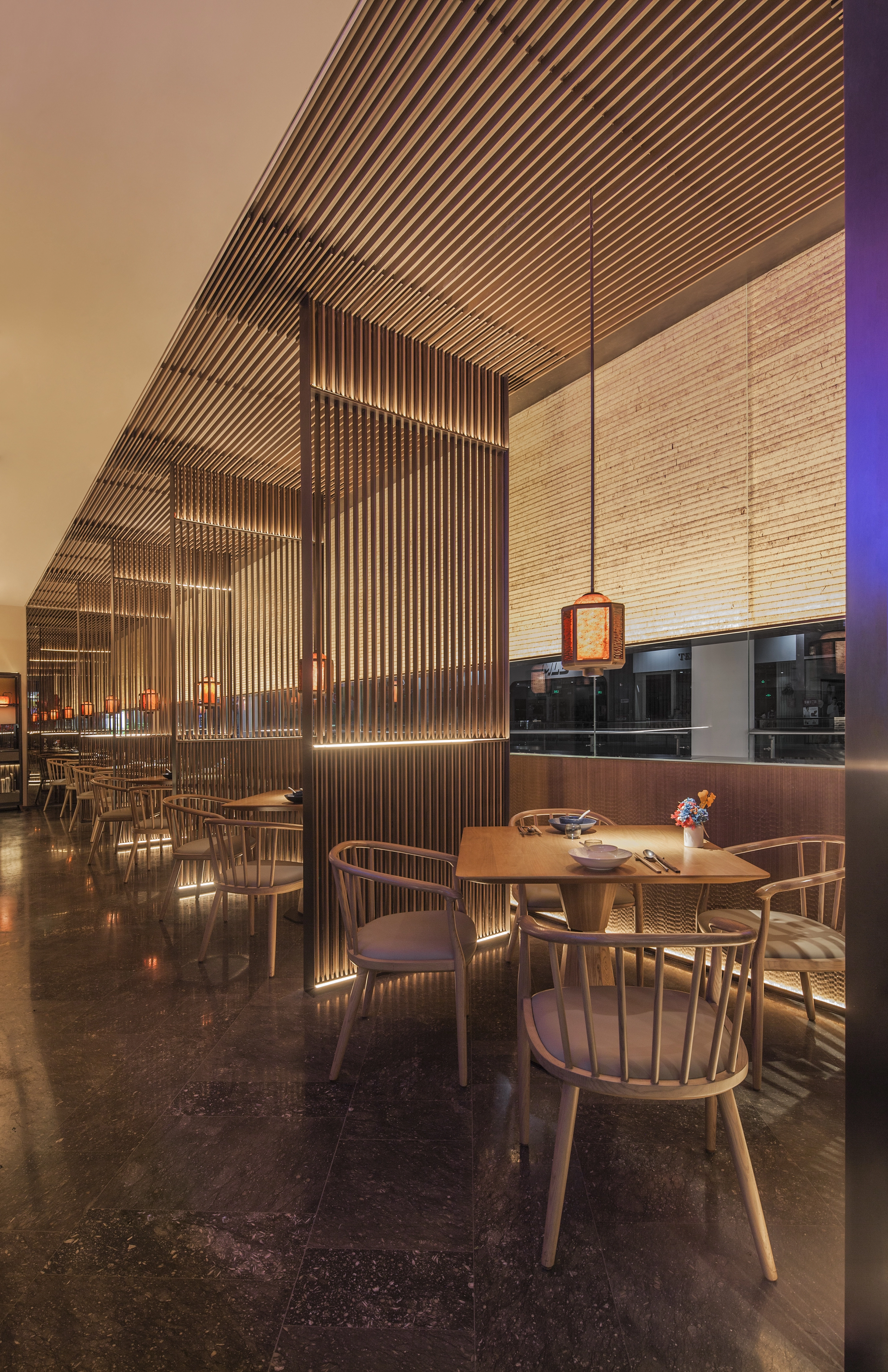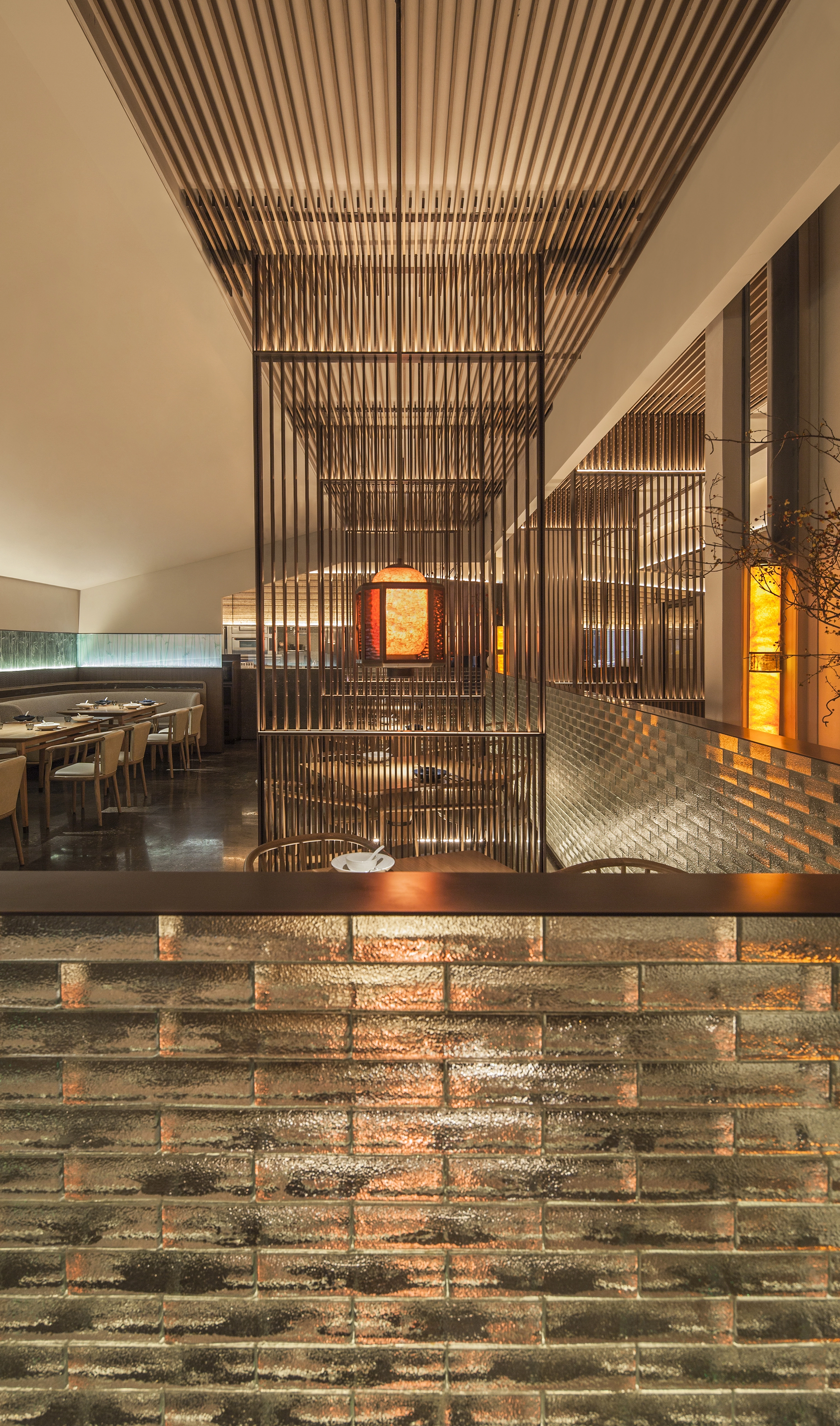 整个空间具有当代的结构形式和文人的内敛气质,使用木质与金属、涂料的材料相组合。整个建筑空间设计中对序列、流淌、高低尺度的再创造,以求达到隐、遮、露、透的环境形式。