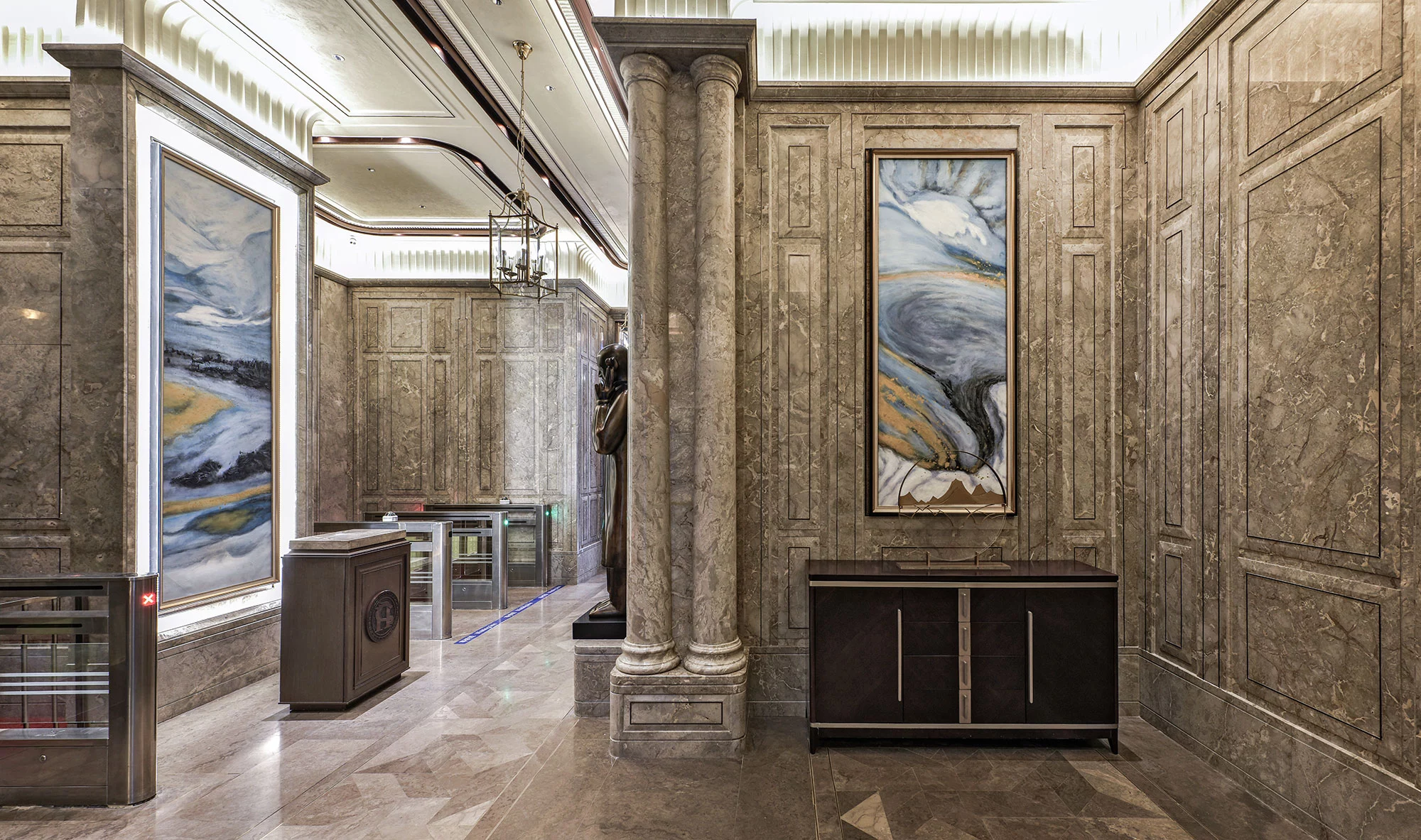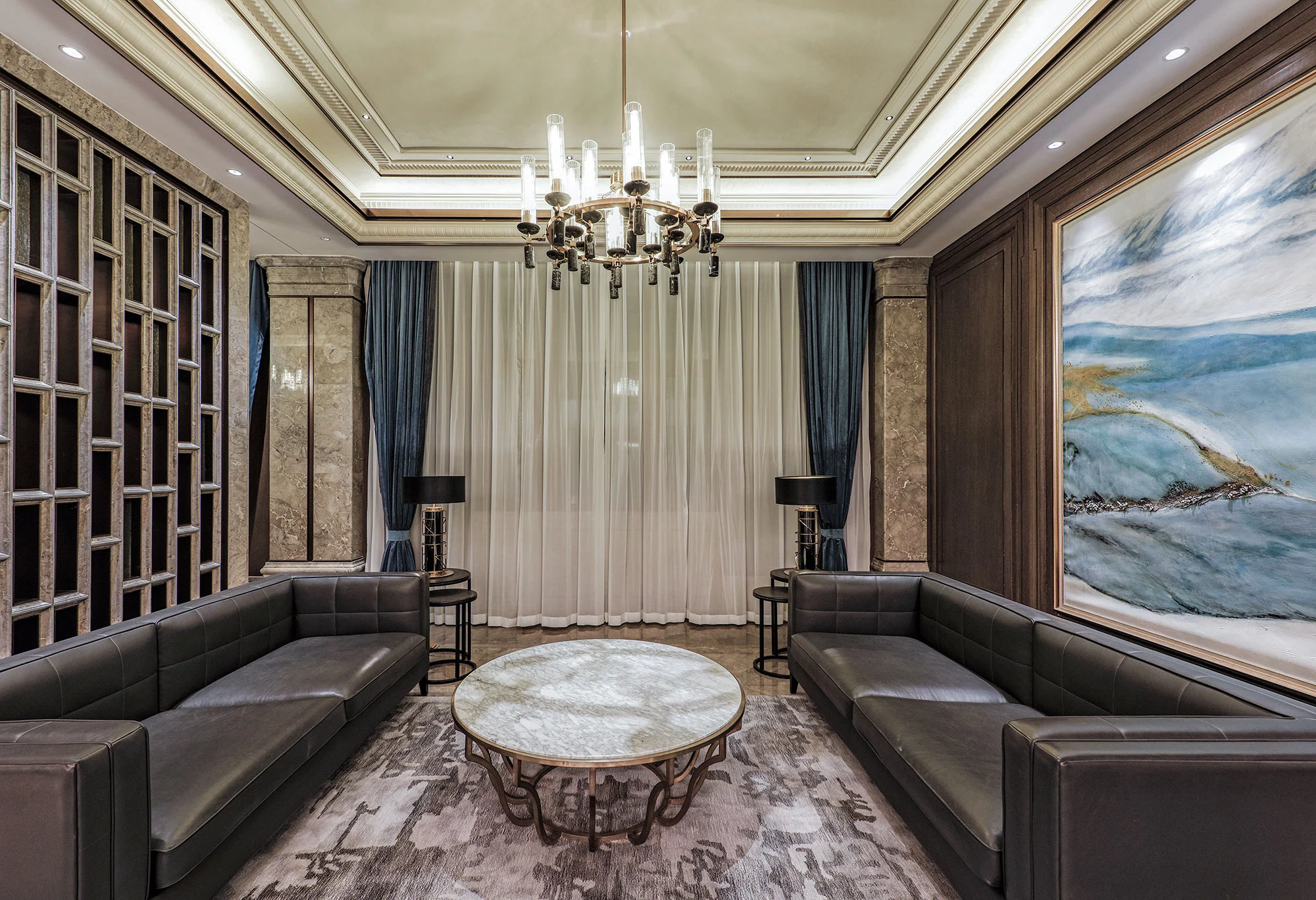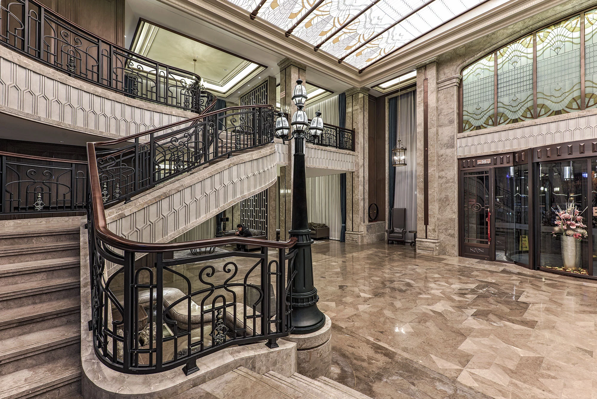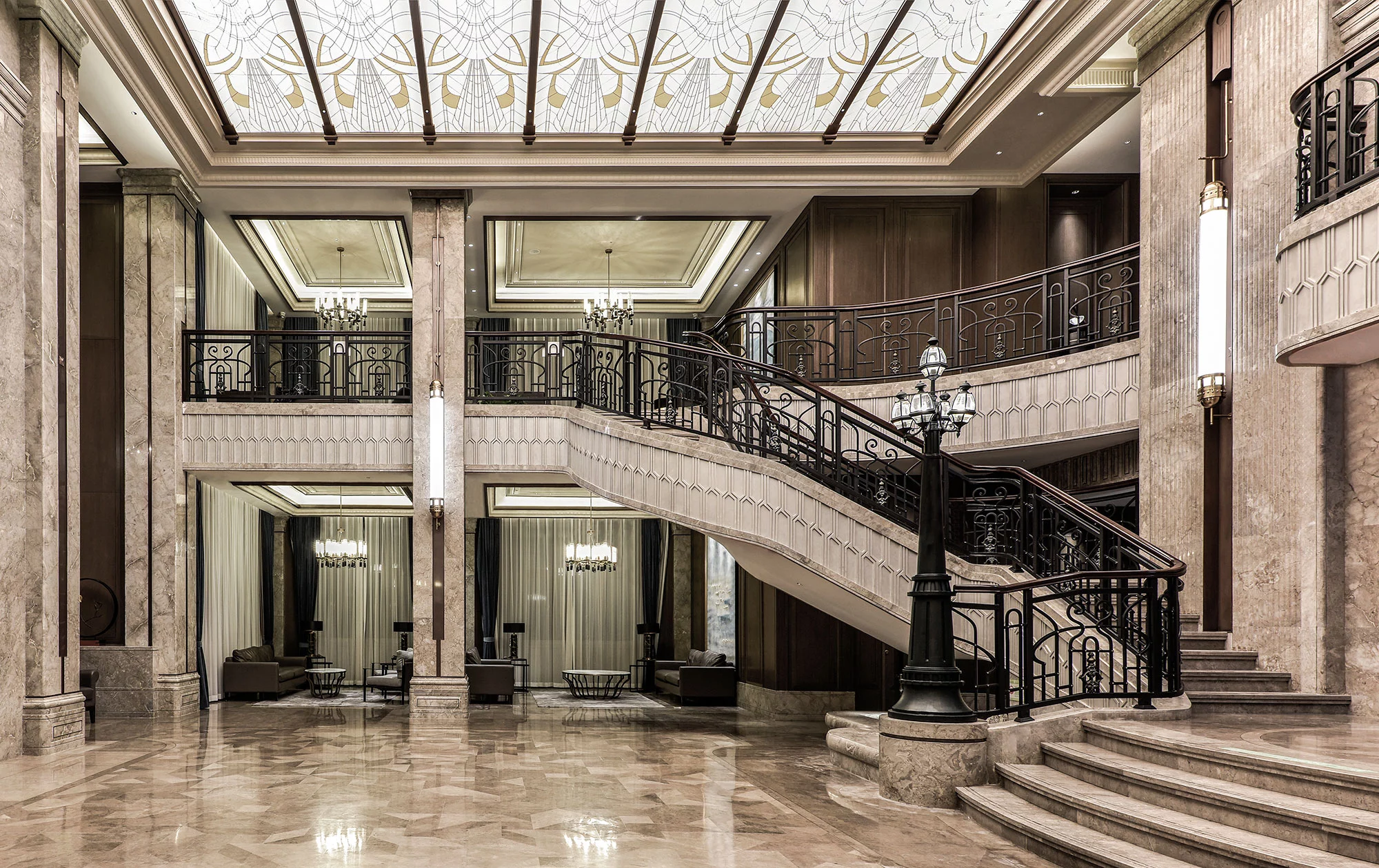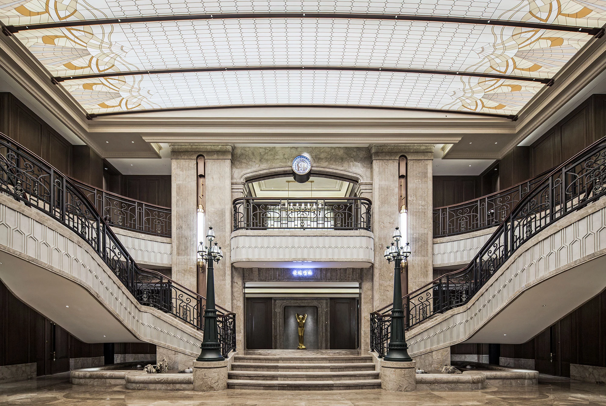 进入大堂,两侧的对称式楼梯,于无形之中增加仪式感,对空间进行更准确的表达,演绎空间独有的尊贵情感。弧形的天花造型,通过模拟自然光线的效果,让空间充满活力,从视觉上带来多层次的开阔感,具有新艺术运动风格的精美图案,更是设计师对空间的情感表达。