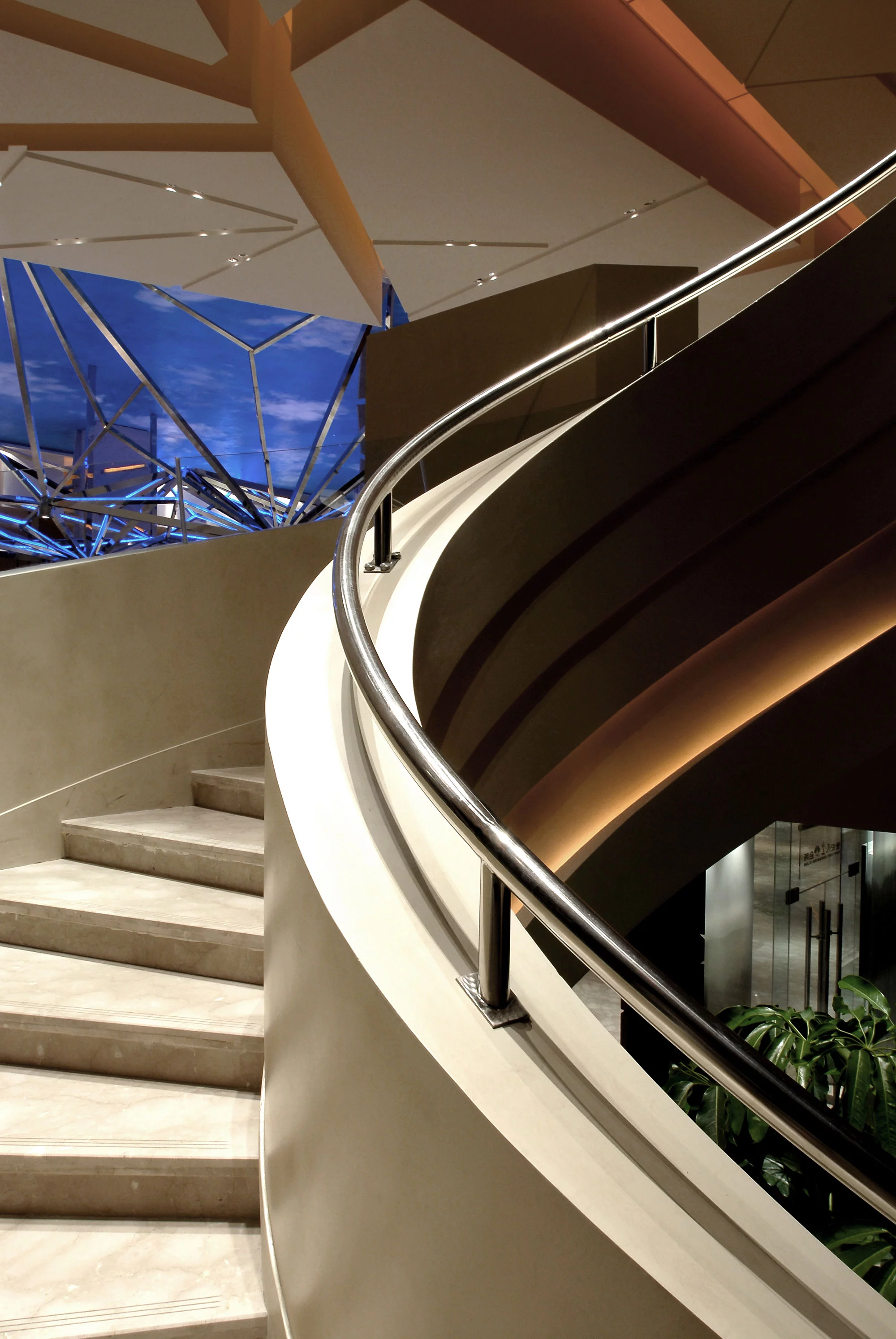 现代立体构成能充分的体现出空间的建筑美感,这正是我们想要的感觉。我们将那样已经深入人心的“自然”材料、颜色,用现代的手法表现,达到一种新的视觉感受。这些现代抽象形式的出现,也是我们从另外一些“自然”中提炼出来的,如大堂空间的造型是从玻璃落地后自然破裂形成的纹理中提炼的;餐厅空间天棚的造型是从大自然中一片落叶的叶脉纹理中提炼的。
