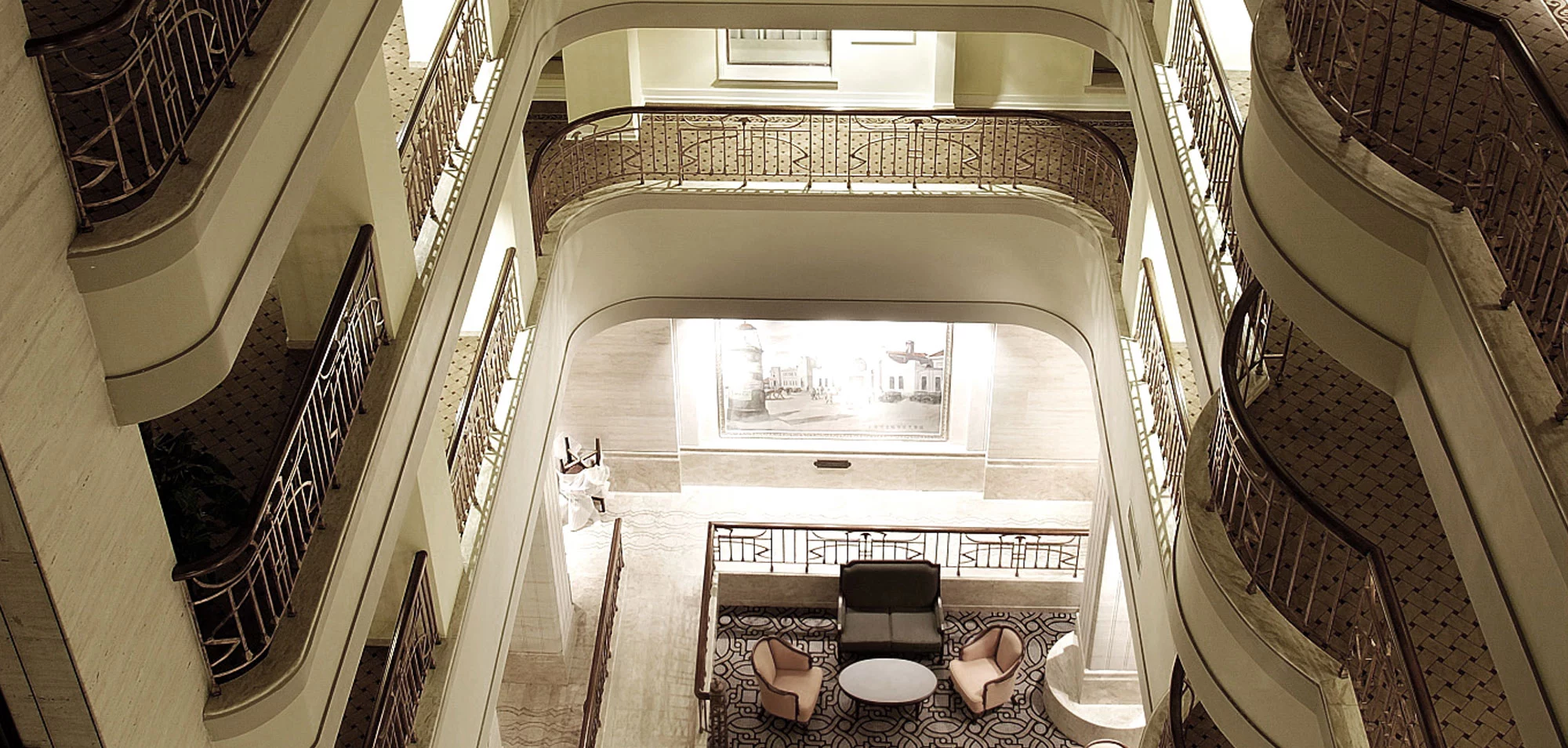 面对这样一座有着辉煌历史的建筑,我们以“复古怀旧、修复如初”为设计原则在古老中追求新意,从外建筑中提取新艺术运动的建筑符号,以老工艺为主要手段,创造现代新视觉。铜锈五金件、彩色玻璃镶嵌天花、复古傢私,每一处细部上都流淌着历史情节。