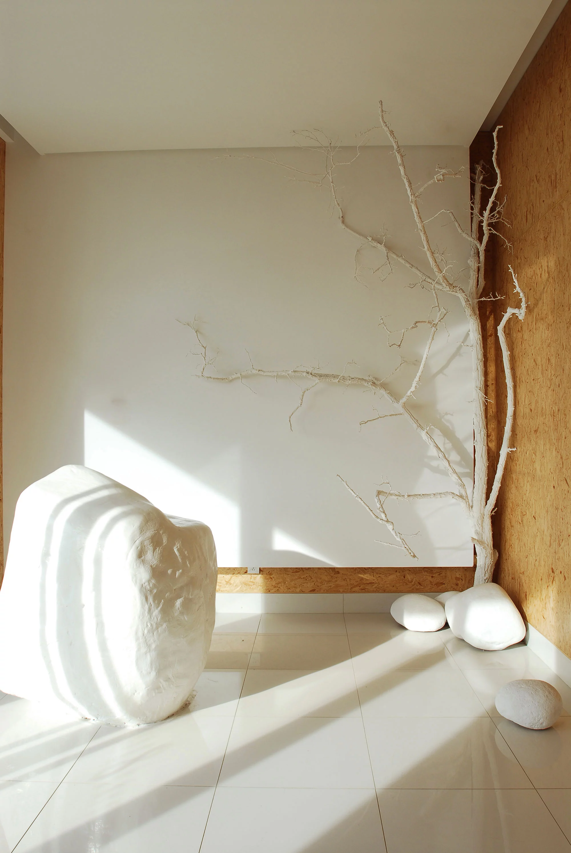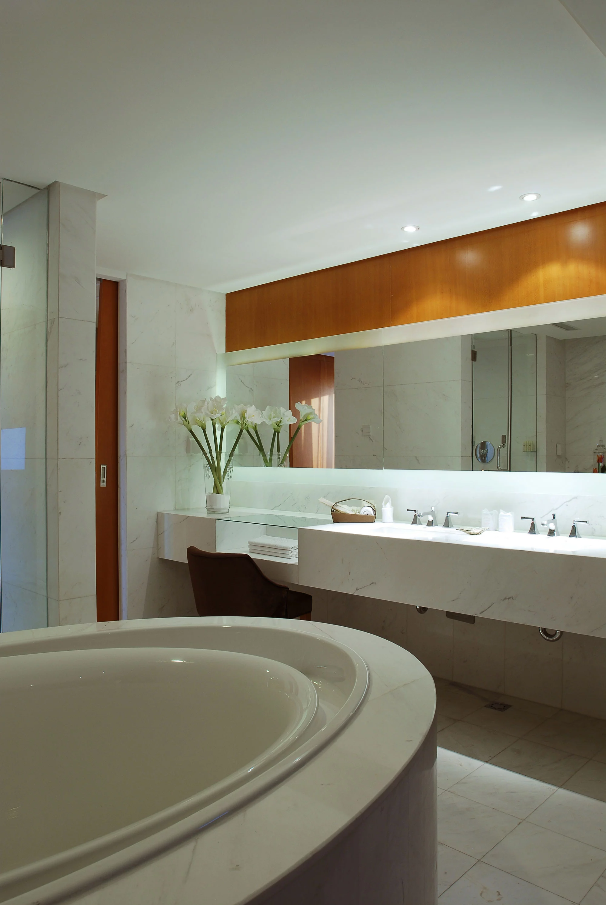 我们做了四个月的概念和初步扩充设计时,业主就急着开工了,这让我们好多设计工作措手不及。勘察和放线的过程更是问题百出。由于空间内的墙体是根据室内功能划分后建成的,所以细部的图纸是在墙体形成后完成。设计时间大量用在调整图纸和现场问题的解决上。好在我们几名设计师都有很强的责任心和丰富的现场经验,从异形的放样和材料的选择,到地面的放线、灯光的调配、洗浴设备的定型等,他们以专业的敬业精神化解出现的问题,减少失误,最终把这个工程完好的实现。