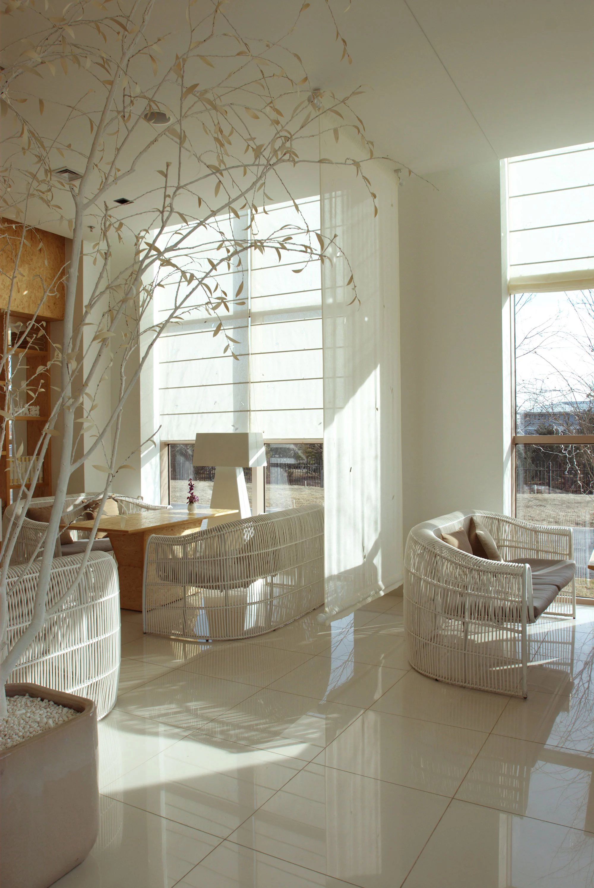 大型的游泳池和网球场的用地给平面布局带来了很多处理难点,经过多次推敲,最终的解决办法是把两个面积较大的空间叠在一起放置建筑中间,这样形成了一个回字形的平面布局,利用回形的交通路线串起各个服务空间。通过两端共享的空间,把自然光分享到地下游泳池两侧——这样使男女浴区的地下区域都有自然光线,而室外温泉则仰望着蓝天白云,相对合理的平面布局也解决了业主担心在将来经营中会面临人流量大的问题。